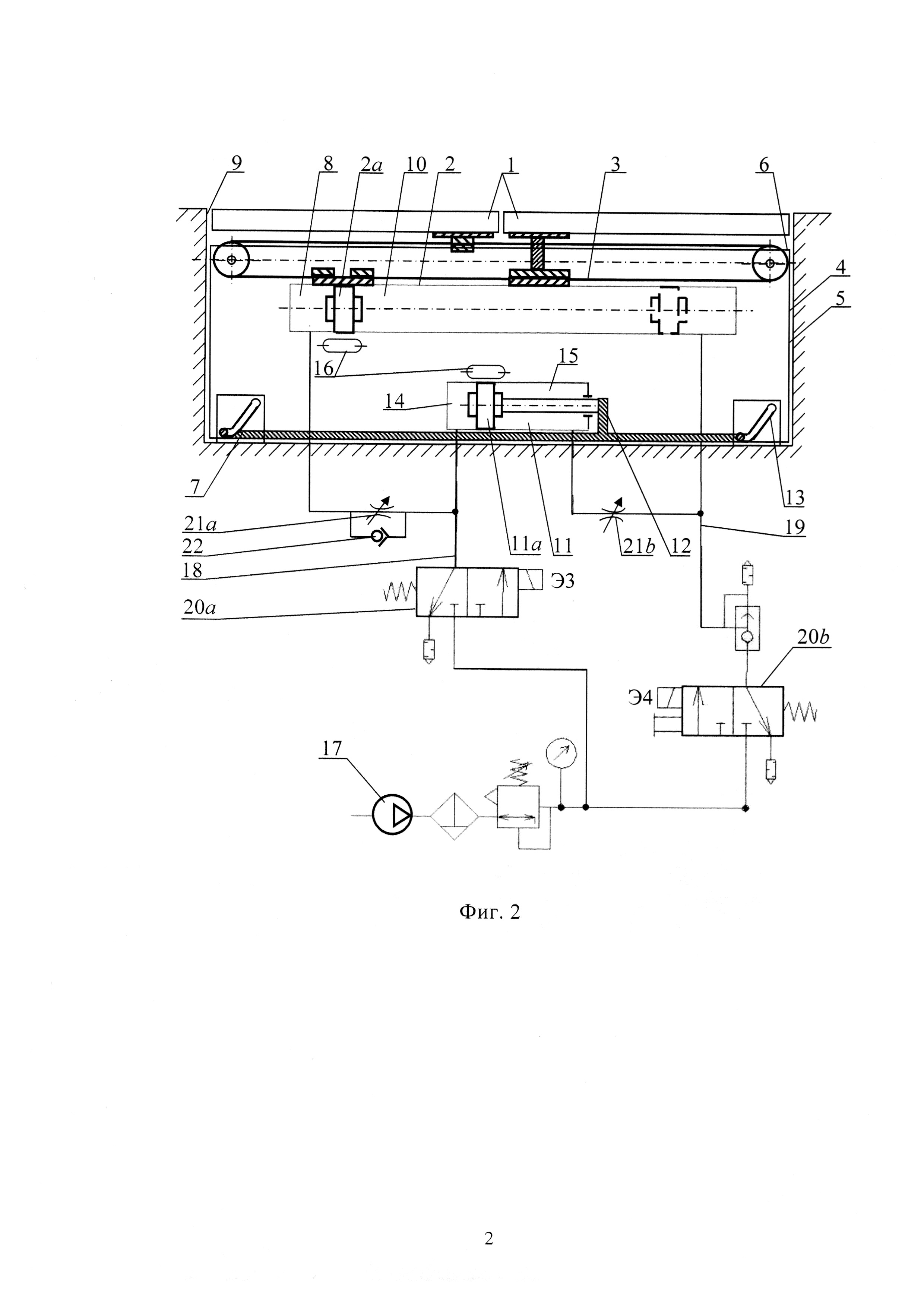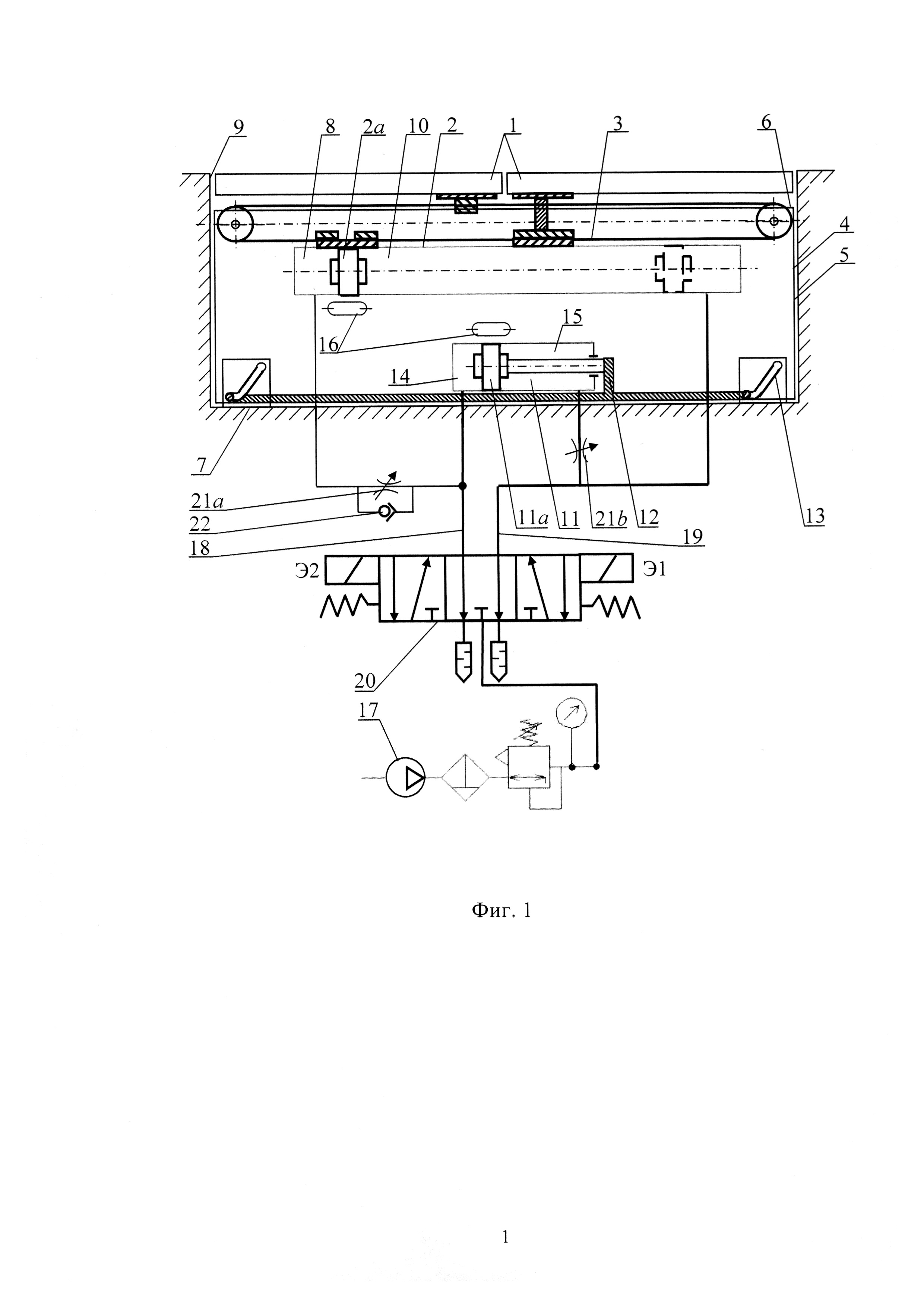 Изобретение относится к пневматическим системам открывания прислонно-сдвижных дверей транспортных средств, а именно пассажирских вагонов электропоездов. Известна система управления открытием и закрытием двухстворчатой двери автобуса (патент KR №100260178 от 30.12.1995), каждая из створок которой приводится пневматическим цилиндром со штоком, имеющая - источник сжатого воздуха; - первую пневмолинию, соединяющую источник сжатого воздуха с поршневыми полостями пневмоцилиндра, и вторую пневмолинию, соединяющую источник сжатого воздуха со штоковыми полостями пневмоцилиндра; - два электропневматических двухпозиционных распределителя, каждый из которых встроен в одну из пневмолиний; - регулируемые дроссели, установленные в пневмолиниях между электропневматическими распределителями и полостями пневмоцилиндра. Известен пневматический привод раздвижной двери (патент RU №93342 от 15.07.2009 г.), состоящий из двух цилиндров, каждый из которых приводит одну створку двери, имеющий систему управления (схема на фиг. 6), а также источник сжатого воздуха; первую пневмолинию, соединяющую источник сжатого воздуха с поршневыми полостями пневмоцилиндра, и вторую пневмолинию, соединяющую источник сжатого воздуха со штоковыми полостями пневмоцилиндра; регулируемые дроссели, установленные в пневмолиниях, подводящих воздух к полостям пневмоцилиндра. Недостаток данных систем управления в том, что они управляют двумя пневмоцилиндрами пневматического привода, каждый из которых перемещает одну створку двери. Техническая задача, решаемая изобретением, - создание системы управления пневматическим приводом прислонно-сдвижной двери, позволяющей осуществлять выдвижение двери из проема пассажирского вагона, открытие двери и последующее закрытие двери с исключением возможности открытия двери при движении поезда. Техническая задача решена в системе управления пневматическим приводом прислонно-сдвижной двери, состоящим из первого пневмоцилиндра привода цепи механизма открытия прислонно-сдвижной двери, установленного на силовом блоке двери, состоящем из подвижного блока, выдвигаемого из дверного проема, и основания блока, первый пневмоцилиндр имеет полость открытия двери и полость закрытия двери; второго пневмоцилиндра, соединенного с механизмом выдвижения подвижного блока, имеющего полость выдвижения подвижного блока и полость возврата подвижного блока; датчики положения поршней пневмоцилиндра. Система управления пневматическим приводом имеет: - источник сжатого воздуха; - первую и вторую пневмолинии, соединяющие источник сжатого воздуха с каждой из полостей пневмоцилиндра привода цепи и пневмоцилиндра механизма выдвижения подвижного блока; - по меньшей мере один электропневматический распределитель; - регулируемые дроссели, установленные в пневмолиниях между электропневматическим распределителем и полостями пневмоцилиндра, при этом пневмолиния, соединяющая полость открытия дверей пневмоцилиндра привода цепи с электропневматическим распределителем, соединена с полостью выдвижения подвижного блока, а пневмолиния, соединяющая полость закрытия дверей пневмоцилиндра привода цепи с электропневматическим распределителем, соединена с полостью возврата подвижного блока пневмоцилиндра механизма выдвижения подвижного блока. Для уск