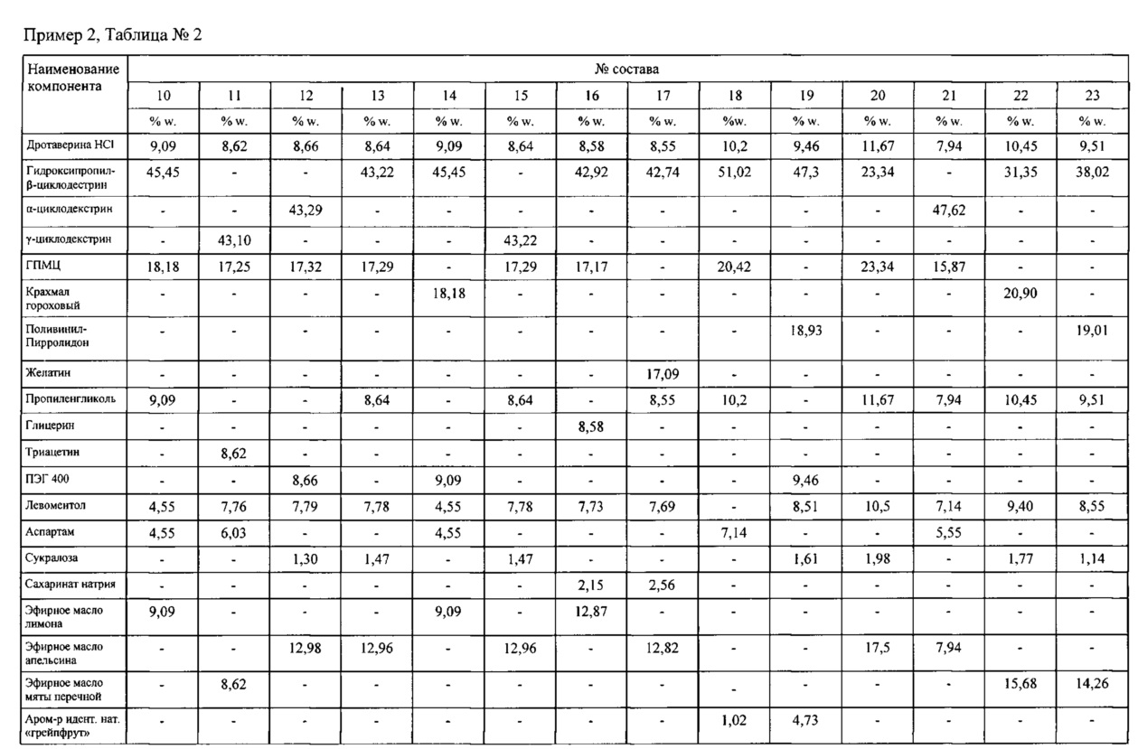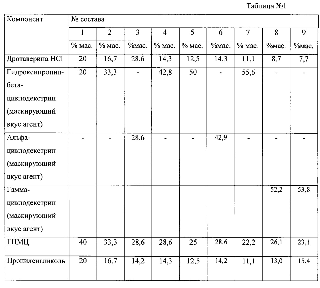 Область техники, к которой относится изобретение Изобретение относится к химико-фармацевтической промышленности, а именно к созданию трансмукозального фармацевтического препарата, обладающего спазмолитическим действием. Уровень техники В настоящее время известен широкий ряд спазмолитических препаратов, одним из представителей которых является дротаверина гидрохлорид (Но-шпа®). По фармакологическим свойствам дротаверин весьма близок к папаверину, но обладает более выраженным и более продолжительным фармакологическим действием. Применяют при спазмах желудка и кишечника, спастических запорах, приступах желче- и мочекаменной болезни (колики), холециститах, холангитах. Может также применяться как вспомогательное средство при гипертонических кризах, головной боли (Машковский М.Д. Лекарственные средства. М., 2000, том 1, стр. 397). В отличие от многих обезболивающих препаратов, Но-шпа® воздействует непосредственно на ферменты, влияющие на расслабление гладких мышц. Тем самым спазм, являющийся причиной боли, снимается. Клинически доказано, что частота побочных явлений при приеме Но-шпа® составляет менее 1% за период ее применения с 1964 года. Это один из лучших на данный момент показателей среди лекарственных препаратов группы спазмолитиков. На сегодняшний день Но-шпа® входит в десятку самых востребованных на нашем рынке лекарственных препаратов. Среди современных форм препараты для перорального применения (таблетки, капсулы, растворы и др.) являются наиболее распространенной и предпочтительной группой, так как обеспечивают терапевтический эффект за счет всасывания в желудочно-кишечном тракте (ЖКТ) и удобны при применении. Примеры таких препаратов раскрыты, например, в патенте RU 2183119 С1, опубл. 10.06.2002, где раскрыта фармацевтическая композиция в форме таблетки, обладающая спазмолитической активностью, содержащая дротаверин в виде его хлористоводородной соли и целевые добавки - лактозу, крахмал картофельный, кросповидон, тальк, стеарат кальция. В патенте ЕА 022944 В1, опубл. 2016.03.31, раскрыта фармацевтическая композиция для перорального введения, включающая 5-30% (м/м) дротаверина гидрохлорида, не менее 60% (м/м) жидкой смеси неионного гидрофильного поверхностно-активного вещества и неионного гидрофобного поверхностно-активного вещества. Композиция имеет форму мягкой капсулы, твердой капсулы, капсулы из двух частей или таблетки. В патенте RU 2232018 С2, опубл. 10.07.2004, раскрыто спазмолитическое лекарственное средство в форме таблетки, содержащее дротаверина гидрохлорид, инертный фармацевтический наполнитель, связующее, стеариновую кислоту и/или ее соль, 0,004-1,4 мас. % неорганической кислоты. Однако данные способы доставки активных субстанций не лишены недостатков: во-первых, пероральный прием неэффективен для лекарственных препаратов, плохо всасывающихся или разрушающихся в ЖКТ и образующих неактивные метаболиты при прохождении через печень или оказывающих выраженное раздражающее действие; во-вторых, пероральный прием затруднен или невозможен при рвоте, в бессознательном состоянии больного; в-третьих, на биодоступность пероральных препаратов оказывают влияние прием пищи и других лекарственных препаратов, а также состояние органов ЖКТ. Таким образом, на современном этапе развития фармацевтической науки актуально внедрение иннова