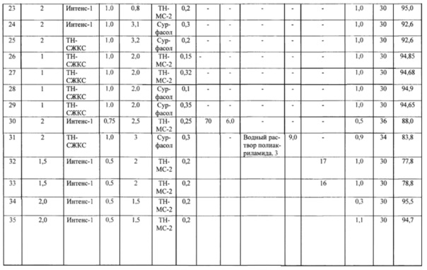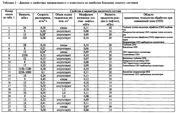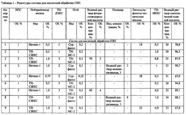 1. Состав для кислотной обработки прискважинной зоны пласта, содержащий водный раствор соляной кислоты, нейтрализатор железа, поверхностно-активное вещество - ПАВ, деэмульгатор водорастворимый, изопропиловый спирт, отличающийся тем, что состав дополнительно содержит ингибитор кислотной коррозии ТН-ИККС, в качестве водного раствора соляной кислоты - водный раствор синтетической соляной кислоты 30-36%-ной концентрации, в качестве нейтрализатора железа - Интенс-1 или ТН-СЖКС, в качестве ПАВ - Сурфасол или ТН-МС-2, в качестве деэмульгатора водорастворимого - ТН-ДЭКС при следующем соотношении ингредиентов, об.%: 2. Состав для кислотной обработки прискважинной зоны пласта, содержащий водный раствор соляной кислоты, нейтрализатор железа, поверхностно-активное вещество - ПАВ, деэмульгатор водорастворимый, изопропиловый спирт, отличающийся тем, что состав дополнительно содержит ингибитор кислотной коррозии ТН-ИККС, лигносульфонаты технические жидкие, в качестве водного раствора соляной кислоты содержит водный раствор синтетической соляной кислоты 30-36%-ной концентрации, в качестве нейтрализатора железа - Интенс-1 или ТН-СЖКС, в качестве ПАВ - Сурфасол или ТН-МС-2, в качестве деэмульгатора водорастворимого - ТН-ДЭКС при следующем соотношении ингредиентов, об.%: 3. Состав для кислотной обработки прискважинной зоны пласта, содержащий водный раствор соляной кислоты, нейтрализатор железа, поверхностно-активное вещество - ПАВ, деэмульгатор водорастворимый, изопропиловый спирт, отличающийся тем, что состав дополнительно содержит ингибитор кислотной коррозии ТН-ИККС, водный раствор фтористоводородной кислоты 40-70%-ной концентрации, в качестве водного раствора соляной кислоты содержит водный раствор синтетической соляной кислоты 30-36%-ной концентрации, в качестве нейтрализатора железа - Интенс-1 или ТН-СЖКС, в качестве ПАВ - Сурфасол или ТН-МС-2, в качестве деэмульгатора водорастворимого - ТН-ДЭКС при следующем соотношении ингредиентов, об.%: 4. Состав для кислотной обработки прискважинной зоны пласта, содержащий водный раствор соляной кислоты, нейтрализатор железа, поверхностно-активное вещество - ПАВ, деэмульгатор водорастворимый, изопропиловый спирт, отличающийся тем, что состав дополнительно содержит ингибитор кислотной коррозии ТН-ИККС, полимер, в качестве которого используют водный раствор полиакриламида 3-5%-ной концентрации или водный раствор модифицированного крахмала 3-5%-ной концентрации, в качестве водного раствора соляной кислоты - водный раствор синтетической соляной кислоты 30-36%-ной концентрации, в качестве нейтрализатора железа - Интенс-1 или ТН-СЖКС, в качестве ПАВ - Сурфасол или ТН-МС-2, в качестве деэмульгатора водорастворимого - ТН-ДЭКС при следующем соотношении ингредиентов, об.%:Интенс-1 или ТН-СЖКС 0,5-1,0 ТН-ДЭКС 1-3 Сурфасол или ТН-МС-2 0,2-0,3 ТН-ИККС 0,5-1 изопропиловый спирт 1-2 водный раствор синтетической соляной кислоты 30-36%-ной концентрации остальное. Интенс-1 или ТН-СЖКС 0,5-1,0 ТН-ДЭКС 1-3 Сурфасол или ТН-МС-2 0,2-0,3 ТН-ИККС 0,5-1 изопропиловый спирт 1-2 лигносульфонаты технические жидкие 18-28 водный раствор синтетической соляной кислоты 30-36%-ной концентрации остальное. Интенс-1 или ТН-СЖКС 0,5-1,0 ТН-ДЭКС 13 Сурфасол или ТН-МС-2 0,2-0,3 ТН-ИККС 0,5-1 изопропиловый спирт 1-2 водный раствор фтористоводородной кислоты 40-70%-ной концентрации 3-5 водный раствор
