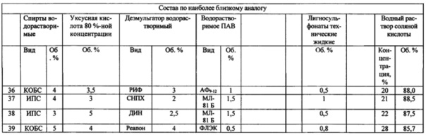 Предложение относится к области нефтедобычи, в частности к составам для кислотной обработки пластов, и может быть использовано для химического растворения пород и кольматирующих отложений в прискважинной зоне нефтяного, газового и газоконденсатного пласта, а также в качестве технологической жидкости при перфорации и гидроразрыве пластов. Известен состав для кислотной обработки призабойной зоны пласта (патент RU №2013530, МПК Е21В 43/27, опубл. 30.05.1994 в бюл. №10), содержащий водный раствор соляной кислоты 15-18%-ной концентрации, технические лигносульфонаты и водорастворимые алифатические спирты, или гликоли, или глицерин при следующем соотношении ингредиентов, об. %: Известный состав обладает в 13,7-32,7 раза более низкой скоростью реакции в отношении карбонатов, стабилизирует отработанный кислотный раствор в отношении трехвалентного железа, имеет в 2,1-13 раз более высокие значения по вязкости по сравнению с традиционными кислотными составами. Недостатками данного состава являются: 1. Узкий диапазон изменения скорости реакции и вязкости состава, что ограничивает область его применения. 2. Недостаточная степень нейтрализации ионов трехвалентного железа с учетом очень большого содержания этого элемента в колонне насосно-компрессорных труб, по которой состав для кислотной обработки призабойной зоны пласта закачивается в пласт. Кроме этого, кислота дополнительно насыщается ионами железа при реакциях с породой пластов. 3. Возможность образования в пласте закупоривающих поры эмульсий прямого и обратного типов. Наиболее близким аналогом является состав для кислотной обработки призабойной зоны пласта (патент RU №2308475, МПК С09К 8/74, опубл. 20.10.2007 в бюл. №29). Состав включает водный раствор соляной кислоты, нейтрализатор железа - уксусную кислоту 80%-ной концентрации, поверхностно-активное вещество (ПАВ), деэмульгатор водорастворимый, изопропиловый спирт (ИПС) или кубовые остатки бутиловых спиртов (КОБС), лигносульфонаты технические при следующем соотношении ингредиентов, об. %: Состав обладает улучшенными физико-химическими и технологическими свойствами и параметрами по растворению карбонатной породы, по динамической вязкости, ингибированию осаждения осадков и эмульсиеобразования. Недостатки данного состава: 1. Недостаточная степень нейтрализации ионов трехвалентного железа, как следствие, дисперсный гидроксид железа выпадает в норовом пространстве пласта и закупоривает фильтрационные каналы. Нейтрализующая способность состава, включающего лигносульфонаты технические и уксусную кислоту, недостаточна для предотвращения этого негативного явления. Кроме этого, уксусная кислота имеет высокую стоимость и увеличивает затраты на приготовление и применение известного состава. 2. Деэмульгирующий компонент известного состава не обеспечивает полного исключения образования высоковязких кольматирующих смесей и эмульсий при контакте состава с нативной нефтью. 3. Недостаточная способность выноса продуктов реакций из пластов после обработки, как следствие, конечная эффективность обработки снижается. ПАВ, применяемые в данном составе, недостаточно эффективны для полного удаления продуктов реакции из пласта при освоении. Для повышения эффективности обработки пласта необходимо обеспечить снижение поверхностного межфазного натяжения 