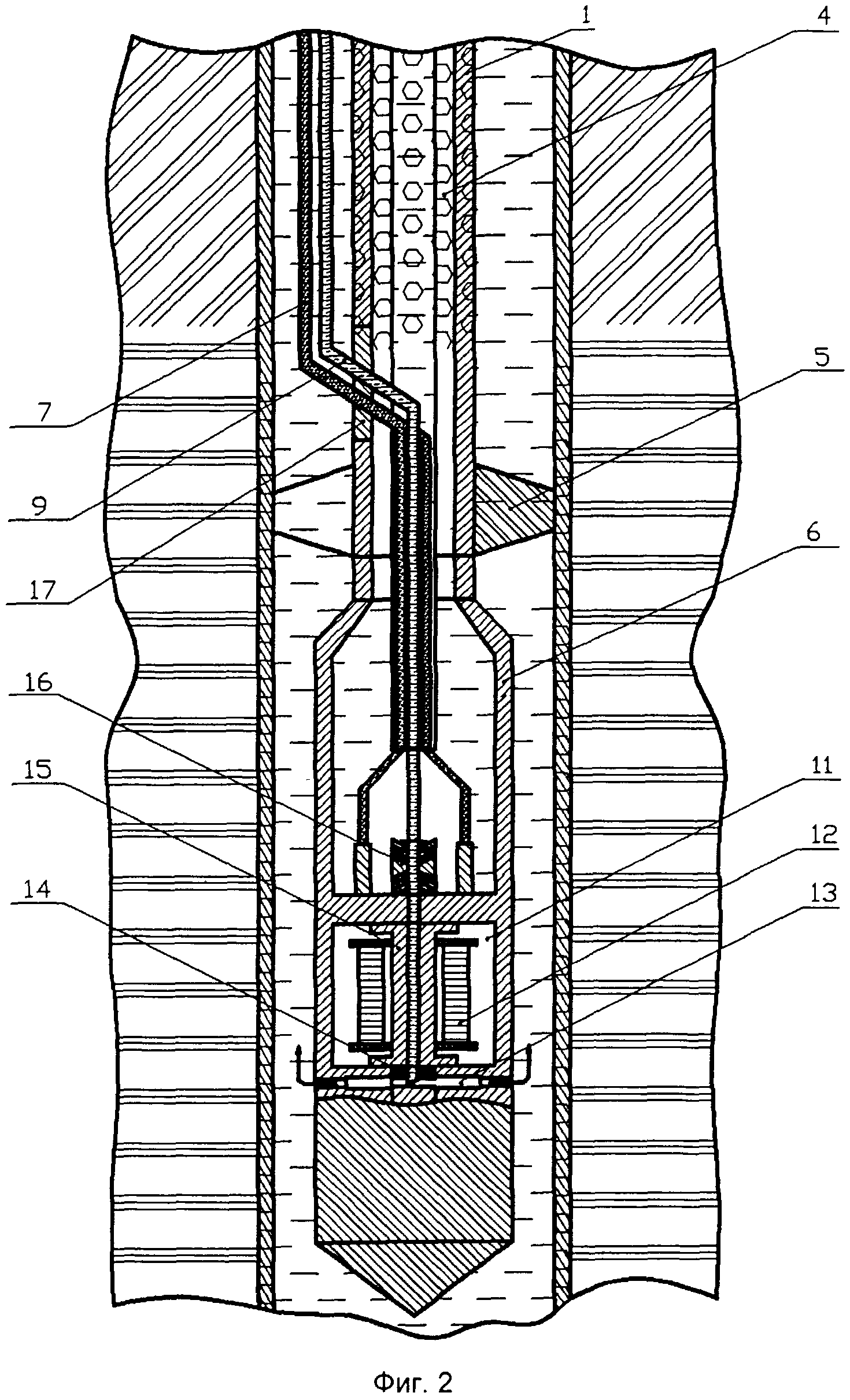 1. Комплекс оборудования для добычи высоковязкой нефти, содержащий насосно-компрессорную трубу с размещенным внутри нее приводом нефтяного насоса и последовательно смонтированную на ней компоновку из нефтяного насоса, перфорированного участка трубы с якорем насоса и скважинного аппарата, выполненного в виде цилиндрического корпуса, в котором последовательно расположены герметичная полость и кольцевая камера с радиальными каналами в его корпусе, в герметичной полости размещен источник упругих колебаний высокой частоты, выполненный в виде ультразвукового преобразователя кольцевой формы, герметичная полость по оси компоновки снабжена стяжкой, имеющей внутренний сквозной канал, ведущий в кольцевую камеру, скважинный аппарат электрическим кабелем соединен с наземным источником электропитания, при этом комплекс дополнен снабженной наземным насосом линией подачи жидкого химического реагента через внутренний канал стяжки герметичной полости в кольцевую камеру, а перфорированный участок трубы между нефтяным насосом и якорем насоса снабжен отверстием для подвода кабеля электропитания и линии подачи химического реагента. 2. Комплекс по п.1, отличающийся тем, что подвод линии подачи жидкого химического реагента к внутреннему каналу стяжки загерметизирован манжетами. 3. Комплекс по п.1, отличающийся тем, что соединение стяжки полости и придонной кольцевой камеры загерметизировано кольцевыми уплотнителями. 4. Комплекс по п.1, отличающийся тем, что герметичная полость скважинного прибора заполнена жидкой электроизолирующей средой, преимущественно термостойкой кремнийорганической жидкостью.