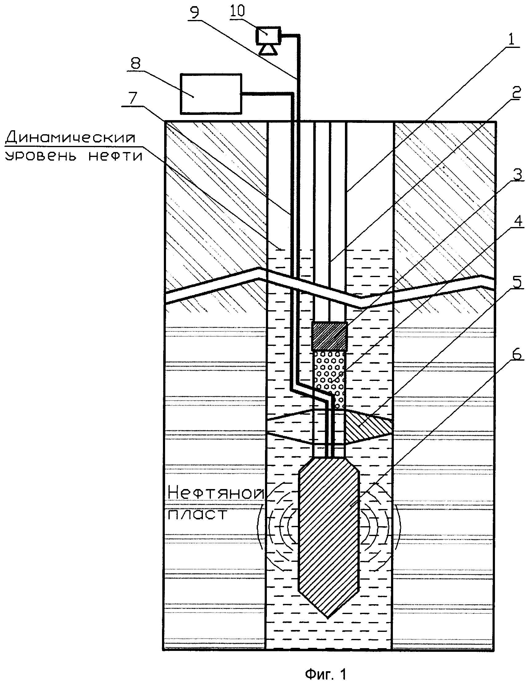 Изобретение относится к области нефтедобычи, в частности к добыче высоковязкой нефти с использованием энергии упругих колебаний, повышению эффективности ультразвуковой обработки за счет интенсификации дополнительного химического воздействия на нефть в обсадной трубе, и может быть реализовано при выполнении работ в условиях низких климатических температур. Использование изобретения обеспечивает как добычу высоковязкой нефти, так и ее транспортировку к магистральным трубопроводам. Основными методами освоения вязких нефтей являются термические, газовые, химические и физические с помощью которых, например, в 2000 г. в мире добывалось 122 млн т тяжелой и битуминозной нефти. На практике реологические характеристики высоковязкой нефти обычно снижают разбавлением более легкими растворителями, нефтью, газоконденсатом. Основной причиной аномальной вязкости тяжелых нефтей и природных битумов считается высокое содержание в них смолисто-асфальтеновых компонентов (САК), при достижении критической концентрации которых наступает резкое изменение реологических свойств и начинают в значительной мере проявляться структурно-механические свойства, что объясняется межмолекулярными взаимодействиями САК [М.Ю.Доломатов, А.Г.Телин, Н.И.Хисамутдинов. Физико-химические основы направленного подбора растворителей асфальтосмолистых веществ // М.: ЦНИИТЭНефтехим. - 1991. - 47 с.]. Известен способ подготовки высоковязкой тяжелой нефти к транспорту [SU 1366772], который позволяет улучшить реологические свойства нефти путем обработки 0.01÷0.03%-ным спиртовым раствором щелочи при массовом соотношении нефти и раствора (100÷150):1 и термообработки при 40÷50°C. Кинематическая вязкость при этом снижается на 20÷30% за счет изменения молекулярной подвижности групповых компонентов нефтяных дисперсных систем. Недостатком способа является необходимость дополнительного оборудования для термообработки. Что касается обработки призабойной зоны добывающих скважин нефтяными растворителями [Зарипов И.З., Мустафин Г.Г., Юсупов И.Г., Горюнов В.А. Обработка призабойной зоны пласта нагретым растворителем // Нефтепромысловое дело. №9. С.8-9; Зарипов И.З., Сивухин А.А., Иванов А.И. Обработка призабойной зоны пластов добывающих скважин растворителем без подъема подземного оборудования // Нефтепромысловое дело. - 1981. №6. С.31-32], то, как правило, это приводит к внутрипластовой деасфальтизации нефтей, содержащих большое количество асфальтенов. Применение таких растворителей увеличивает также пожаро- и взрывоопасность при проведении промысловых работ. Известно устройство для добычи высоковязкой нефти [RU 2008133099], включающее колонну насосно-компрессорных труб, расположенную в перфорированной на уровне нефтеносного пласта эксплуатационной колонне, установленный внутри насосно-компрессорных труб скважинный насос, линию дозированной подачи маловязкого вещества в межтрубное пространство насосно-компрессорных труб и выпускную линию разбавленной нефти, обеспечивающую разбавление высоковязкой нефти. Недостатком устройства является относительно сложное аппаратурное оформление, заключающееся в том, что колонна насосно-компрессорных труб выполнена в виде двух концентрично расположенных колонн насосно-компрессорных труб, при этом на нижнем конце насосно-компрессорной трубы с большим