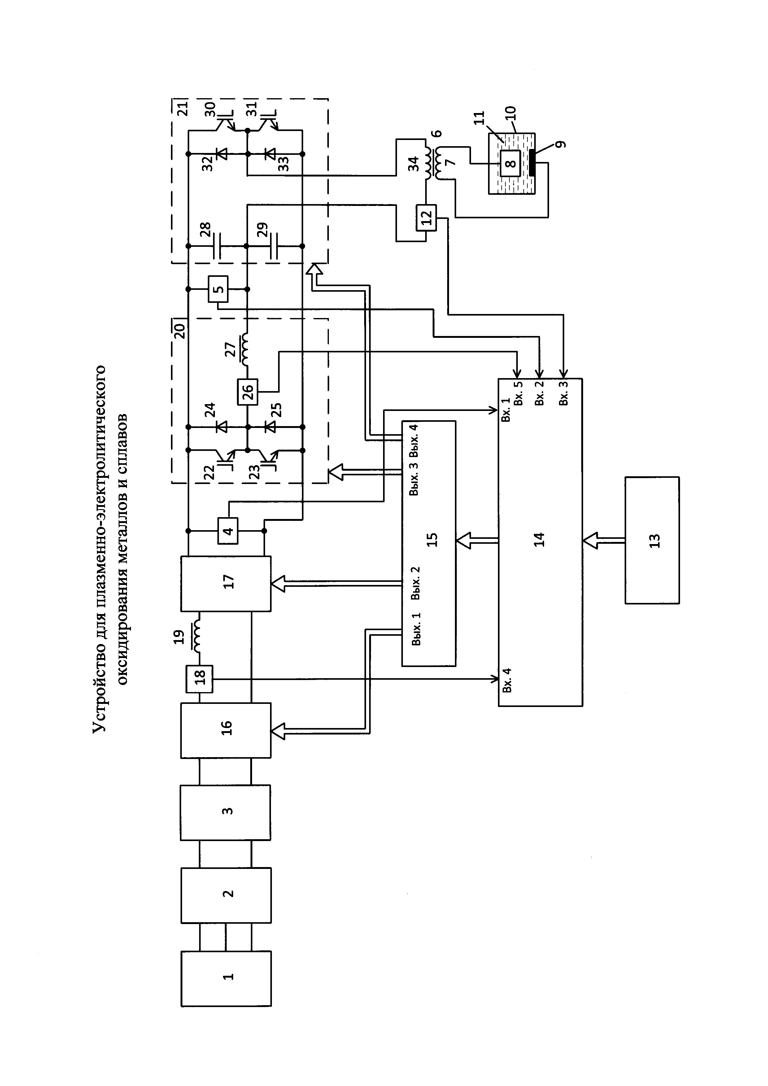 Устройство для плазменно-электролитического оксидирования металлов и сплавов, содержащее источник трехфазного переменного или постоянного напряжения, подключенного к трехфазному мостовому выпрямителю, выходы которого соединены с фильтром, первый и второй датчики напряжения, повышающий высокочастотный трансформатор, вторичная обмотка которого одним выходом подключена к обрабатываемой детали, а другим выходом к катодному электроду ванны, заполненной электролитом, первый датчик тока, компьютер, управляющий микроконтроллером, выходы которого подключены к входам блока драйверов, а первый, второй и третий входы - к информационным выходам датчиков напряжения и первого датчика тока, отличающееся тем, что оно дополнительно содержит понижающий и повышающий стабилизаторы напряжения, второй датчик тока, информационный выход которого подключен к четвертому входу микроконтроллера, первый дроссель, активный делитель напряжения и полумостовой инвертор напряжения, при этом силовые входы понижающего стабилизатора напряжения подключены к фильтру, а силовые выходы, один из которых напрямую, а другой - через второй датчик тока и первый дроссель, подключены к силовым входам повышающего стабилизатора напряжения, силовые выходы которого подключены к первому датчику напряжения, силовым входам активного делителя напряжения и полумостового инвертора напряжения, а информационные входы обоих стабилизаторов напряжения соединены соответственно с первым и вторым выходами блока драйверов, при этом активный делитель напряжения формирует амплитуды анодного и катодного напряжений и содержит два транзистора, шунтированных обратными диодами и включенных по полумостовой схеме, в точку соединения которых включены последовательно соединенные третий датчик тока, информационный выход которого подключен к пятому входу микроконтроллера, и второй дроссель, выход которого подключен к одному из выходов полумостового инвертора напряжения, образованному двумя последовательно включенными конденсаторами, к первому из которых подключен второй датчик напряжения, а другой выход полумостового инвертора напряжения образован двумя последовательно включенными транзисторами, шунтированными обратными диодами, и между выходами включены последовательно соединенные первый датчик тока и первичная обмотка повышающего высокочастотного трансформатора, при этом информационные входы активного делителя напряжения и полумостового инвертора напряжения соответственно подключены к третьему и четвертому выходам блока драйверов.