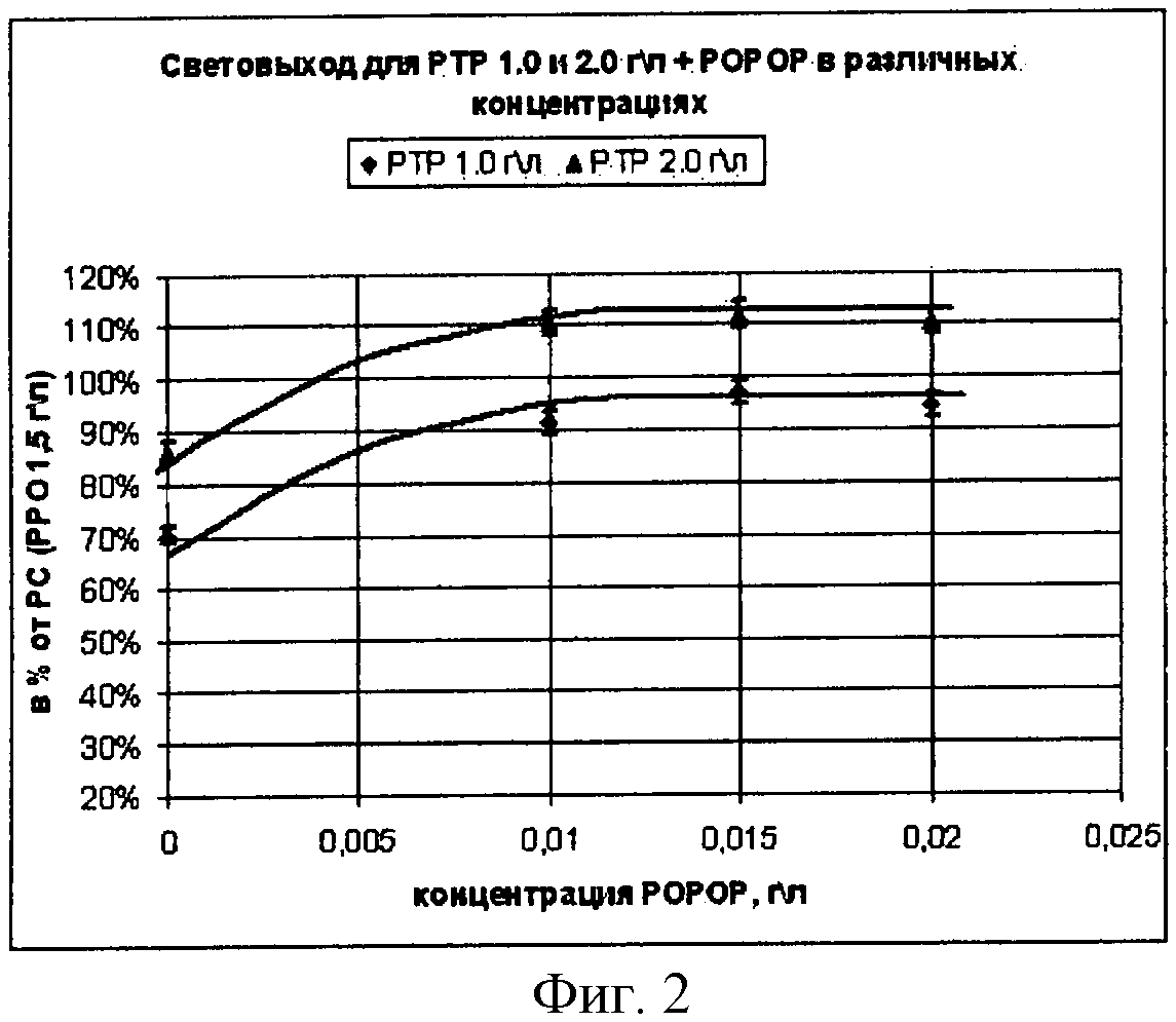 1. Жидкий органический сцинтиллятор, состоящий из активатора, сместителя спектра РОРОР и основы сцинтиллятора, отличающийся тем, что в качестве основы он содержит смесь синтетических углеводородов ароматического ряда - линейный алкилбензол с температурой вспышки насыщенных паров выше 150°С, прошедшую адсорбционную очистку, а в качестве активатора - паратерфенил (р-Тр). 2. Сцинтиллятор по п.1, отличающийся тем, что он содержит компоненты в следующем составе: линейный алкилбензол 1 л, паратерфенил (р-Тр) от 1,5 до 2 г/л, РОРОР от 0,010 до 0,020 г/л.