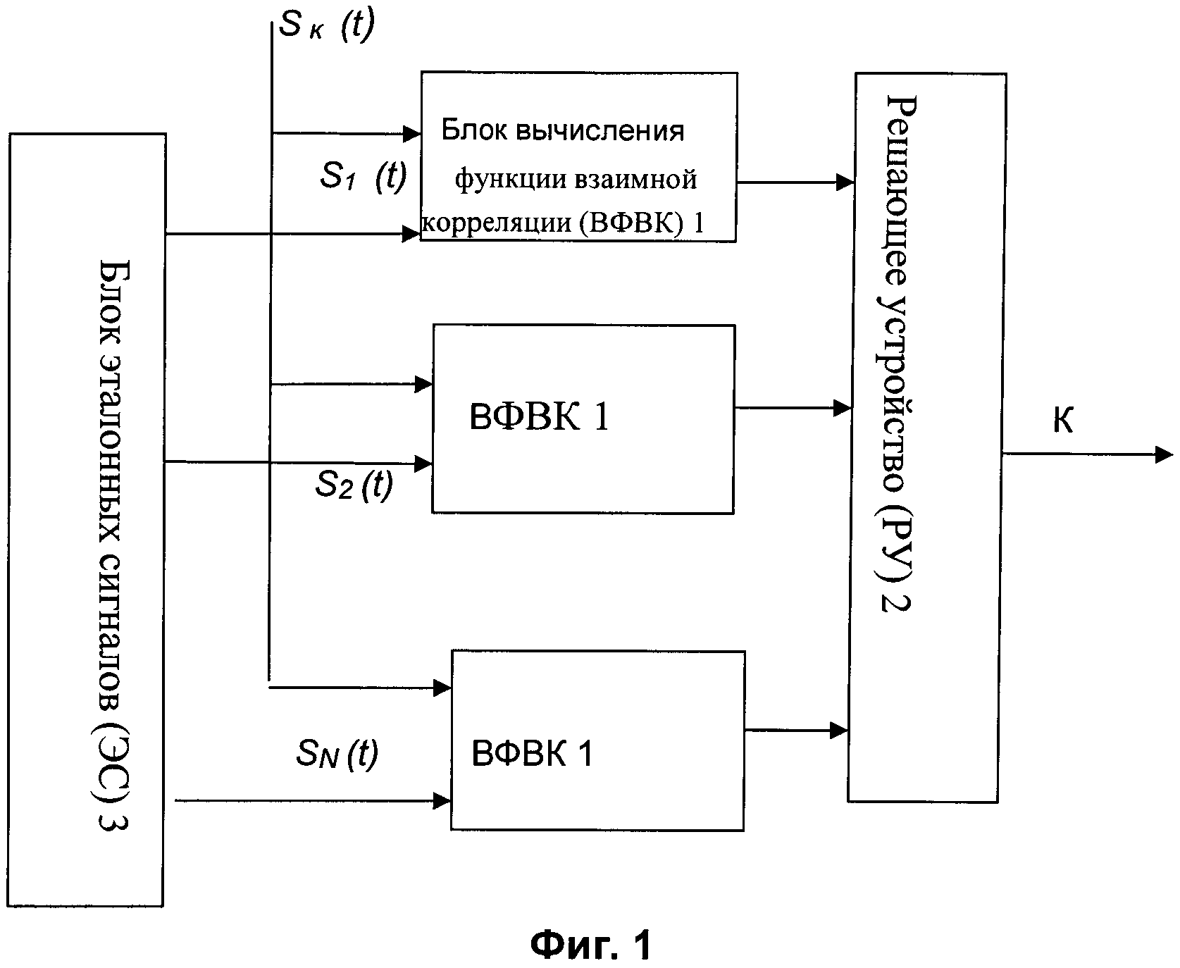 Заявляемые технические решения относятся к области радиолокации и могут быть использованы в радиолокационных станциях (РЛС) для защиты от импульсных, в том числе ответных, помех. Большие проблемы работе РЛС создают импульсные помехи со структурой, близкой к структуре зондирующего сигнала. Для постановщика помех импульсная помеха является наиболее энергетически выгодной. Частным случаем импульсных помех являются ответные помехи (Защита от радиопомех, под ред. М.В. Максимова, М. Сов. Радио, 1976 г, с. 60), которые излучают только после приема постановщиком ответной помехи (ПОП) зондирующего сигнала, и импульсные помехи, которые излучают независимо от приема зондирующего сигнала на основе ранее разведанных параметров РЛС. В результате действия импульсных помех происходят ложные обнаружения целей, так как принятые сигналы таких помех не отличаются по структуре от сигналов, отраженных от реальных целей. Высокая эффективность импульсной и, в частности, ответной помехи достигается тем, что постановщик помехи излучает усиленную копию зондирующего сигнала независимо от его уровня. Это при радиолокационном обзоре пространства обеспечивает ее обнаружение не только в главном луче, но и по боковым лепесткам диаграммы направленности антенны (ДНА), в результате чего во всей зоне обзора создается большое число ложных целей, хаотических или неподвижных, в простейшем случае, либо движущихся с установленной постановщиком помехи скоростью. Во всех случаях ложные цели воспринимаются как реальные, поэтому по ним выполняют захват и завязку трассы (С.З. Кузьмин - Основы проектирования систем цифровой обработки радиолокационной информации, с. 109) с последующим ее сбросом в случае ложных целей, формируемых несинхронной импульсной помехой. В результате ответная помеха приводит к перегрузке устройств обработки сигнала и сопровождения трасс целей. Наиболее сложной является задача выделения реальных целей, маскируемых ложными, при действии ответной помехи в главном луче ДНА. Известны способы защиты от помех, которые обеспечивают подавление помех в главном луче ДНА однопозиционной РЛС за счет применения АРУ, ограничения или компенсации (Теоретические основы радиолокации, под редакцией Я.Д. Ширмана, Сов. Радио, М. 1978 г, с. 298-302, 346-347), а также диаграммообразующие (патент RU 2291459 от 01.2006 г.). Недостаток известных способов защиты от помех состоит в том, что в случае действия помехи с высоким уровнем мощности они не обеспечивают подавления помехи, поскольку она по своей структуре не отличается от сигналов, отраженных от реальных целей, а по уровню может значительно превосходить уровень этих сигналов. Таким образом, известные способы защиты РЛС не обеспечивают подавление импульсных и ответных помех, имитирующих цель. Но исключить перегрузку устройств обработки и сопровождения трасс целей можно и без подавления помехи, если ее распознать. Известен наиболее близкий способ различения (распознавания) сигналов (В.Н. Исаков. Статистическая теория радиотехнических систем - курс лекций. гл. 5.1, с. 1, 2), основанный на взаимокорреляционной обработке принимаемых сигналов с известными эталонными и определении типа сигнала с максимальным коэффициентом корреляции. Известно наиболее близкое устройство различения (распознавания) (там же с. 1) (Фиг. 1), содержащее N блоков
