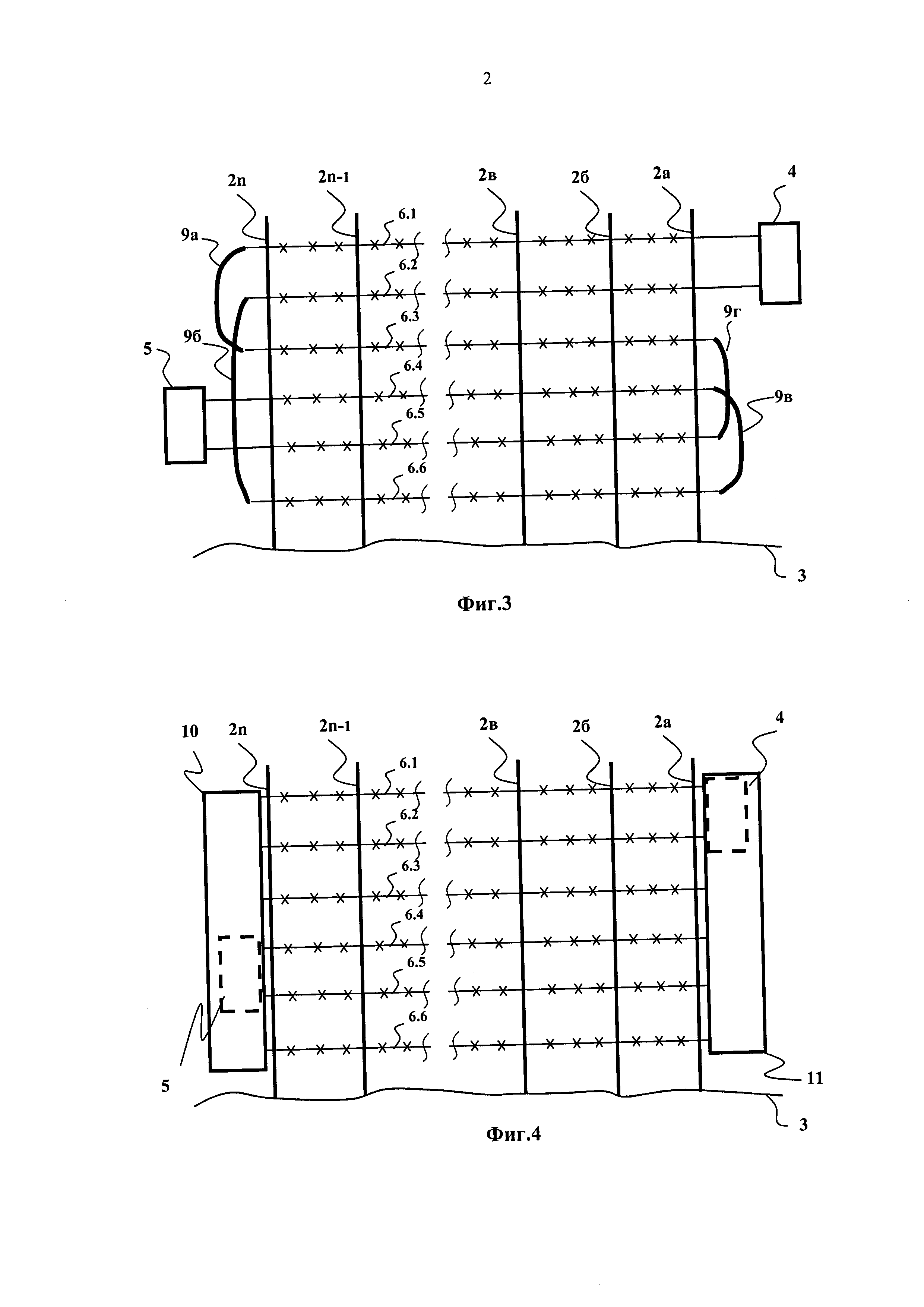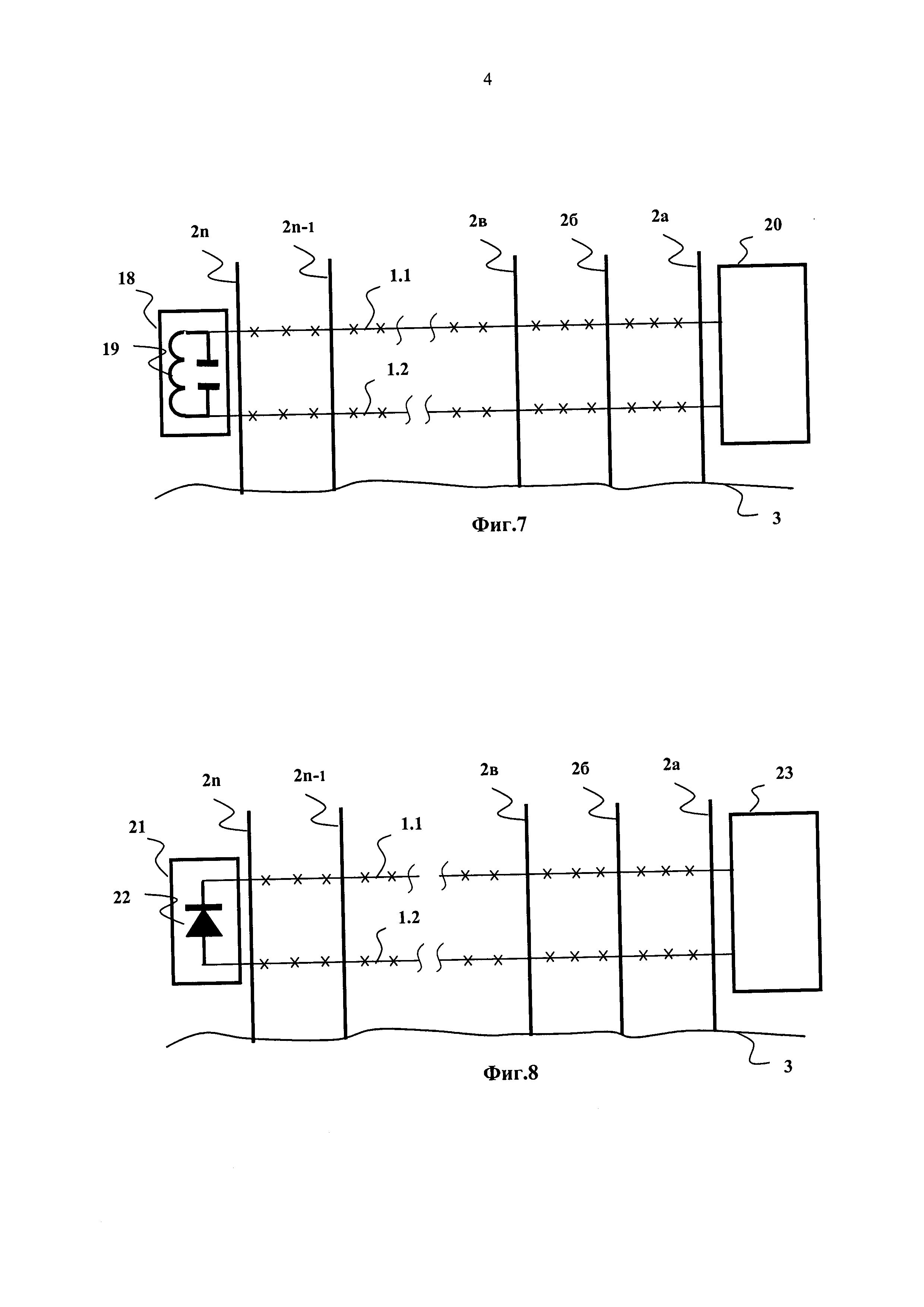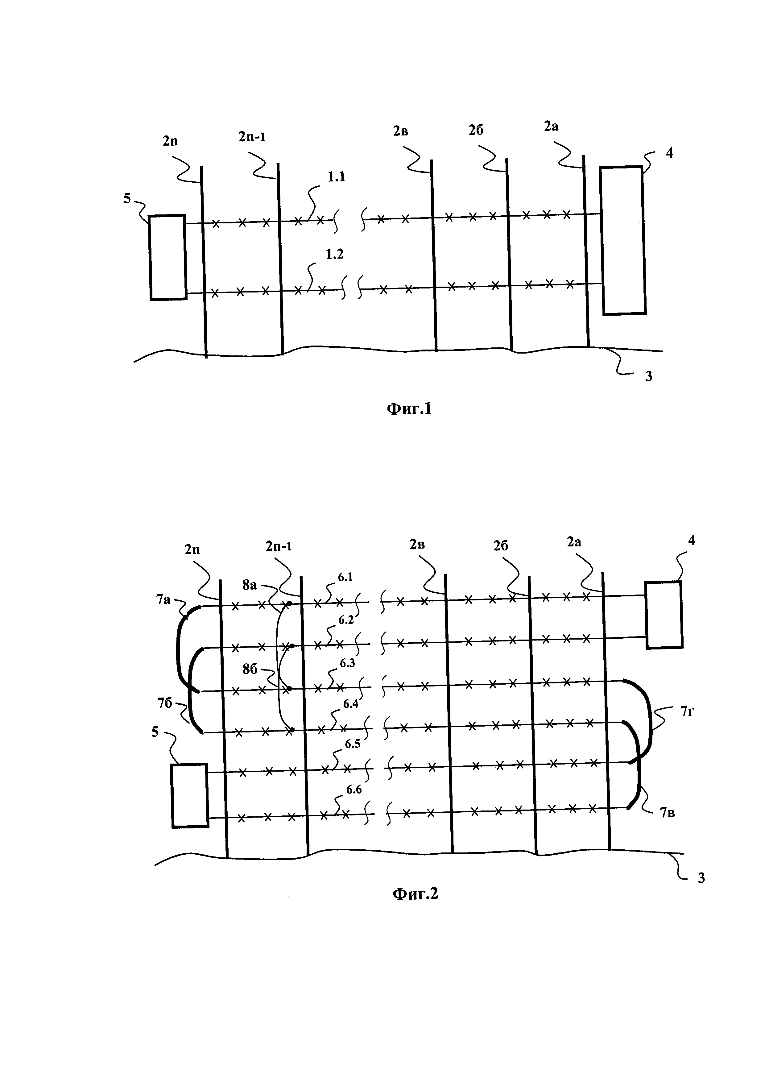 Изобретение относится к средствам обнаружения, использующимся для инженерных защитных сооружений, а именно для проволочных сигнализационных заграждений, используемых для создания охраняемого периметра защитной территории от несанкционированного доступа физических лиц, техники, животных и т.п., и может быть использовано как при охране локальных территорий (предприятий, военных баз или экологически опасных объектов и т.д.), так и протяженных участков, например, государственной границы. Заявляется проволочное сигнализационное заграждение, содержащее проводную линию, размещенную вдоль охранного ограждения (забора) и закрепленную на столбах ограждения последовательно между первым и последним столбами, при этом на одной из сторон проводной линии установлен параметрический измеритель. Новым является то, что на противоположном от установки параметрического измерителя конце линии, за последним столбом ограждения, установлен параметрический ответчик, подключенный к линии, ответный сигнал которого совпадает с форматом сигнала, измеряемого параметрическим измерителем. Техническим результатом является устранение недостатков известного из прототипа устройства, связанного с охранной функцией, при сохранении простоты его конструкции. 2 з.п. ф-лы, 8 ил.