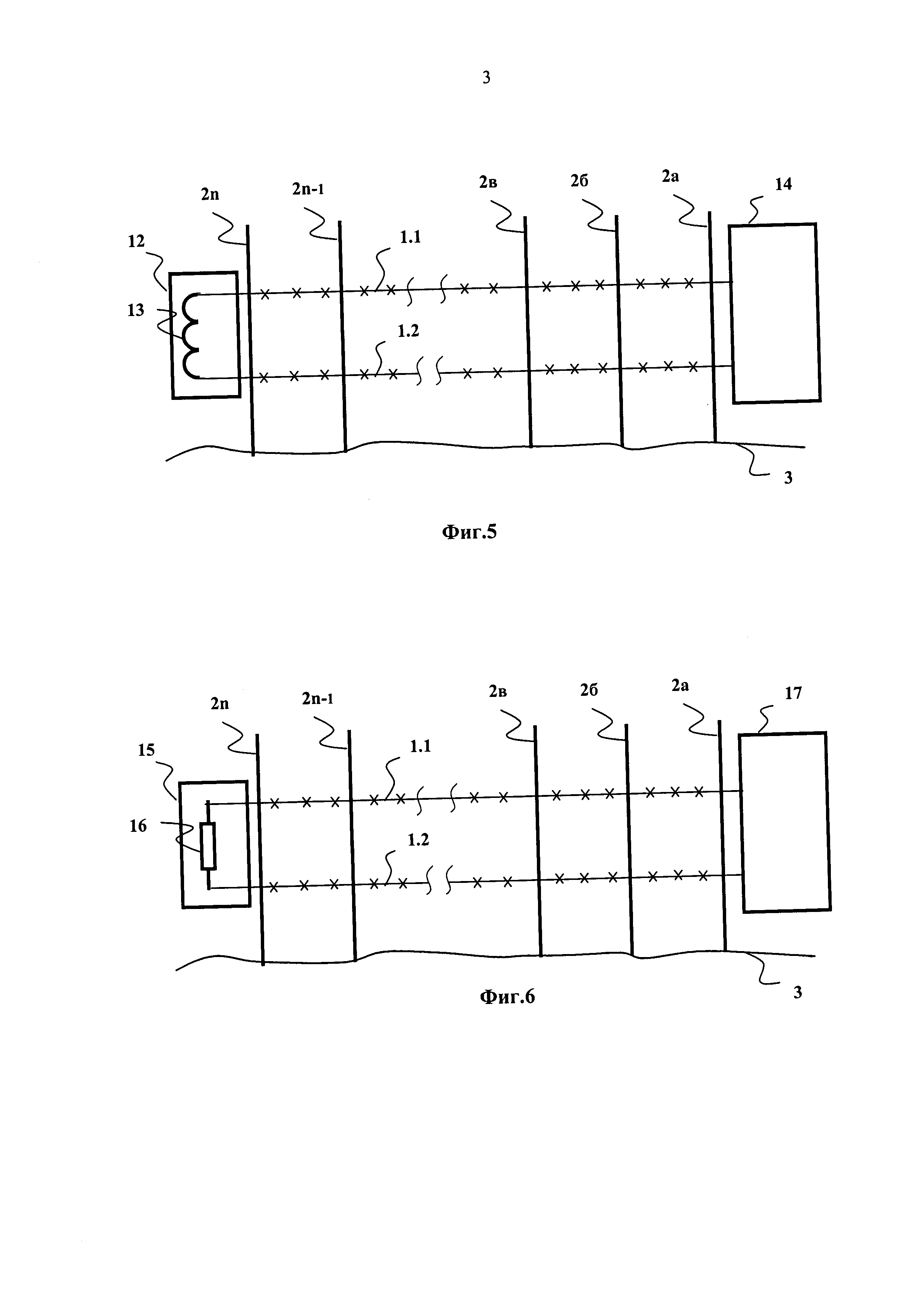 1. Проволочное сигнализационное заграждение, содержащее проводную линию, размещенную вдоль охранного ограждения (забора) и закрепленную на столбах ограждения последовательно между первым и последним столбами, при этом на одной из сторон проводной линии установлен параметрический измеритель, отличающееся тем, что на противоположном от установки параметрического измерителя конце линии, за последним столбом ограждения, установлен параметрический ответчик, подключенный к линии, ответный сигнал которого совпадает с форматом сигнала, измеряемого параметрическим измерителем. 2. Устройство по п. 1, отличающееся тем, что линия выполнена в виде нескольких параллельно идущих и последовательно соединенных отрезков линий, расположенных между первым и последним столбами охранного ограждения, при этом параметрический ответчик выполнен в виде пассивного двухполюсника. 3. Устройство по п. 1, отличающееся тем, что линия выполнена в виде нескольких параллельно идущих и последовательно соединенных отрезков линий, расположенных между первым и последним столбами охранного ограждения, при этом параметрический ответчик выполнен в виде активного двухполюсника.