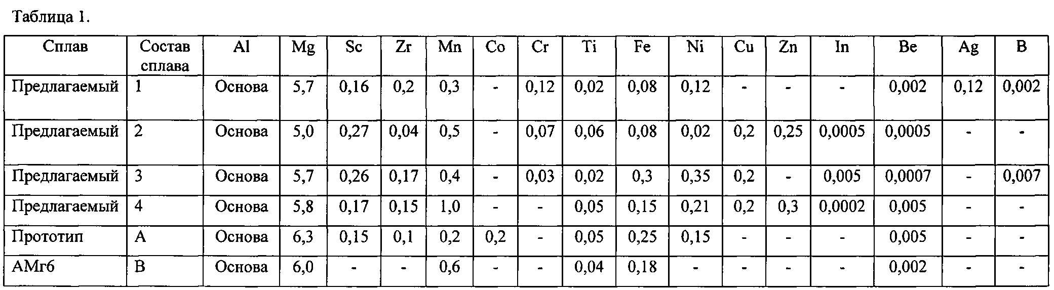 магний 5,0-5,8 скандий 0,15-0,28 никель 0,02-0,7 цирконий 0,05-0,2 марганец 0,2-1,0 бериллий 0,0001-0,005 индий до 0,005 железо 0,02-0,3 по крайней мере, один элемент из группы, содержащей серебро, медь, цинк 0,01-0,8 по крайней мере, один элемент из группы, содержащей ванадий, хром, титан 0,01-0,12 бор, углерод 0,0001-0,05 алюминий остальное.