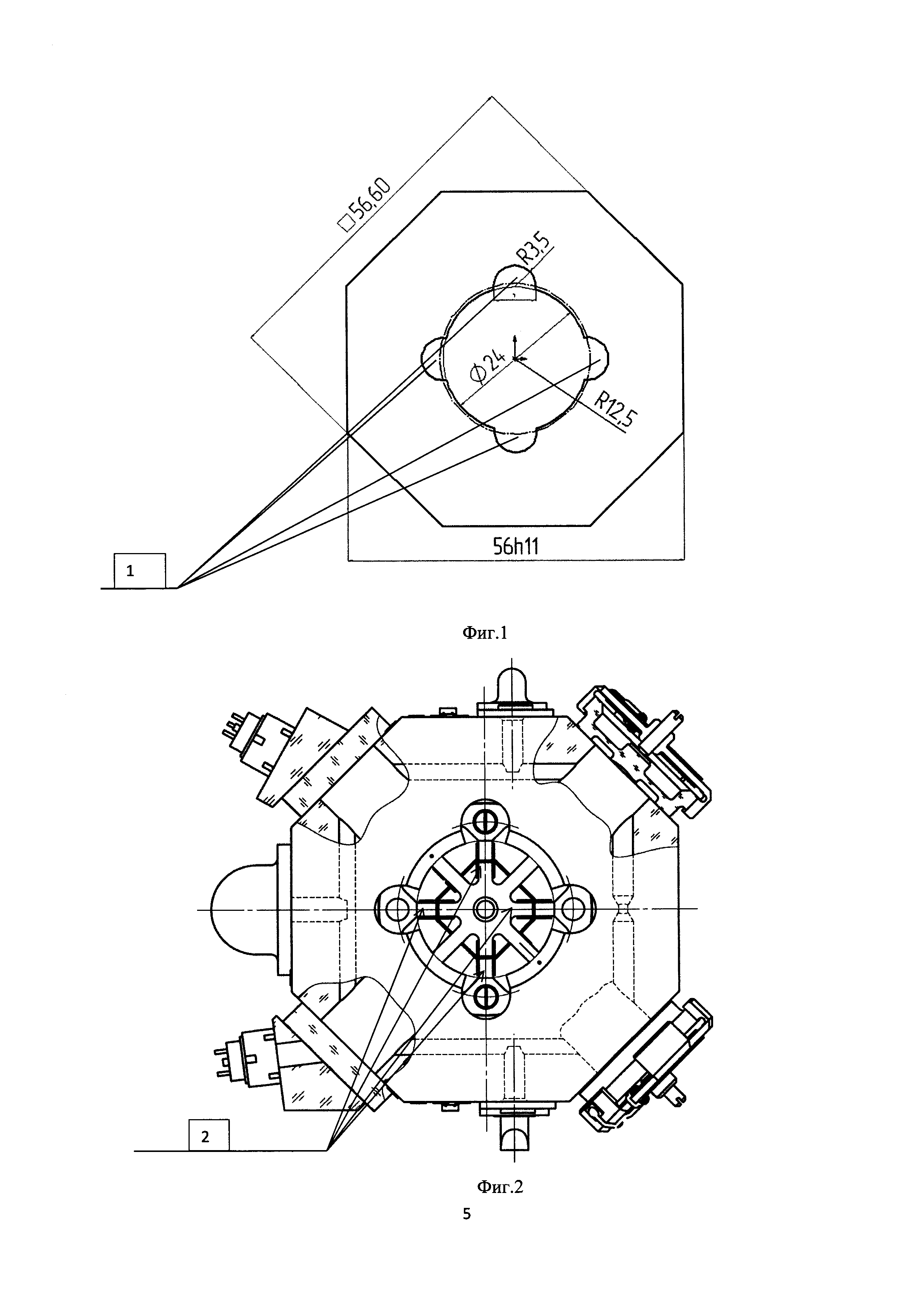 Изобретение относится к измерительной технике, в частности к области преобразования параметров вращения в электрический сигнал с помощью гироскопов, в которых чувствительным элементом служит кольцевой лазер, и может быть использовано, например, в системах навигации. Известен кольцевой лазер, описанный в патенте US 2008304052 A1, 11.12.2008, состоящий из корпуса планарного оптического резонатора, внутри которого выполнен магистральный канал, проходящий по периметру корпуса. На боковых гранях корпуса установлены отражающие элементы, сообщающиеся с магистральным каналом посредством пазух. По меньшей мере на одном отражающем элементе установлена призма, на которой установлен по меньшей мере один фотоприемник. Кроме того, на боковых гранях корпуса установлен по меньшей мере один катод и по меньшей мере два анода, по меньшей мере один из которых анод-штенгель, причем указанные по меньшей мере один катод и по меньшей мере два анода сообщаются с магистральным каналом посредством пазух. В центральной части корпуса выполнена выемка для установки на элемент, обеспечивающий вращательное движение кольцевого лазера относительно корпуса гироскопа. Недостатками данного кольцевого лазера является то, что невозможно увеличить амплитуду раскачки виброподвеса, а соответственно устранить явление синхронизации встречных волн, что сказывается на точности кольцевого лазера. Задача, на решение которой направлено заявленное изобретение, заключается в создании кольцевого лазера, в котором обеспечена возможность увеличения амплитуды раскачки виброподвеса, при этом достигается такой технический результат, как устранение явления синхронизации встречных волн и уменьшение величины случайной компоненты погрешности лазерного гироскопа. Заявленный технический результат достигается кольцевым лазером, включающим резонатор, состоящий из корпуса, в котором выполнено отверстие для монтажа на виброподвес, причем в корпусе планарного резонатора, внутри которого выполнен магистральный канал, проходящий по периметру корпуса, причем на боковых гранях корпуса установлены отражающие элементы, сообщающиеся с магистральным каналом посредством пазух, по меньшей мере на одном отражающем элементе установлена призма, на которой установлен по меньшей мере один фотоприемник, и по меньшей мере на одном отражающем элементе установлен пьезодвигатель, кроме того, на боковых гранях корпуса установлен один катод, два анода, один из которых анод-штенгель, причем указанные один катод и два анода сообщаются с магистральным каналом посредством пазух, а также виброподвес, обеспечивающий раскачку кольцевого лазера за счет изгибных колебаний плоских пружин, информационный и мощностной фотоприемники, пьезоэлектрический преобразователь и смесительной призмы. В корпусе кольцевого лазера, в стенках отверстия для крепления корпуса резонатора на виброподвес, выполнены четыре паза, расположенные таким образом, что обеспечивается крепление плоских пружин опоры в упомянутых пазах. Фиг. 1 - корпус кольцевого резонатора. Фиг. 2 - кольцевой лазер. Кольцевой лазер состоит из резонатора, виброподвеса, обеспечивающего раскачку кольцевого лазера за счет изгибных колебаний плоских пружин информационного и мощностного фотоприемников, пьезоэлектрического преобразователя и см