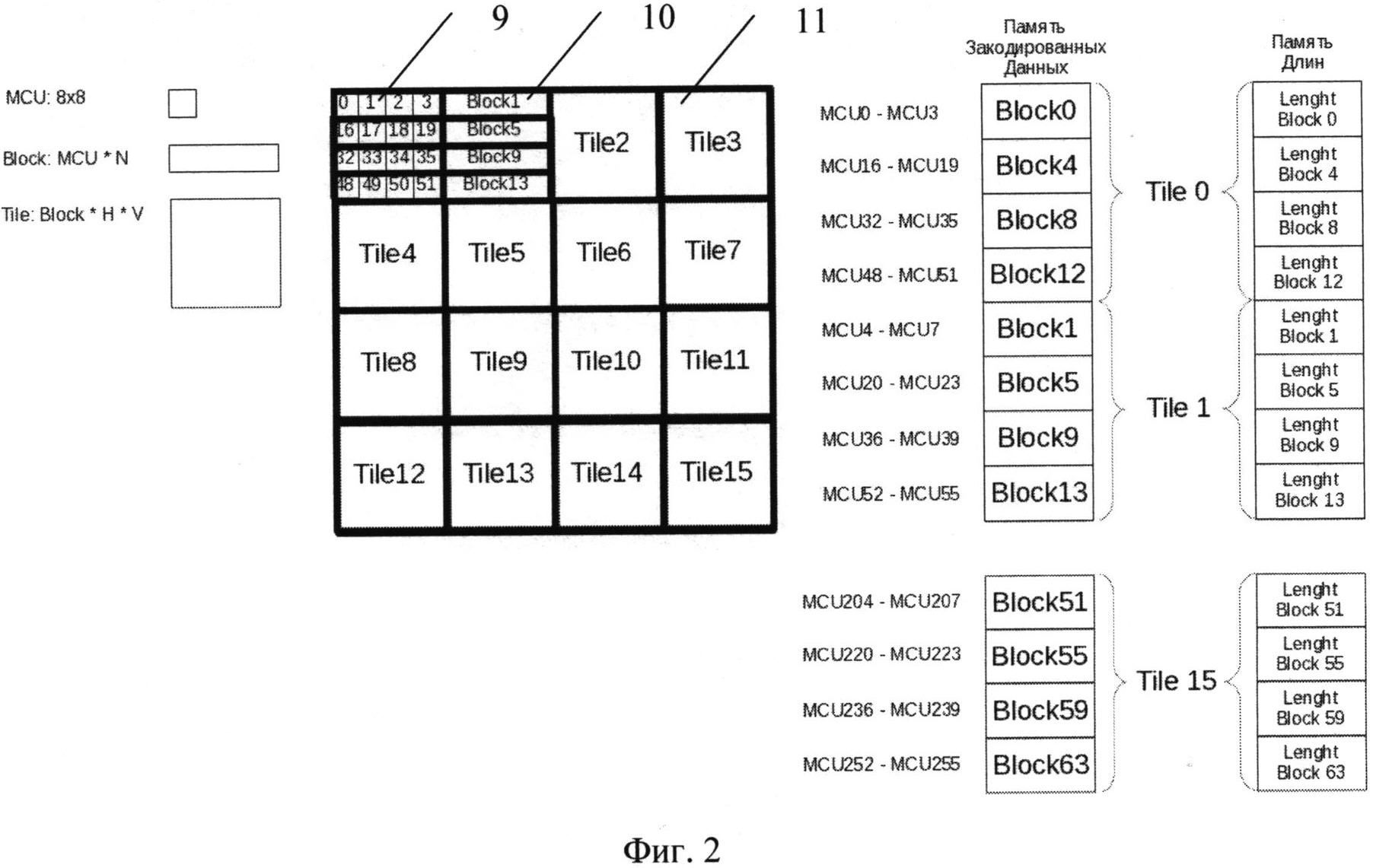 1. Способ обработки изображения, содержащий этап сжатия изображения и этап загрузки сжатого изображения, в котором на этапе сжатия изображения выполняют следующие операции: загружают исходное изображение в кодер JPEG по частям, посредством кодера JPEG разбивают исходное изображение на микроблоки, каждый из которых состоит из заданного числа блоков MCU, определяют для каждого микроблока, исходя из его максимального размера, начальный адрес и размер области расположения сжатого микроблока и области расположения информации о длине сжатого микроблока во внешней памяти, сжимают микроблоки по стандарту JPEG, при этом формируют выходной битовый поток сжатого изображения, определяют его длину и сохраняют выходной битовый поток сжатого изображения в определенные области во внешней памяти, при этом сжатые микроблоки и информацию об их длинах одного макроблока сохраняют в соседние области во внешней памяти; на этапе загрузки сжатого изображения выполняют следующие операции: посредством обработчика изображения формируют запрос данных в кэш декодированных данных, посредством кэша декодированных данных определяют наличие в нем запрашиваемых данных, при наличии запрашиваемых данных посредством кэша декодированных данных формируют ответ обработчику изображения и передают в него запрашиваемые данные, при отсутствии запрашиваемых данных посредством кэша декодированных данных формируют запрос данных в кэш закодированных данных, посредством кэша закодированных данных определяют наличие в нем запрашиваемых данных, при наличии запрашиваемых данных посредством кэша закодированных данных направляют закодированные запрашиваемые данные в декодер JPEG, посредством декодера JPEG декодируют закодированные запрашиваемые данные и передают декодированные запрашиваемые данные в кэш декодированных данных, посредством кэша декодированных данных формируют ответ обработчику изображения и передают в него запрашиваемые данные, при отсутствии запрашиваемых данных посредством кэша закодированных данных формируют запрос данных в кэш длин микроблоков, посредством кэша длин микроблоков определяют наличие в нем длин запрашиваемых микроблоков, при наличии длин запрашиваемых микроблоков посредством кэша длин микроблоков направляют в кэш закодированных данных длины запрашиваемых микроблоков, посредством кэша закодированных данных формируют запрос данных во внешнюю память по определенным адресам, загружают из внешней памяти закодированные запрашиваемые данные и направляют в декодер JPEG, посредством декодера JPEG декодируют закодированные запрашиваемые данные и передают декодированные запрашиваемые данные в кэш декодированных данных, посредством кэша декодированных данных формируют ответ обработчику изображения и передают в него запрашиваемые данные, при отсутствии длин запрашиваемых микроблоков посредством кэша длин микроблоков формируют запрос длин микроблоков во внешнюю память по заданным адресам, загружают из внешней памяти запрошенные длины микроблоков и передают их в кэш закодированных данных, посредством кэша закодированных данных формируют запрос данных во внешнюю память по определенным адресам, загружают из внешней памяти закодированные запрашиваемые данные и направляют в декодер JPEG, посредством декодера JPEG деко