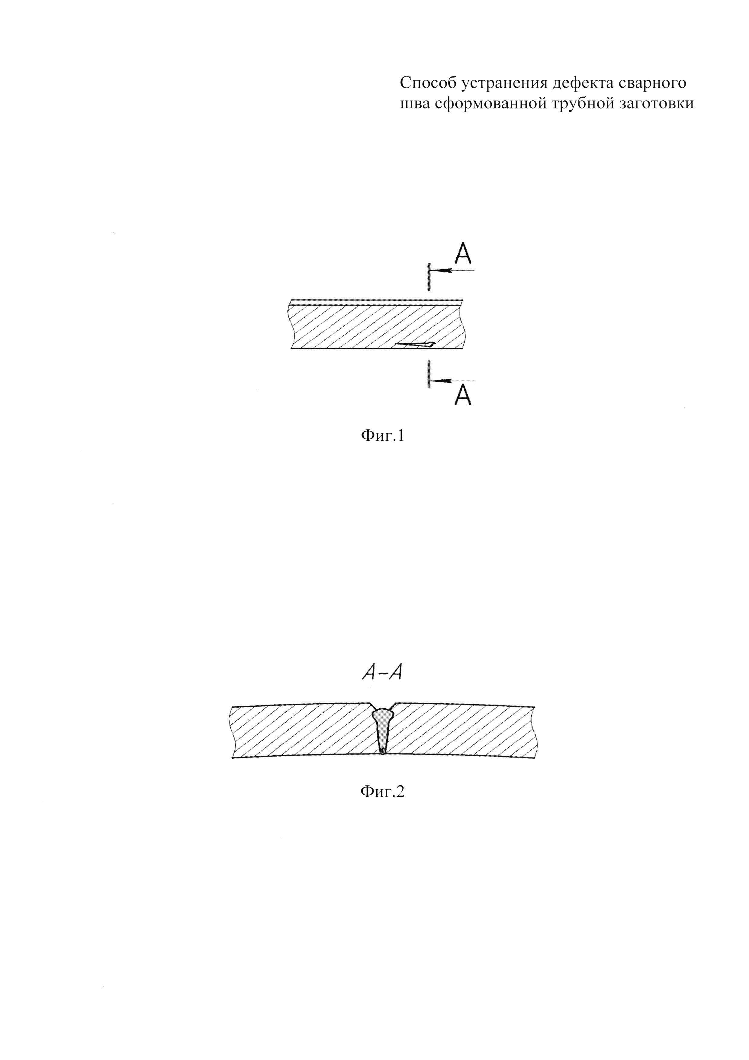 Способ устранения дефекта сварного шва сформованной трубной заготовки, выполненного с использованием лазера, включающий обнаружение дефекта, обозначение его границ, выборку дефектного участка в пределах обозначенных границ и заполнение его наплавкой, отличающийся тем, что выборку дефектного участка сварного шва выполняют плазменно-дуговой резкой, а заполнение его наплавкой - посредством дуговой сварки плавящимся электродом на обратной полярности с увеличенным вылетом, выбранным из условия выполнения наплавки за один проход, причем наплавку осуществляют непосредственно после осуществления выборки металла дефектного участка сварного шва, температура которого не достигла температуры его кристаллизации.