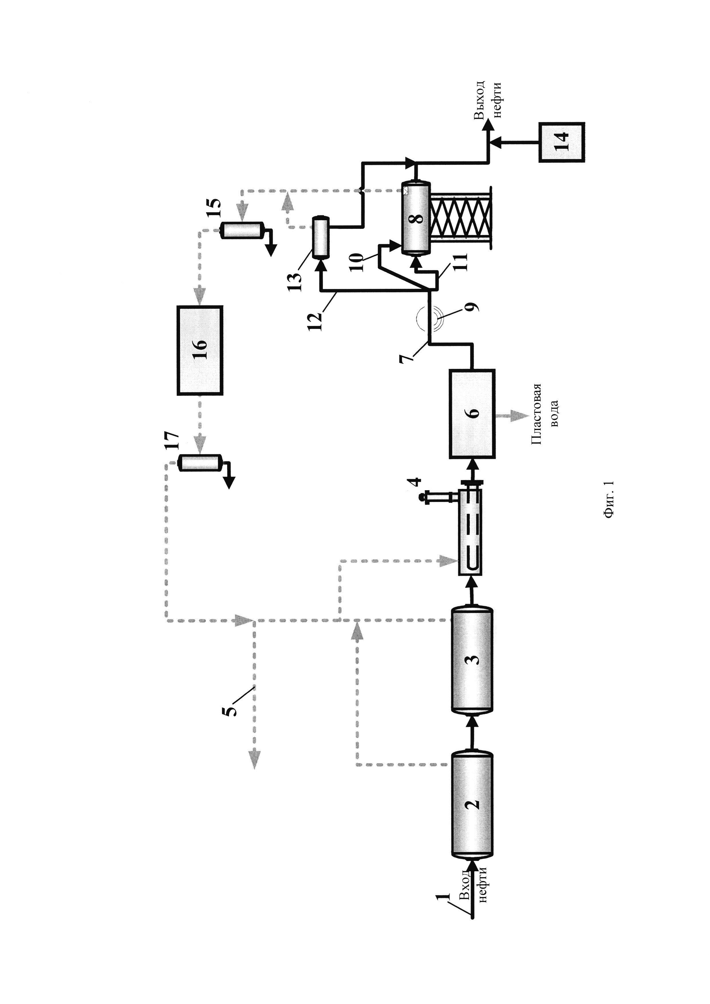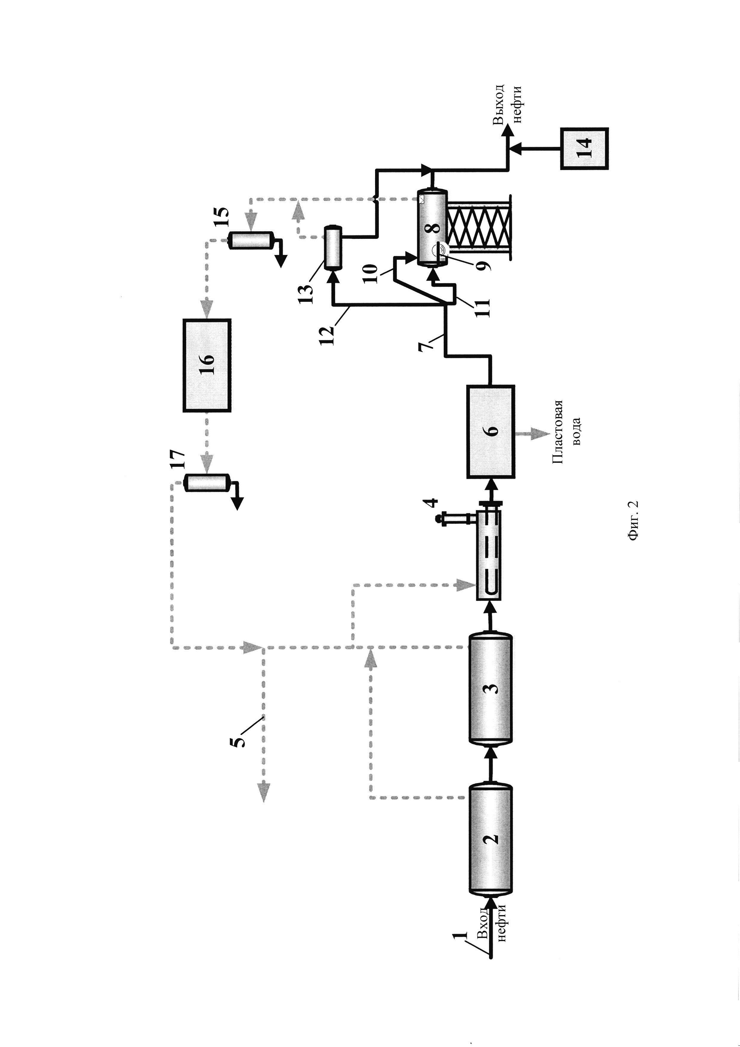 Изобретение относится к способам подготовки сероводородсодержащей нефти к транспорту и может быть использовано в нефтегазодобывающей промышленности при подготовке нефти с высоким содержанием сероводорода. Известен способ подготовки сероводородсодержащей нефти, включающий ее сепарацию с последующей нейтрализацией сероводорода реагентом (Сахабутдинов Р.З. и др. Решение проблемы удаления сероводорода из товарной нефти // Технологии нефти и газа. - 2007. - №2. - С. 13). Недостатком данного способа является малая эффективность удаления сероводорода с помощью физических процессов, вследствие чего требуется подача в нефть большого количества реагента, ухудшающего качество нефти и приводящего к значительным затратам. Известен способ подготовки и очистки нефти от сероводорода (пат. РФ №2417247, МПК C10G 29/20, опубл. 27.04.2011 в бюл. №12), включающий ступенчатую сепарацию, нейтрализацию остаточного количества сероводорода введением в нефть реагента-нейтрализатора с последующим их смешением с помощью смесителя и выдержку полученной жидкости в емкостях, при этом подогрев дегазированной нефти осуществляют после первой ступени сепарации, ввод в дегазированную нефть реагента-нейтрализатора после второй ступени сепарации, а выдержку полученной смеси в емкостях осуществляют в динамических условиях. Недостатком данного способа является то, что после сепарации сероводородсодержащей нефти при избыточном давлении в нефти остается большое количество сероводорода, вследствие чего для доведения качества товарной нефти до требований ГОСТ 51858-2002 необходим большой расход реагента-нейтрализатора, продукты реакции которого с сероводородом негативно влияют на качество нефти. Известен способ подготовки сероводородсодержащей нефти (пат. РФ №2262975, МПК B01D 19/00, опубл. 27.10.2005 в бюл. №30) путем ее многоступенчатой сепарации, включающий удаление содержащегося в нефти сероводорода сепарацией при пониженном давлении (в вакууме), сепарацию проводят при давлении, обеспечивающем достижение не более 85%-ной степени удаления содержащегося сероводорода, после чего в нефть вводят водно-щелочной раствор нитрита натрия, или пиросульфита, или гидросульфита натрия, или гидроксиламинсульфата, или водный раствор сульфита и гидросульфита натрия, взятый в эффективных количествах, и полученную смесь выдерживают при температуре 15-65°С в течение не менее 0,5 ч. Недостатком данного способа является использование эжектора для создания вакуума в сепараторе, который требует значительных затрат электроэнергии вследствие низкого КПД. Для стабильной работы эжектора необходимо поддерживать постоянный расход откачиваемого газа, что является затруднительным из-за изменения во времени как расхода, так и состава нефти. Эффективность удаления сероводорода из нефти физическими методами ограничена 85%, поэтому для доведения качества нефти по содержанию сероводорода до требуемых норм необходима подача в нефть большого количества реагента. Наиболее близким по технологической сущности к предлагаемому способу является способ подготовки сероводородсодержащей нефти (пат. РФ №2597092, МПК B01D 19/00, опубл. 10.09.2016 в бюл. №25), включающий многоступенчатую сепарацию, нагрев, обезвоживание и обессоливание нефти пресной водой, подачу нефти по подводящему трубопроводу в сепаратор концевой ступени,