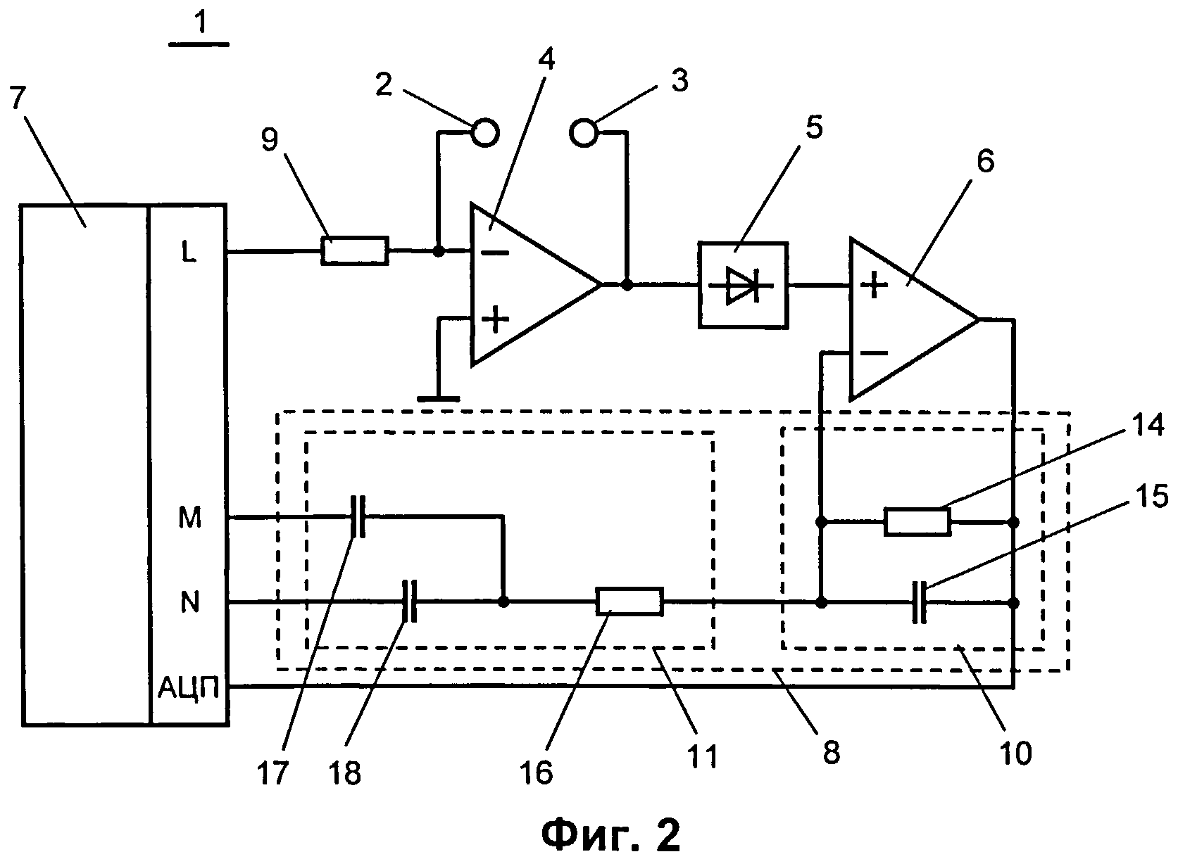 переключаемый частотно-зависимый делитель напряжения имеет верхнее плечо и нижнее плечо, образованное двумя цепочками, имеющими общий конец в средней точке частотно-зависимого делителя напряжения и два раздельных конца, причем частотно-зависимый делитель напряжения подключен к выходу второго операционного усилителя, его верхнее плечо включено в цепь отрицательной обратной связи второго операционного усилителя, а раздельные концы нижнего плеча подключены соответственно ко второму и к третьему портам ввода-вывода микроконтроллера, выполненного с возможностью подключения второго или третьего порта ввода-вывода к нулевому потенциалу,