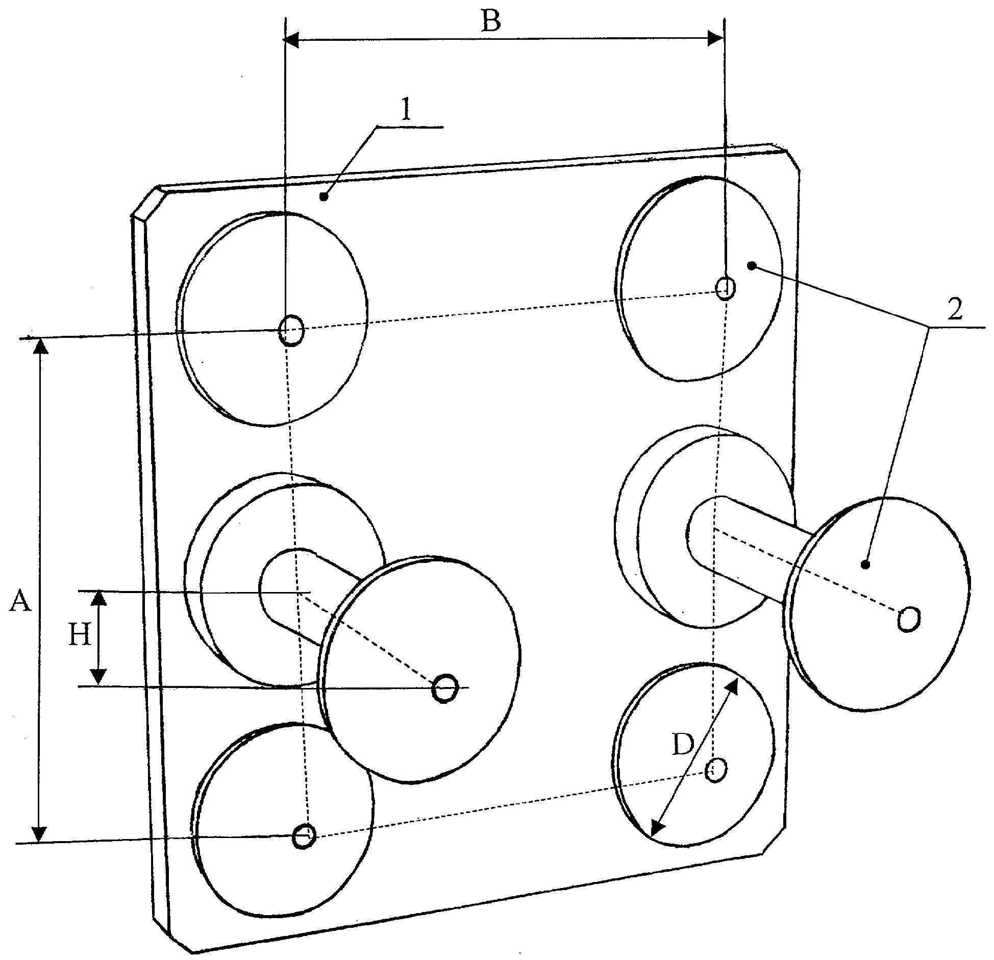 (выполненную, например, в виде прямоугольника) и закрепленные на ней шесть объектов, выполненных в виде усеченных конусов 2 с диаметром D в своем основании, конические поверхности которых являются