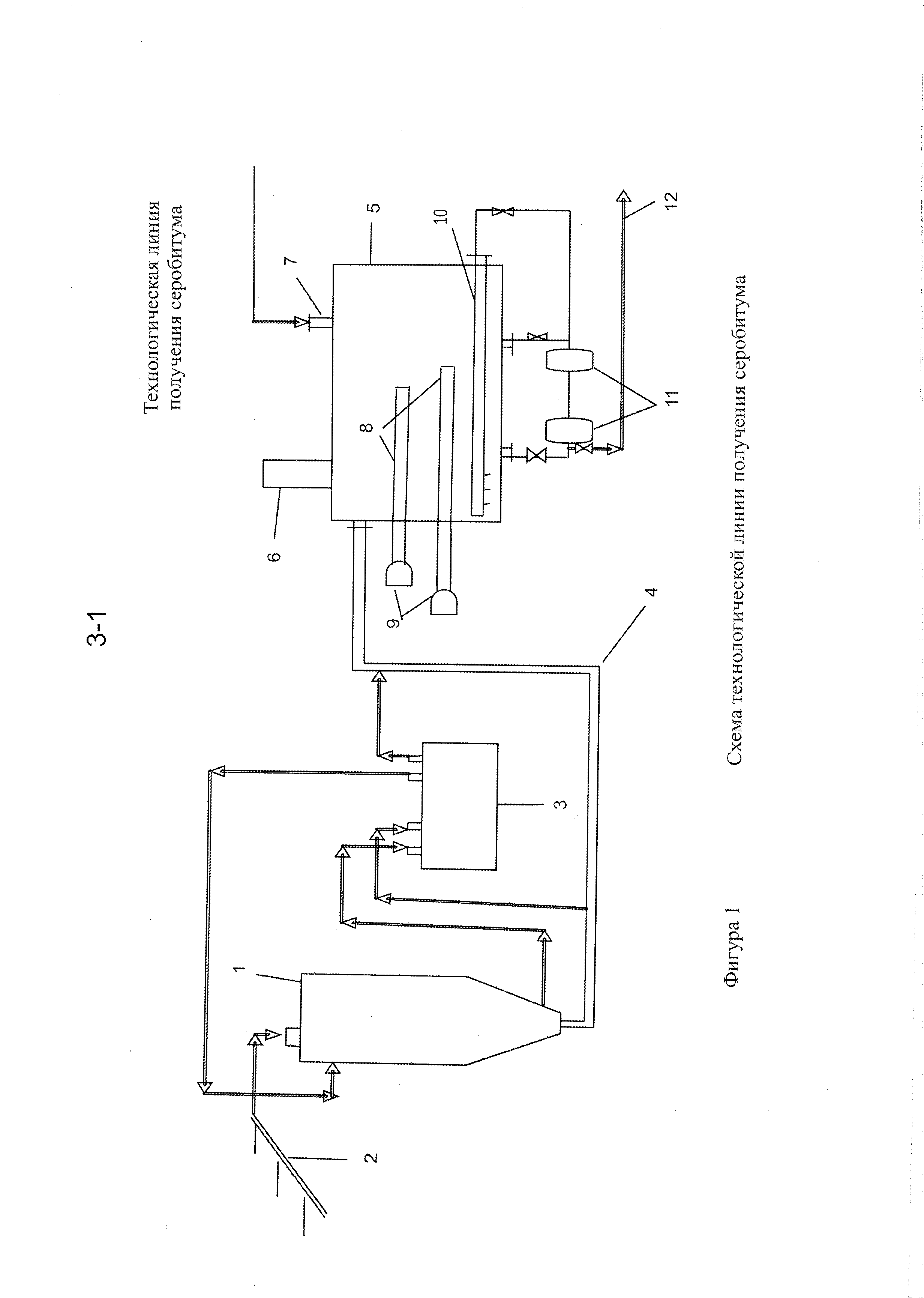 Технологическая линия получения серобитума, состоящая из узла подготовки серы, соединенного подогреваемым трубопроводом с узлом приготовления серобитума, оснащенного трубопроводом подачи готового серобитума потребителю, отличающаяся тем, что узел подготовки серы состоит из: плавильника серы, оснащенного элеватором для подачи комовой серы, автоматической маслостанцией для расплавления серы, а узел приготовления серобитума представляет собой реактор интенсивного смешения с люком для подачи битума и мерником-дозатором для подачи катализатора, и оборудован системой обогрева, состоящей из двух нержавеющих труб и двух автоматических жидкостных горелок, и системой гидравлического интенсивного перемешивания, включающей в себя металлическую трубу с отводами разного диаметра, направленными в разные стороны, и два шестеренных насоса для обеспечения перемешивания смеси.
