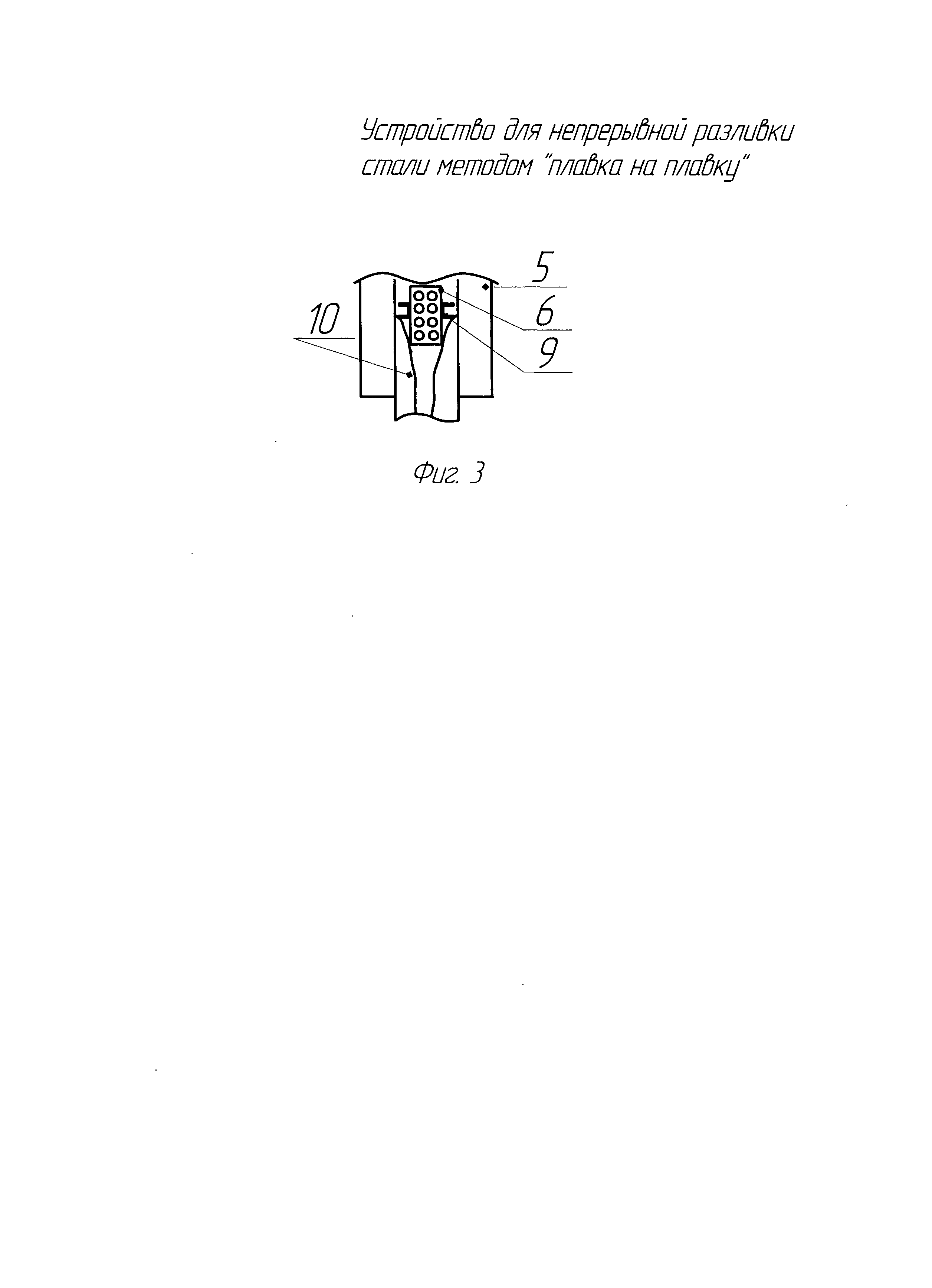 1. Устройство для непрерывной разливки стали методом «плавка на плавку», содержащее последовательно расположенные сталеразливочный и промежуточный ковши, кристаллизатор, внутри которого установлен полый соединительный элемент в виде цилиндра, в стенках которого выполнены сквозные отверстия, отличающееся тем, что с внешней стороны цилиндра установлены опорные элементы, которые расположены диаметрально противоположно друг другу и жестко закреплены в средней части цилиндра, при этом ширина опорного элемента составляет 1,8…2,0 диаметра цилиндра, а высота цилиндра равна 3,9…4,4 его диаметра. ! 2. Устройство по п.1, отличающееся тем, что опорный элемент выполнен в виде уголка. ! 3. Устройство по п.1, отличающееся тем, что опорный элемент выполнен в виде швеллера.