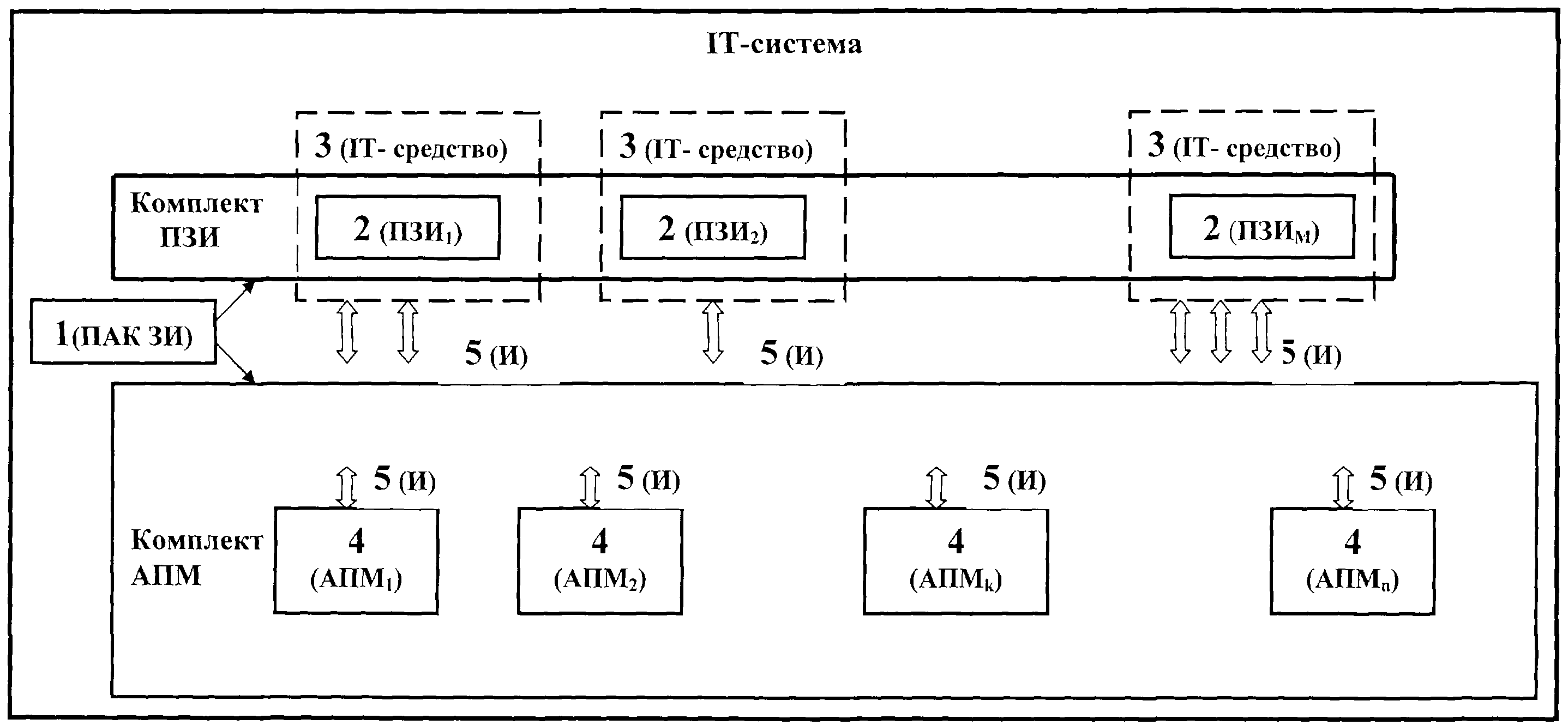 1. Программно-аппаратный комплекс защиты информации в IT-системах, включающий комплект программ защиты информации (ПЗИ), каждая из которых инсталлируется в одно из аппаратно-программных - средств IT-системы (IT-средство), и комплект аппаратно программных модулей (АПМ) защиты информации, каждый из которых выполнен с возможностью обеспечения парольного разграничения доступа к хранимым в нем информационным ресурсам и содержит: процессор (Прц), энергонезависимую память (ЭНП) и интерфейсный узел (ИУ) для взаимодействия со средствами IT-системы, отличающийся тем, что комплект АПМ включает: аппаратно-программные модули, обеспечивающие разделение полномочий пользователей (АПМ-П), в ЭНП которых хранятся данные, определяющие уровень полномочий обладателей АПМ, включающие АПМ-П, по меньшей мере, двух категорий доступа: АПМ-П с уровнем доступа исполнителя (АПМ-ПИ) и АПМ-П с уровнем доступа администратора безопасности (АПМ-ПБ); по меньшей мере, один аппаратно-программный модуль контроля IT-системы (АПМ-К), в ЭПН которого хранятся данные, применяемые в процедуре контроля IT-системы; при этом ЭНП каждого АПМ имеет директорно-файловую структуру, предусматривающую размещение в ней групп файлов трех типов: а) бинарных файлов приложений, содержащих данные, необходимые для работы IT-системы; б) файлов кодов доступа к ресурсам АПМ; в) файлов скриптов, содержащих исполняемые файлы, расширяющие возможности операционной системы АПМ, причем зона каждого файла включает поле для размещения самого файла и поле для размещения правил управления доступом (ПУД) к этому файлу, а число зон в каждой из групп файлов, число и содержание ПУД для каждого из файлов и размеры этих полей для каждого из файлов определяются алгоритмом взаимодействия АПМ с IT-средством и выбранной политикой безопасности IT-системы, при этом количество ПЗИ и количество АПМ каждого типа определяется архитектурой IT-системы и принятой в ней политикой безопасности. 2. Программно-аппаратный комплекс защиты информации в IT-системах по п.1, отличающийся тем, что комплект АПМ включает, по меньшей мере, один аппаратно-программный модуль разделения полномочий и контроля (АПМ-ПК), в котором хранятся и данные, определяющие уровень полномочий обладателей АПМ, и данные, применяемые в процедуре контроля IТ-системы. 3. Программно-аппаратный комплекс защиты информации в IT-системах по п.1, отличающийся тем, что содержит группу АПМ, в каждом из которых хранится частный код (АПМ-ЧК), используемый совместно с частными кодами из других АПМ-ЧК этой группы для формирования общего системного секретного кода, используемого в IТ-системе. 4. Программно-аппаратный комплекс защиты информации в IT-системах по п.1, отличающийся тем, что в комплект АПМ входят АПМ, в которых хранятся данные одного, или двух, или трех следующих видов: данные, применяемые для предоставления пользователю полномочий по одной из, как минимум, двух возможных категорий доступа пользователей; данные, применяемые в процедуре контроля IТ-системы; данные одного из частных кодов, используемых, совместно с частными кодами из других АПМ, для формирования общего системного секретного кода, используемого в IT-системе, при этом количество хранимых видов данных в каждом из АПМ комплекта определяется архитектурой IT-системы и используемой в ней политикой безопасности 5. П