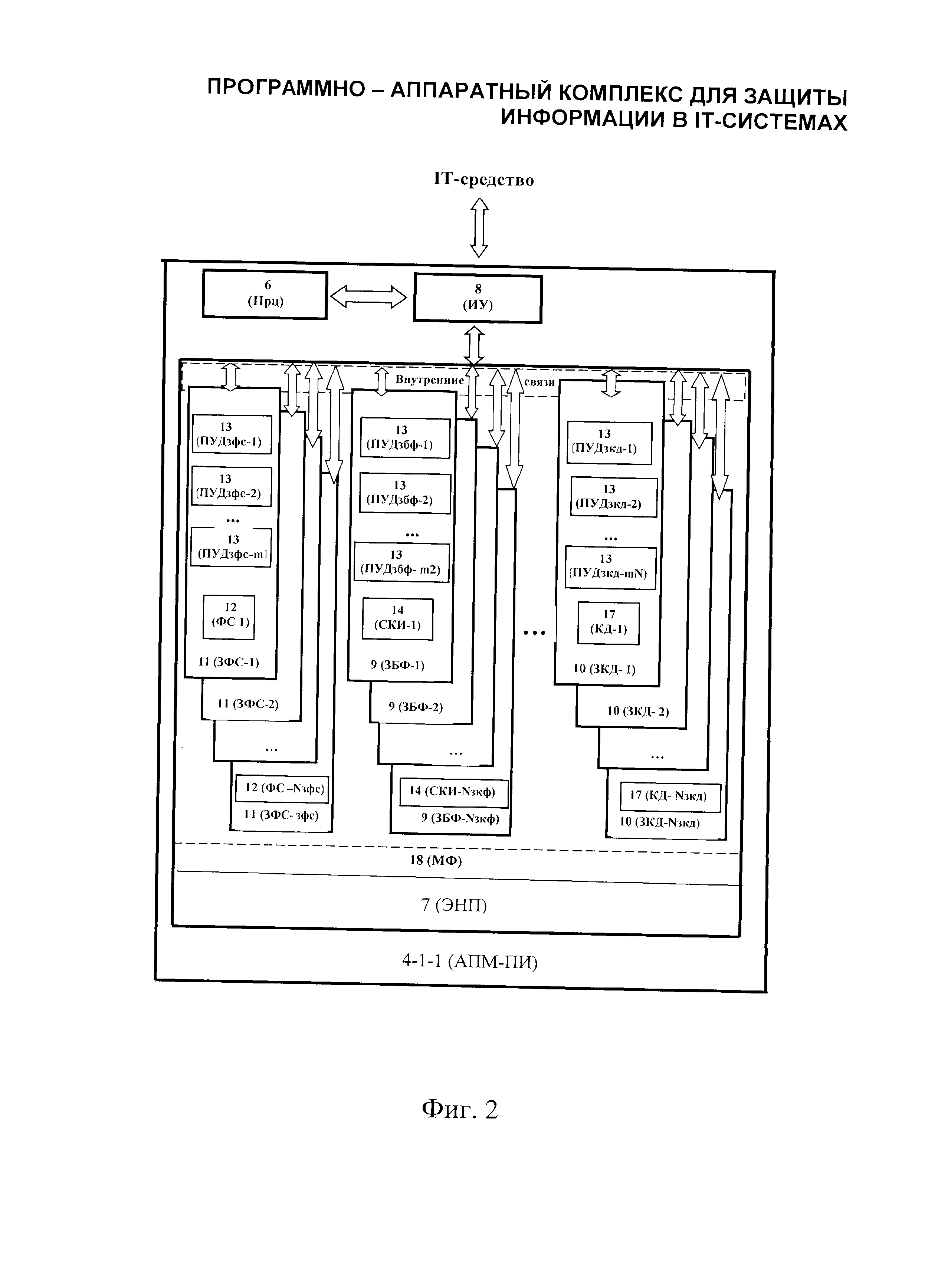 1. Программно-аппаратный комплекс защиты информации в IT-системах, включающий комплект программ защиты информации (ПЗИ), каждая из которых инсталлируется в одно из аппаратно-программных - средств IT-системы (IT-средство), и комплект аппаратно программных модулей (АПМ) защиты информации, каждый из которых выполнен с возможностью обеспечения парольного разграничения доступа к хранимым в нем информационным ресурсам и содержит: процессор (Прц), энергонезависимую память (ЭНП) и интерфейсный узел (ИУ) для взаимодействия со средствами IT-системы, отличающийся тем, что комплект АПМ включает: аппаратно-программные модули, обеспечивающие разделение полномочий пользователей (АПМ-П), в ЭНП которых хранятся данные, определяющие уровень полномочий обладателей АПМ, включающие АПМ-П, по меньшей мере, двух категорий доступа: АПМ-П с уровнем доступа исполнителя (АПМ-ПИ) и АПМ-П с уровнем доступа администратора безопасности (АПМ-ПБ); по меньшей мере, один аппаратно-программный модуль контроля IT-системы (АПМ-К), в ЭПН которого хранятся данные, применяемые в процедуре контроля IT-системы; при этом ЭНП каждого АПМ имеет директорно-файловую структуру, предусматривающую размещение в ней групп файлов трех типов: а) бинарных файлов приложений, содержащих данные, необходимые для работы IT-системы; б) файлов кодов доступа к ресурсам АПМ; в) файлов скриптов, содержащих исполняемые файлы, расширяющие возможности операционной системы АПМ, причем зона каждого файла включает поле для размещения самого файла и поле для размещения правил управления доступом (ПУД) к этому файлу, а число зон в каждой из групп файлов, число и содержание ПУД для каждого из фай�