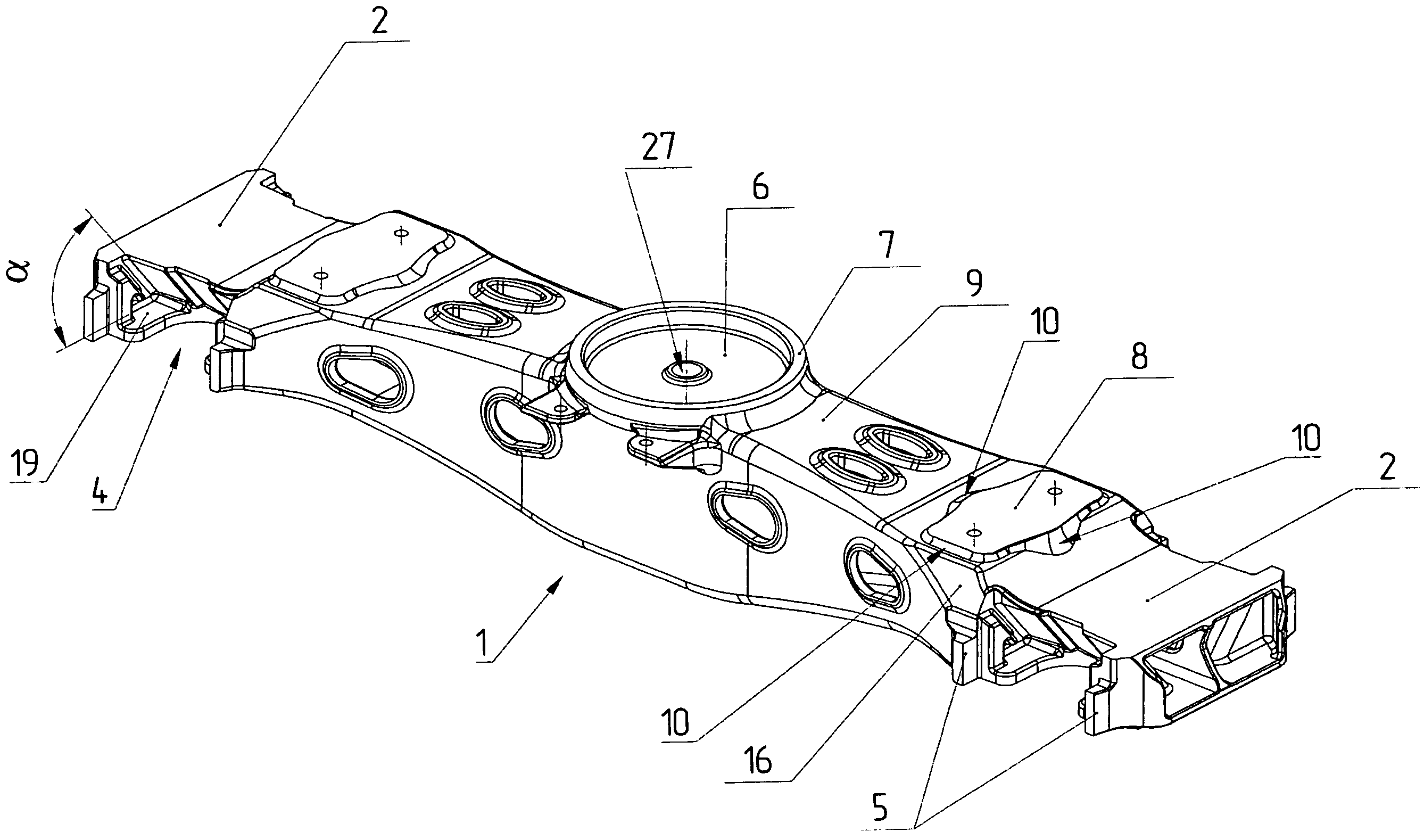 1. Надрессорная балка тележки грузового вагона повышенной грузоподъемности, представляющая собой тонкостенную коробчатого типа конструкцию, в вертикальной плоскости близкую по форме к брусу равного сопротивления изгибу, а противоположные концы ее прямоугольной в вертикальной плоскости формы снизу оборудованы устройствами для фиксации пружин центрального рессорного подвешивания и в боковых стенах имеющие углубления - карманы для размещения клиньев фрикционных гасителей колебаний, образованные вертикальными стенками, расположенными поперек продольной оси балки, наклонной под углом α к горизонтали стенки, состоящей из трех сегментов, а в нижнем поясе балки, образующем основание кармана, выполнено продольное со скруглением к середине балки отверстие, на верхнем поясе по его центру расположен подпятник с плоской опорной поверхностью и упорным кольцевым буртом и смещенные друг от друга в боковом направлении опорные площадки под скользуны, отличающаяся тем, что по всей длине балки, вдоль ее продольной оси симметрии, выполнено вертикальное ребро с технологическими отверстиями, соединяющее верхний и нижний пояса, в том числе и в зоне подпятника. ! 2. Надрессорная балка тележки грузового вагона повышенной грузоподъемности по п.1, отличающаяся тем, что верхний пояс балки в зонах перехода от площадок под скользуны к концевым частям с внутренней стороны подкреплен ребрами ограниченной высоты, расположенными симметрично относительно продольной оси балки на расстоянии а от нее. ! 3. Надрессорная балка тележки грузового вагона повышенной грузоподъемности по п.1, отличающаяся тем, что на верхнем поясе с каждой сто