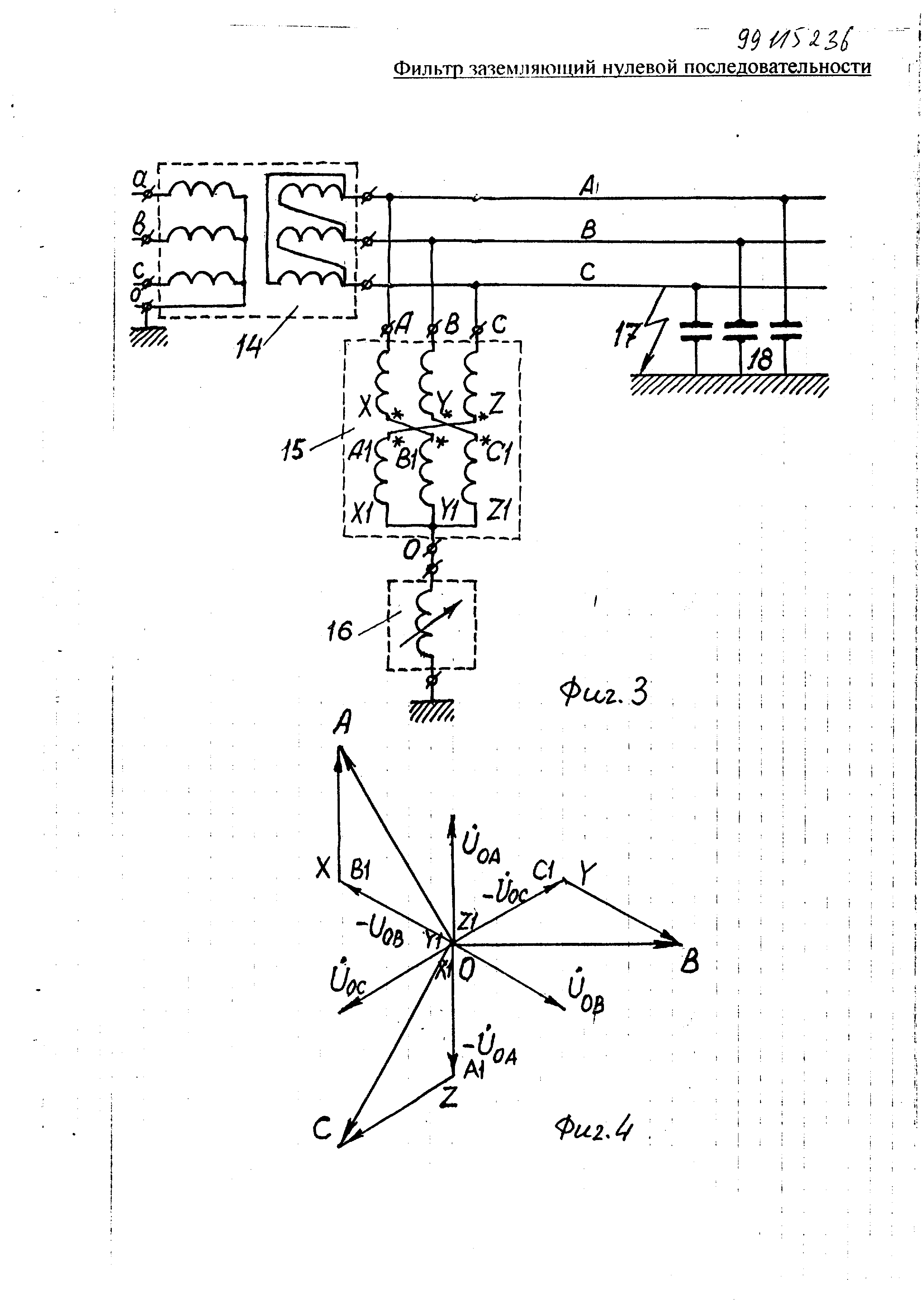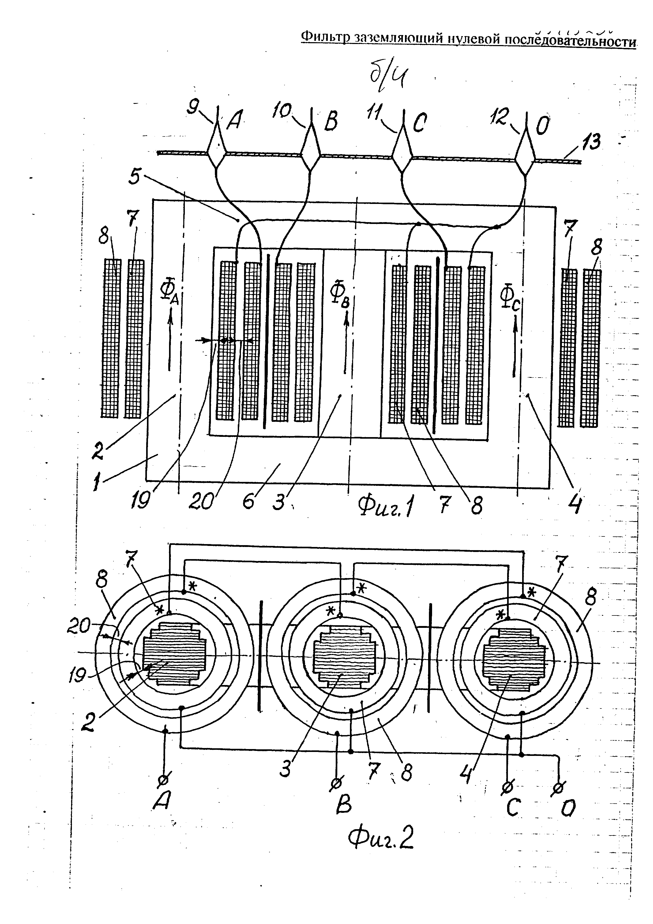 Фильтр заземляющий нулевой последовательности для трехфазных сетей с изолированной нейтралью, содержащий вводы трехфазной сети и ввод нейтрали, шихтованный из электротехнической стали трехфазный сердечник, на каждом из трех стержней сердечника которого A, B и C расположены внутренняя и внешняя части обмоток, соединенные в зигзаг, отличающийся тем, что упомянутые части обмоток имеют одну и ту же намотку, например левую, начало внутренней части обмотки стержня A соединено с началом внешней части обмотки стержня C, начало внутренней части обмотки стержня B соединено с началом внешней части обмотки стержня A, начало внутренней части обмотки стержня C соединено с началом внешней части обмотки стержня B, при этом концы внешних частей обмоток соответствующих стержней подсоединены к вводам трехфазной сети, а концы внутренних частей обмоток подсоединены к вводу нейтрали.