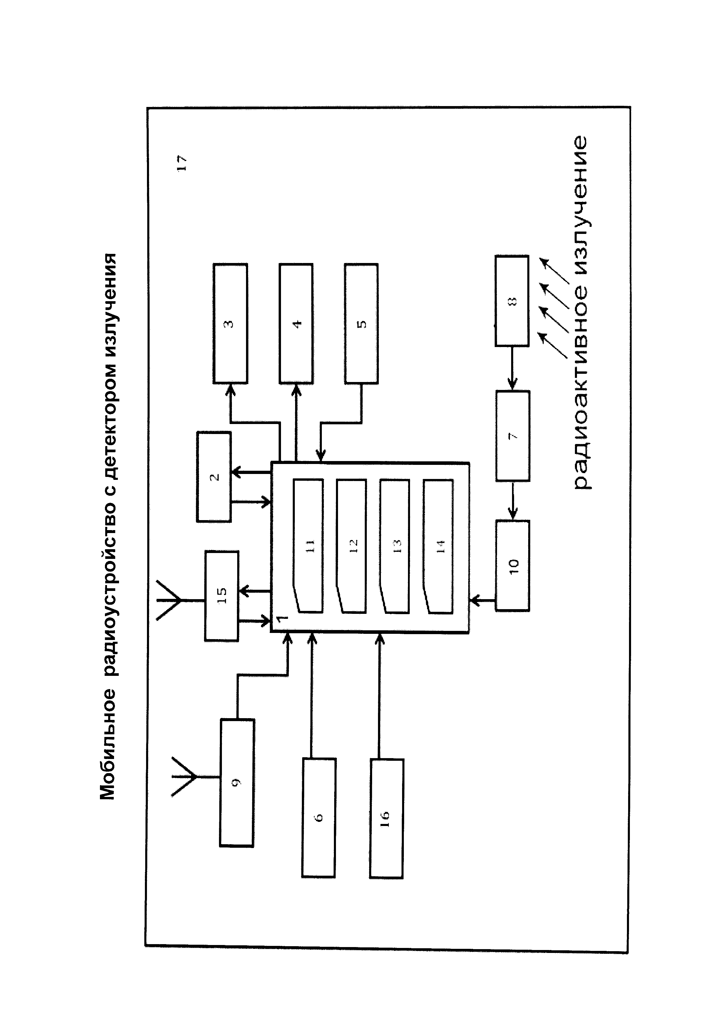 Мобильное радиоустройство (сотовый мобильный телефон, смартфон) содержит корпус 17 (изображен условно), в котором размещен процессор 1. К процессору 1 подключены блок 2 памяти, монитор 3, средства 4 звуковой сигнализации, клавиатура 5, блок 6 питания, навигационное устройство 9 систем GPS и ГЛОНАСС, приемопередающее устройство (приемопередатчик Wi-Fi/GPRS) 15. Мобильное радиоустройство снабжено лицевой фотокамерой 16? А также последовательно связанными между собой газоразрядным счетчиком 8 ионизирующего излучения Гейгера-Мюллера (далее Г-М) и преобразователем (умножителем) 7 напряжения и блоком 10 сопряжения, подключенным к процессору 1 для взаимодействия с помощью последнего с остальными вышеуказанными элементами устройства.