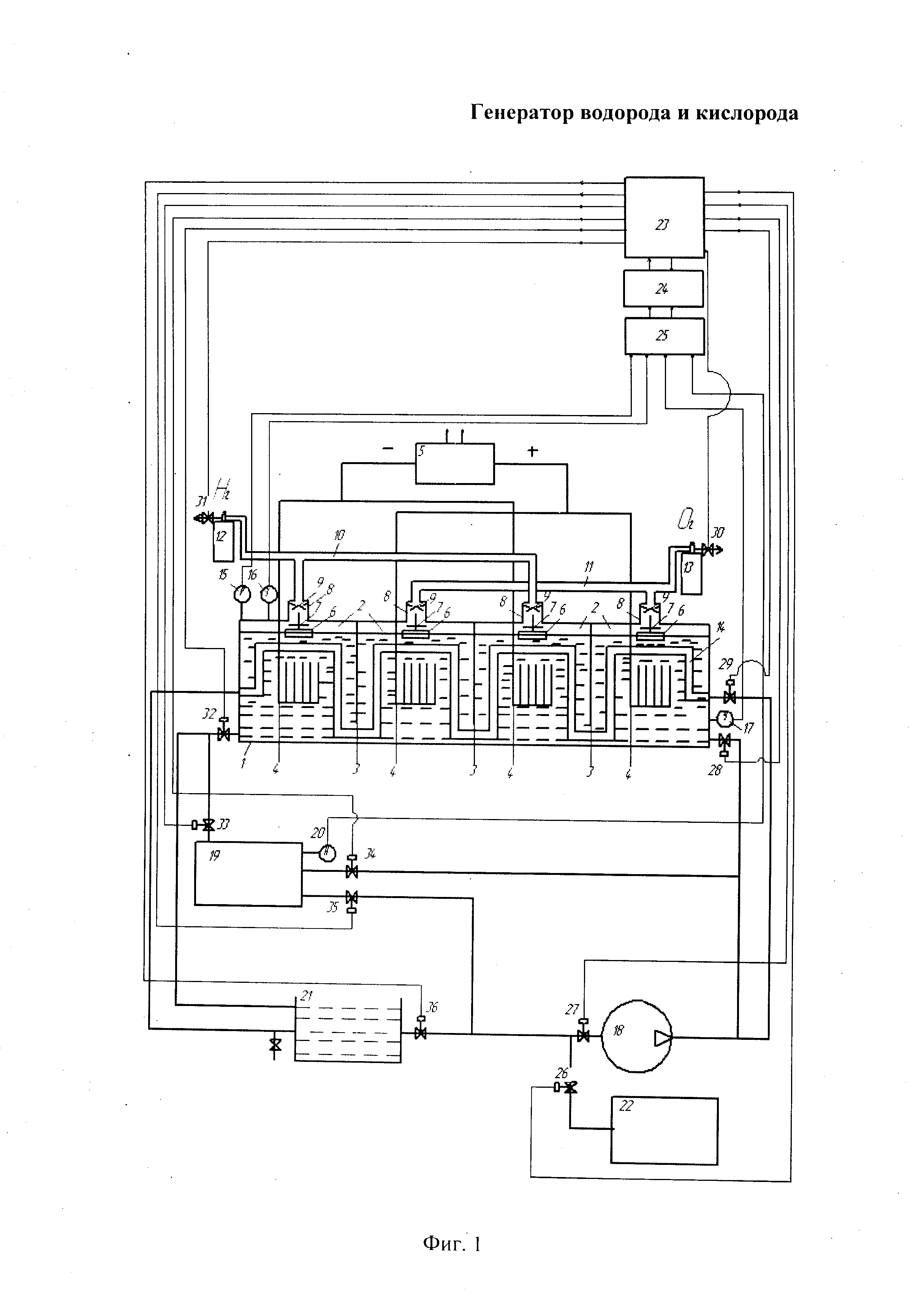 Генератор кислорода и водорода, содержащий корпус, выполненный в виде сосуда, разделенного переборками, образуя четное количество полостей, сообщающихся между собой в нижней части сосуда, в которых поочередно расположены электроды с развитыми поверхностями, а в верхней части каждая полость снабжена поплавковым устройством с запорным клапаном и газоотборными камерами с осушителем газа, при этом они через одну полость объединены в общие газоотводные трубки и источники питания электродов, насос, бак для воды, сушильное устройство и устройство для отвода тепла, отличающийся тем, что в генератор дополнительно установлены датчики давления, температуры, уровня и концентрации, блок программирования, блок управления, блок измерения, одиннадцать электроуправляемых клапанов, бак для щелочи, бак слива электролита с двумя входами и одним выходом, на отводе водорода и кислорода из корпуса генератора установлены два ресивера, устройство отвода тепла из корпуса генератора выполнено в виде змеевика, который проходит через все полости корпуса, охватывая электроды с развитыми поверхностями, причем электроуправляемые клапаны установлены первый - на линии подачи щелоча; второй - на входе насоса; третий - на выходе бака с водой; четвертый - на выходе бака с электролитом; пятый - на первом входе бака с электролитом; шестой - на втором входе бака с электролитом; седьмой - на выходе из корпуса генератора; восьмой - на входе в ресивер водорода; девятый - на входе в ресивер кислорода; десятый - на входе устройства отвода тепла в корпус генератора; одиннадцатый - на входе в корпус генератора; датчики давления, температуры, уровня установле