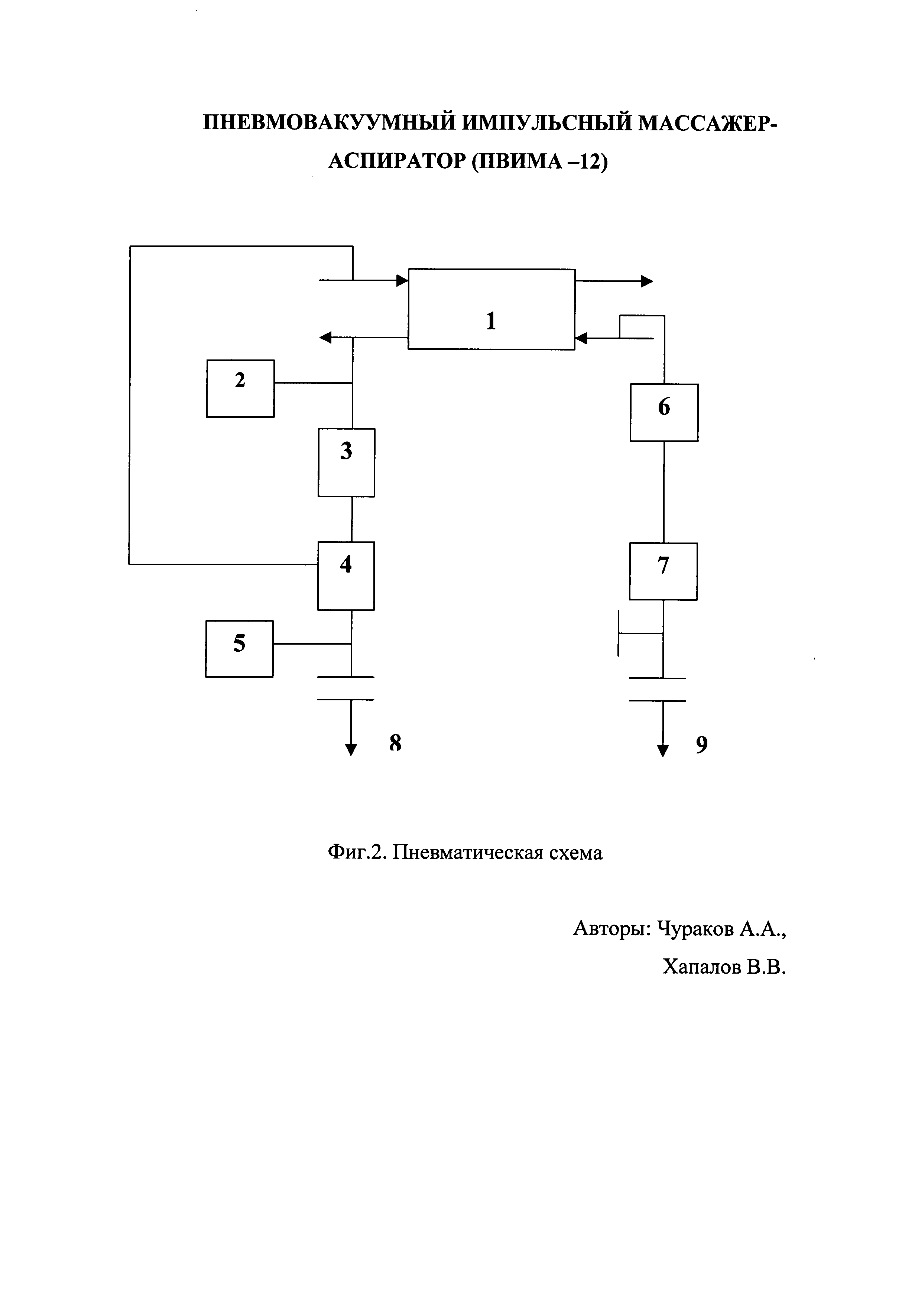 Пневмовакуумный импульсный массажер-аспиратор, содержащий мембранный вакуумный насос-компрессор, имеющий выход для нагнетания воздуха, соединенный с электронным регулятором давления, выход которого соединен с пневмораспределителем компрессии, и выход для откачки воздуха, соединенный с вакуумным регулятором, отличающийся тем, что насос дополнительно снабжен вторым выходом для откачки воздуха и вторым выходом для нагнетания воздуха, а также содержит предохранительный клапан, соединенный через тройник со входом пневмораспределителя компрессии, боковой выход которого соединен через тройник с вакуумным выходом насоса, а также снабжен реле давления, которое через тройник соединено с выходом пневмораспределителя компрессии.