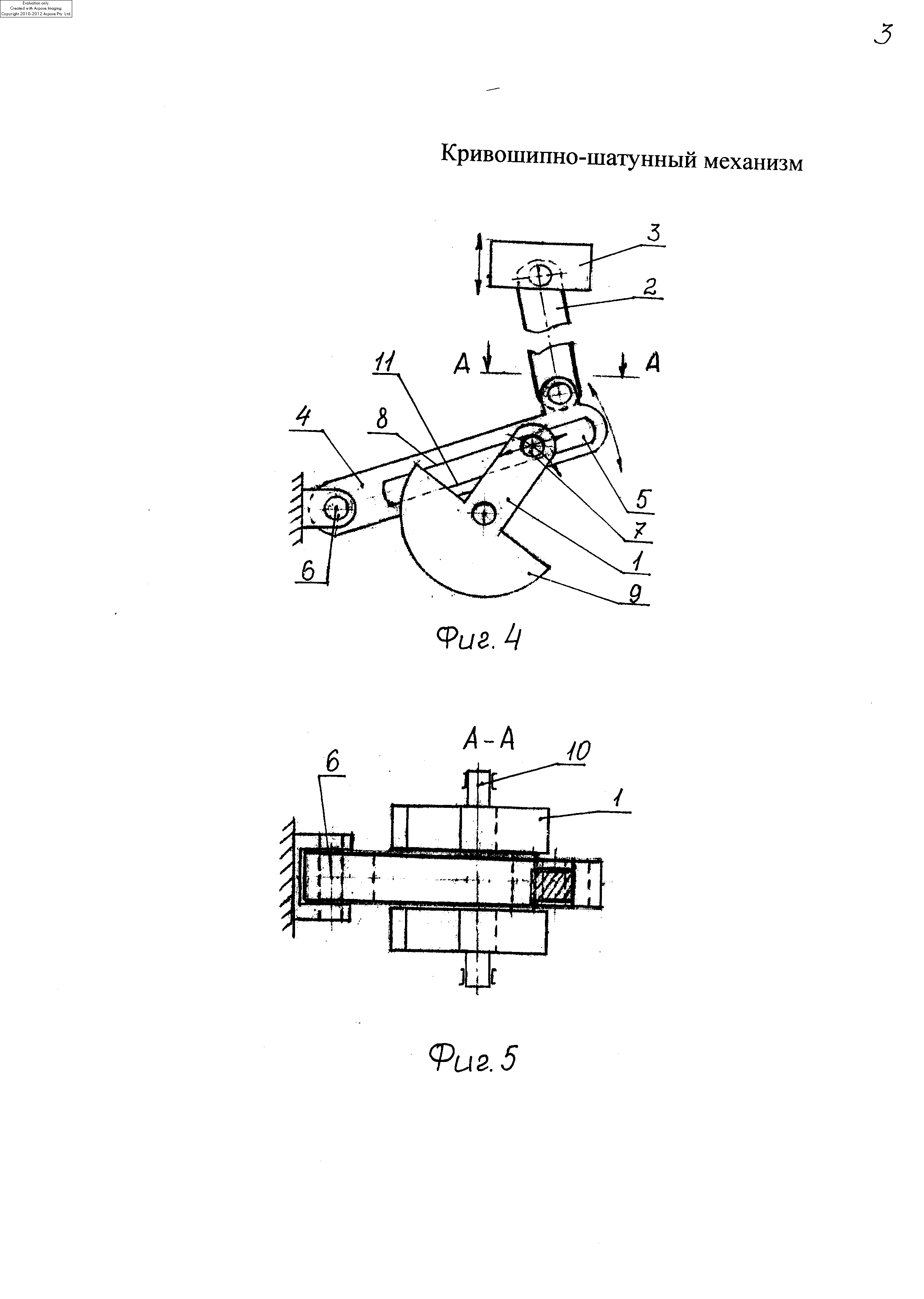 Кривошипно-шатунный механизм содержит кривошип 1 и шатун 2, один конец которого связан с поршнем 3 цилиндра, а другой - шарнирно связан с концом одноплечего рычага 4, имеющего направляющий паз 5 криволинейной (для ДВС), фиг.1, 3 или прямолинейной формы (для ППД), фиг.4, 6. Другой конец рычага 4 шарнирно закреплен к корпусу двигателя (не показано) с возможностью качания вокруг неподвижного центра закрепления 6. В пазу 5 установлена шейка 7 кривошипа 1 с напрессованным на нее подшипником (не показано) с возможностью возвратно-поступательного перемещения в пазу 5 вдоль рычага 4. Конфигурация паза 5 выполнена с обеспечением задержки рабочего хода поршня в крайнем нижнем положении для возможности полного удаления продуктов сгорания из цилиндра и ускоренным обратным ходом.