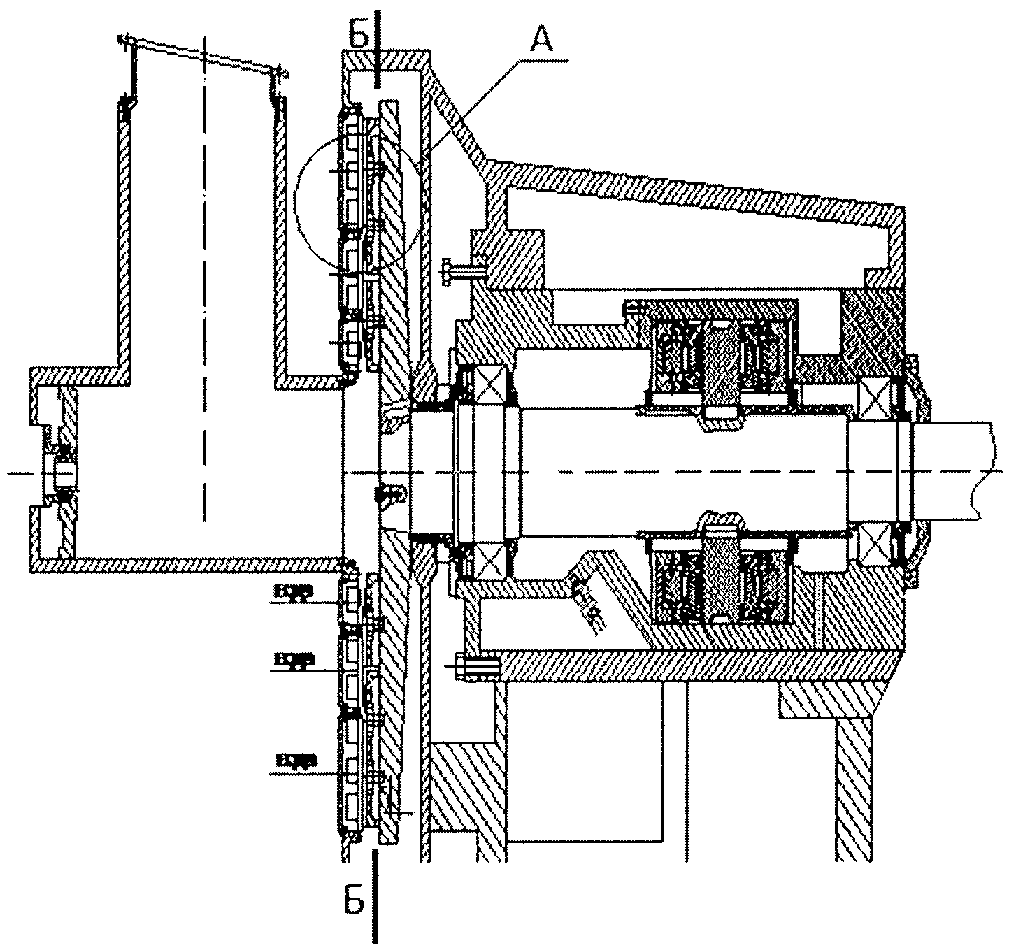 Полезная модель относится к устройствам для размола волокнистых полуфабрикатов и может быть использована в целлюлозно-бумажной промышленности. Известна дисковая мельница содержащая станину, в которой на валу установлен диск ротора, статорный диск, подающий и выводящий патрубки, подающий шнек, а также механизм присадки диска статора мельницы, отличающаяся тем, что в статорном диске выполнены камеры для подачи в них жидкости, в которые установлены плунжеры, имеющие возможность взаимодействия с ножами (патент на полезную модель РФ №58547, опубл. 27.11.2007 г.). Наиболее близким техническим решением выбранным заявителем в качестве прототипа является конструкция мельницы с гидравлической камерой и размалывающей гарнитурой в виде шаров, защищенная авторским свидетельством [1]. В предложенной конструкции мельницы необходимо отметить небольшую эффективность размола. Техническая задача - повышение эффективности и качества размола исходного материала за счет уменьшения рубящих воздействий ножей гарнитуры, для чего целесообразно использовать вместо трения скольжения трение качения. Техническая задача достигается тем, что дисковая мельница содержит корпус, статорный и роторный диски, причем она снабжена со стороны статорного диска электромагнитными излучателями, а также мелющими телами из ферромагнитного материала, расположенными в отверстиях между дорожками статорного и роторного дисков. Сравнение заявляемой полезной модели с прототипом показывает, что она отличается следующими признаками: - мельница снабжена со стороны статорного диска электромагнитными излучателями; - в отверстиях между статорным и роторным дисками расположены мелющие тела из ферромагнитного материала. Поэтому можно предположить, что заявляемая полезная модель соответствует критерию «новизна» Полезная модель может быть изготовлена на стандартном оборудовании с использованием известных технологических процессов, поэтому она соответствует критерию «промышленная применимость». На Фиг.1 изображен общий вид однодисковой мельницы; на Фиг.2 - гарнитура однодисковой мельницы; на Фиг.3 - продольный разрез размольной камеры. Однодисковая мельница состоит из корпуса 1, статорного 2 и роторного 3 дисков с размалывающей гарнитурой в виде мелющих тел (шаров) 4, расположенных в отверстиях между дисками подвижно и с возможностью контакта с дорожками 5 статорного и роторного дисков. Со стороны статорного диска расположены электромагнитные излучатели 6. Мелющие тела (шары) изготовлены из сплава, обладающего ферромагнитными свойствами, дорожки статорного и роторного дисков изготовлены из неферромагнитного материала. Предлагаемая мельница за счет расположения мелющих тел (шаров) в несколько рядов (фиг.2) исключает вероятность прохождения через зону размола неразмолотых частиц, что обеспечивает равномерность размола исходного полуфабриката. Мельница работает следующим образом: исходный волокнистый полуфабрикат через патрубок подают в зазор между роторным 3 и статорным 2 дисками, электромагнитные излучатели 6 создают переменное магнитное поле, под воздействием которого мелющие тела (шары) 4 из ферромагнитного материала совершают колебания. Мелющие тела (шары) оказывают воздействие на слой сжатых волокон, в результате чего происходит размол волокнистого пол