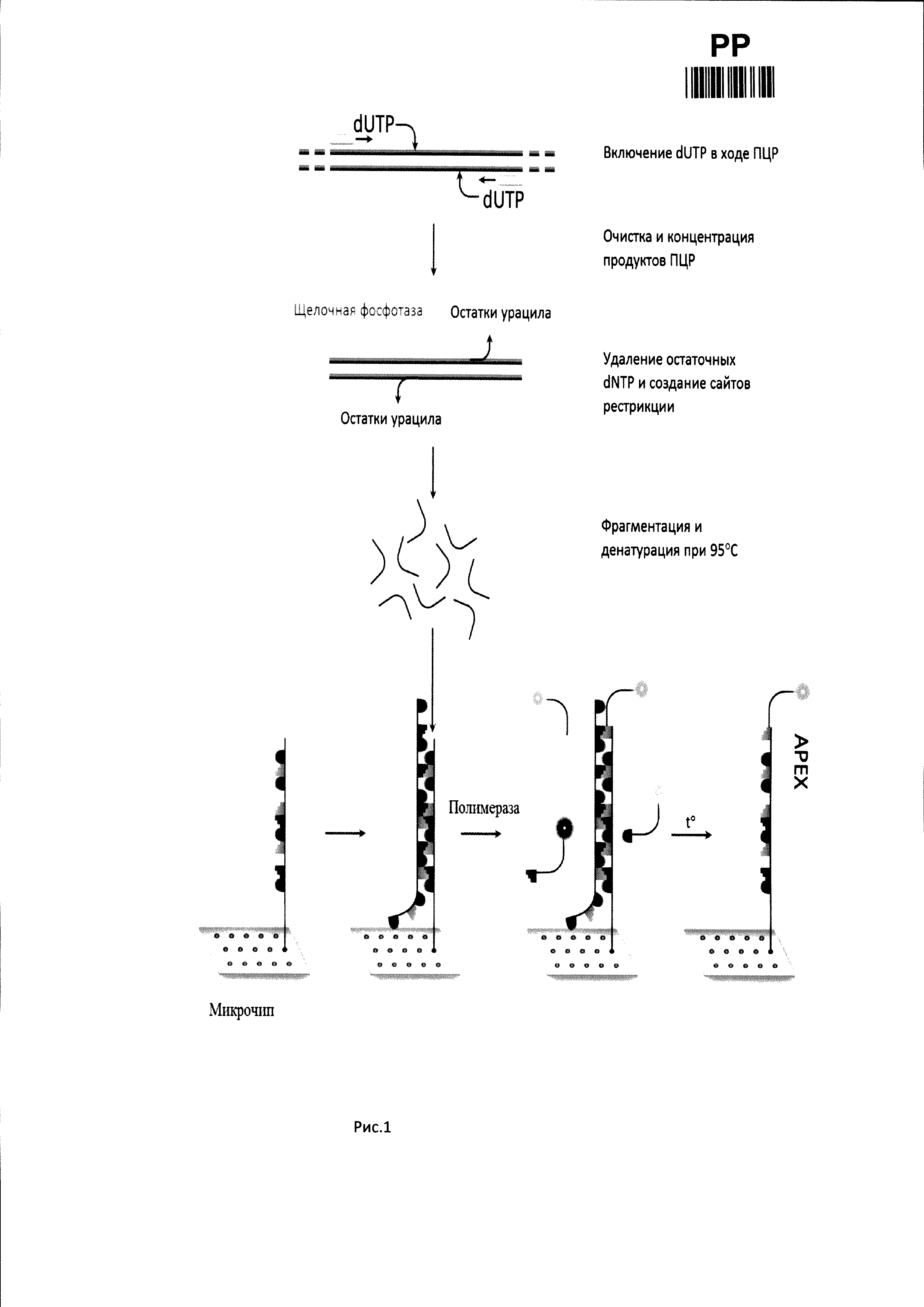 Область техники Полезная модель относятся к биотехнологии, а именно к молекулярно-генетическим исследованиям человека для диагностики наследственных заболеваний, предрасположенности к мультифакторным заболеваниям, имеющим генетическую составляющую, и персональной генетически-детерминированной реакции на фармацевтические препараты. Приблизительно половина всех случаев наследования болезней происходит, когда мать и отец не страдают наследственными заболеваниями, однако являются скрытыми носителями поврежденных генов. Если ребенок наследует от каждого родителя такой поврежденный ген, это приведет к развитию болезни. Риск рождения больного ребенка у родителей-носителей составляет 25%, что с медико-генетической точки зрения характеризуется как высокий. Руководствуясь информацией о собственных генетических особенностях, полученной с помощью молекулярно-генетических исследований, а также используя современные возможности репродуктивной медицины, будущие родители смогут избежать рисков зачатия ребенка, больного тяжелым или смертельным наследственным заболеванием, и родить здорового ребенка. Описание уровня техники Известен ДНК-микрочип для скрининга новорожденных на такие наследственные заболевания, как муковисцидоз, врожденный гипотиреоз, галактоземия, фенилкетонурия за один анализ крови. Присутствие или отсутствие мутаций ДНК определяют с помощью гибридизации полученных фрагментов на специализированном олигонуклеотидном биочипе. Для этого используют амплификацию РАН, CFTR, РАХ8, GALT генов и получение одноцепочного флюоресцентно меченного продукта методом ник-трансляции и рестрикции, приготавливают биочип для скрининга новорожденных на заболевания, содержащий набор иммобилизованных определенных олигонуклеотидов. Интерпретацию результатов гибридизации осуществляют путем сравнения интенсивности флюоресцентных сигналов, полученных при совершенной и несовершенной гибридизации. Несмотря на то, что такое исследование позволяет получить новый ускоренный метод массового скрининга новорожденных на наличие предрасположенности к моногенным заболеваниям, он обладает ограниченной информативностью. Описание сущности полезной модели Задачей настоящей разработки является создание устройства ДНК-микрочипа для исследования ДНК человека на наличие большого количества мутаций и/или полиморфизмов. Основной отличительной особенностью микрочипа является первый этап его разработки - определение мутаций и/или полиморфизмов, которые могут быть выявлены с его помощью. На данном этапе, исходят из генетических особенностей популяций, населяющих Российскую Федерацию: диагностикум (микрочип) позволяет детектировать наиболее частые мутации и/или полиморфизмы, ассоциированные с наиболее частыми на данной территории наследственными и мультифакторными заболеваниями с наследственной составляющей. Таким образом, эффективность и информативность диагностики людей длительное время проживающих на территории РФ с помощью такого диагностикума увеличивается по сравнению с прямыми аналогами, за счет способа подбора выявляемых мутаций, а не за счет увеличения их количества. Состав мутаций, выявляемых с помощью микрочипа, оптимизирован и строго специфичен для этнических групп населяющих Россию на протяжении 