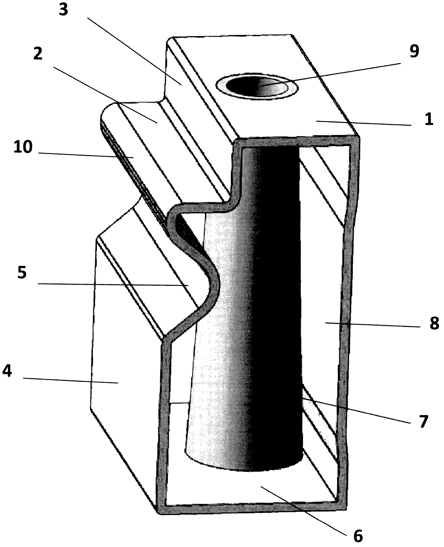 Профиль щитовой опалубки, содержащий три плоских элемента, два из которых расположены параллельно друг другу и перпендикулярно третьему, профиль в поперечном сечении имеет форму прямоугольника, три стороны которого образованы указанными элементами, на одной из протяженных сторон прямоугольника, расположенной между параллельными сторонами, выполнено углубление, расположенное примерно от середины указанной протяженной стороны в направлении короткой стороны и направленное в сторону второй протяженной стороны профиля, профиль в поперечном сечении имеет форму прямоугольника с закругленными концами, углубление выполнено в форме трапеции с равными сторонами, отличающийся тем, что от одной параллельной стороны до другой установлена конусная трубка, представляющая собой усеченный конус, основанием обращенный к самой большой по площади параллельной стороне, причем одна из параллельных сторон выполнена ступенчатой, разграниченной на две плоскости, отделенные друг от друга уступом.