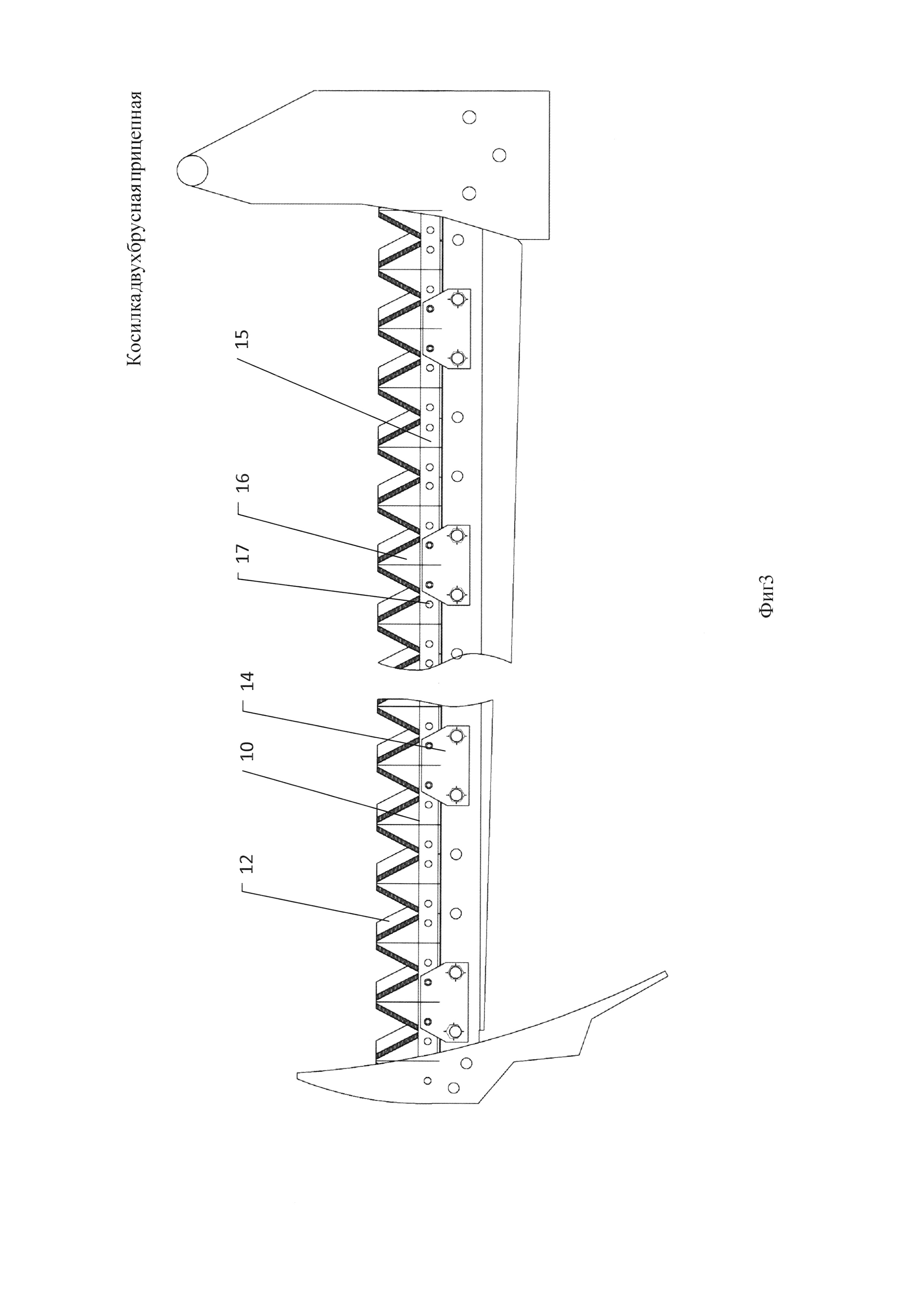 Изобретение относится к области сельскохозяйственного машиностроения, в частности, к машинам для кошения трав. Известны двухбрусные прицепные косилки, например КДП-4В и КД-Ф 4,0П (ссылка на источник информации: http://33565.kz.all.biz/kosilka-dvuhbrusnaya-pricepnaya-kdp-4v-g277649, http://www.senokosilka.ru/production/kd-f-40p). Данные косилки состоят из рамы, опирающейся на колесный ход, привода режущих аппаратов, двух режущих аппаратов, механизма сцепки с трактором, карданного вала. Недостатками этих машин являются большие габариты рамы, из-за чего имеются проблемы с перевозкой данных косилок, большой радиус разворота и невысокая производительность, недостатками пальцевых режущих аппаратов являются высокая сложность настройки и сборки, из-за нестабильных размеров (так как пальцы выполнены литыми, точность их изготовления низкая), большого количества деталей, большой вес.Сложность настройки и сборки обусловлена тем, что каждый противорежущий палец устанавливается отдельно, но из-за нестабильных размеров зазор между ножом и плоскостью пальцев различный по всему режущему аппарату. Нередки случаи заклинивания ножа, поломка сегментов, пропуски в кошении травы. Также недостатком косилок КДП-4В и КД-Ф-4,0П является большой радиус разворота из-за того, что в них применен карданный вал большой длины, выполненный телескопическим для компенсации изменения его длины при развороте. Проблема состоит в том, что при развороте длина карданного вала уменьшается до минимального, ограничивая возможный угол поворота. Задачей изобретения является создание двухбрусной прицепной косилки, свободной от указанных недостатков. Технический результат заявляемой полезной модели - повышение производительности косилки, уменьшение габаритов рамы косилки, упрощение настройки и сборки. Указанный технический результат достигается тем, что в косилке двухбрусной прицепной содержащей раму, опирающуюся на колеса, режущие аппараты, приводы режущих аппаратов, механизм сцепки рамы с трактором, карданный вал, согласно заявляемой полезной модели, рама выполнена разборной, косилка дополнительно снабжена промежуточным карданным валом, узел соединения карданного вала и промежуточного карданного вала установлен на опоре, которая расположена над механизмом сцепки рамы, а режущие аппараты выполнены беспальцевыми. На фиг. 1 показан общий вид косилки с трактором, вид сверху; на фиг. 2 показан беспальцевый режущий аппарат, вид сверху; на фиг. 3 показан беспальцевый режущий аппарат, вид снизу; на фиг. 4 показан беспальцевый режущий аппарат, поперечный разрез; на фиг. 5 показан вид А на фиг. 1, шарнир рамы, вид сзади; на фиг. 6 вид Б на фиг. 5; на фиг. 7 показан угол поворота заявляемой конструкции относительно трактора; на фиг. 8 показан угол поворота известной конструкции относительно трактора. Косилка двухбрусная прицепная (далее косилка) содержит (фиг. 1) разборную раму 1 (далее раму), опирающуюся на расположенные в задней части рамы колеса 2, разнесенные на ширину разборной рамы 1, два беспальцевых режущих аппарата 3, установленный на опоре 4 в передней части рамы 1 узел 5 соединения карданного вала 6 и промежуточного карданного вала 7. Беспальцевый режущий аппарат 3 (фиг. 2) состоит из бруса 8, закрепленных на нем наружного 9 и внутреннего 10 башмаков, нижнего ножа 11, верхнего ножа 12 и прижимов 13 верхнего ножа 12. Нижний нож 11 (фиг. 3, 4)
