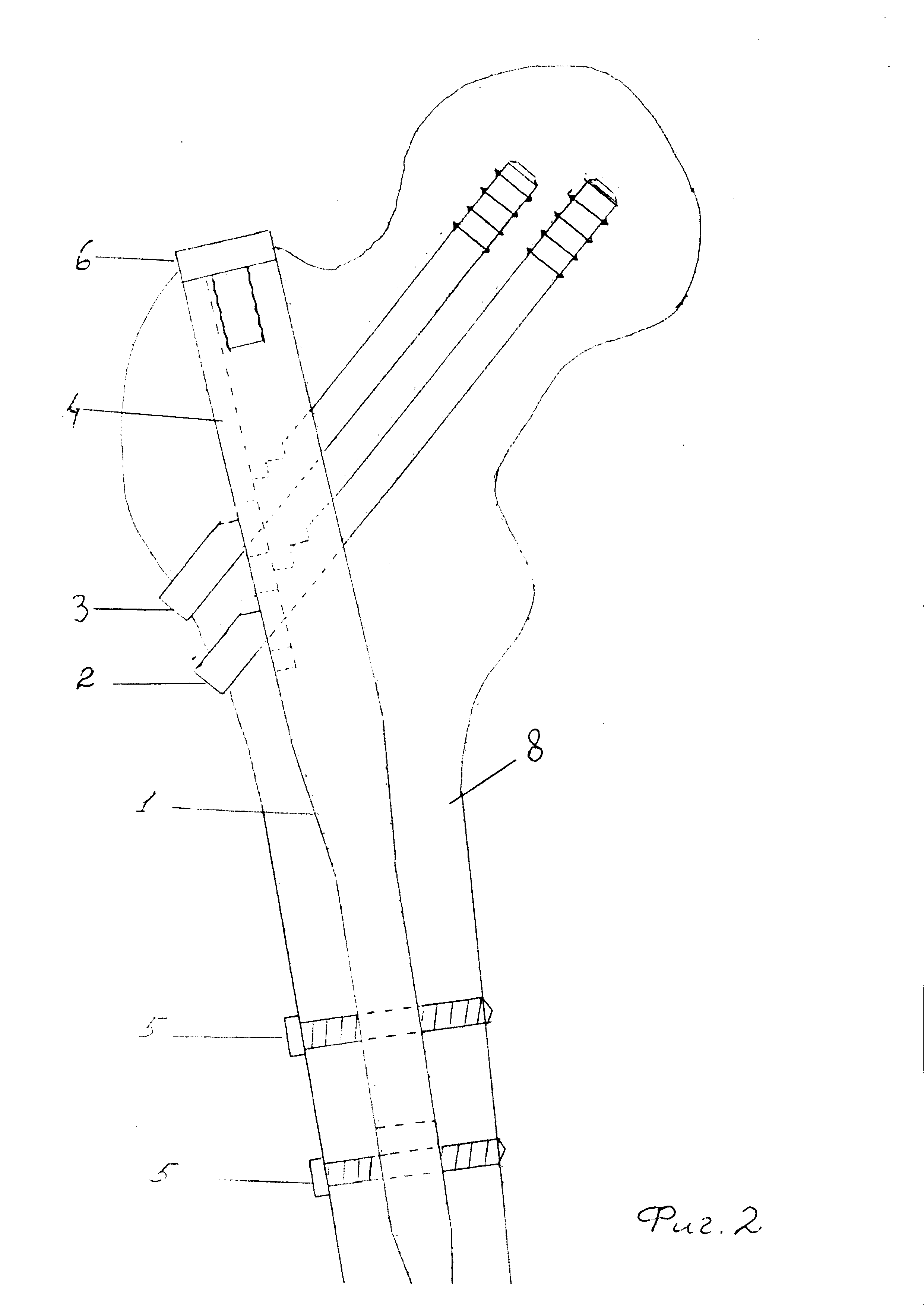 Интрамедуллярное устройство для остеосинтеза при оскольчатых переломах проксимального отдела бедренной кости, содержащее интрамедуллярный стержень с резьбовой заглушкой и установленным в нем дистальным несущим винтом и блокирующими винтами в нижней части стержня, отличающееся тем, что интрамедуллярный стержень дополнительно снабжен проксимальным несущим винтом, при этом на латеральной поверхности интрамедуллярного стержня выполнен паз для установки запорной скользящей планки с двумя отверстиями овальной формы с усеченной верхней частью, при этом форма паза и скользящей запорной планки имеют одинаковую трапециевидную форму с большим основанием к центру интрамедуллярного стержня, а оба несущих винта выполнены со ступенчатыми упорами для одновременной фиксации в соответствующих отверстиях запорной скользящей планки при компрессии резьбовой заглушки.