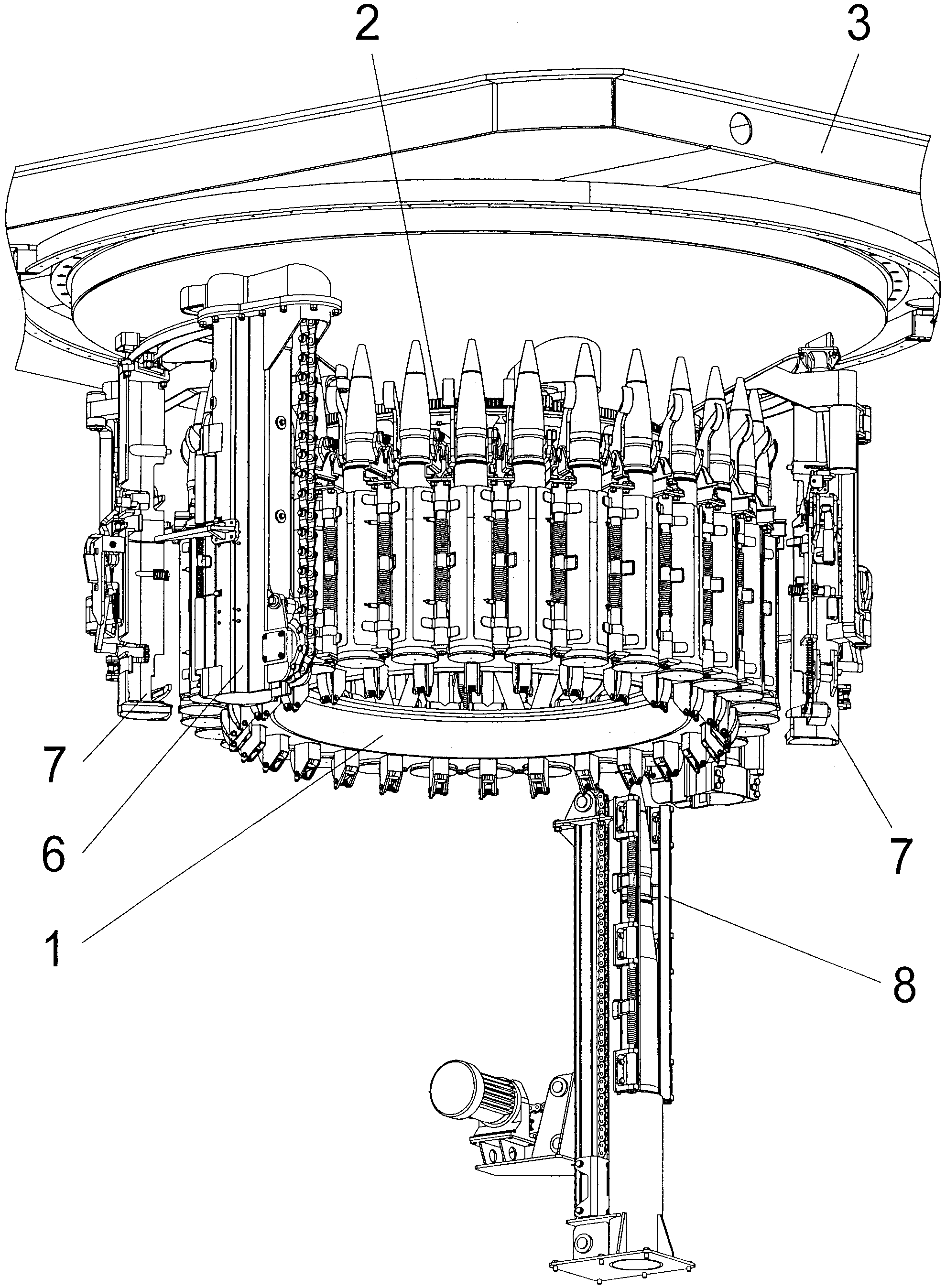 Настоящая полезная модель относится к скорострельным автоматическим корабельным артиллерийским установкам среднего калибра. Составной частью таких установок является система боепитания артиллерийского автомата, в которой подача выстрелов в боевое отделение установки производится двумя элеваторами с двух сторон артиллерийского автомата, причем готовые к автоматической стрельбе выстрелы хранятся в магазине, расположенном под станком артиллерийской установки. Известна корабельная 76 мм артиллерийская установка АК-176 (см. Артиллерийская корабельная установка АК-176, Инструкция по эксплуатации, Военное издательство Министерства обороны СССР, Москва, 1982), в которой магазин выполнен в виде двух цепных горизонтальных конвейеров, смонтированных на подвесной платформе, прикрепленной к станку снизу. Перегрузка очередного выстрела из каждого конвейера в соответствующий элеватор производится при остановленном конвейере, следовательно, весь массив выстрелов, которые загружены в магазин, разгоняется и тормозится в каждом цикле шаговой подачи. Если такую известную схему магазина применить в установке калибра 100 мм и выше, то инерционные нагрузки, возникающие в приводных механизмах магазина при высокой скорострельности артиллерийского автомата, становятся настолько значительными, что вероятность безотказной работы установки существенно снижается. Известна 127-мм одноствольная универсальная палубно-башенной артиллерийская установка Мк45 (смотри «The Naval Institute Guide To The Ships and Aircraft of the U.S. Fleet, 19th Edition» Норман Полмар), в которой магазин барабанного типа укомплектован подготовленными к немедленной стрельбе унитарными выстрелами, размещенными вертикально. Во время стрельбы магазин, расположенный в подбашенном отделении, непрерывно пополняется заряжающим устройством, к которому выстрелы подаются вручную. Элеватор, подающий выстрелы в боевое отделение установки, расположен на оси вращения станка, что типично для артиллерийских установок, имеющих невысокую максимальную скорострельность порядка 20 выстр./мин. Однако установка элеватора на оси вращения станка делает невозможной двустороннюю подачу выстрелов на качающийся артиллерийский автомат, которую широко применяют как наиболее доступный и эффективный способ боепитания скорострельного артиллерийского автомата. Известен магазин артиллерийской корабельной установки, который выбран прототипом заявляемого устройства (см. патент РФ на изобретение №2533947, опубл. 27.11.2014). Магазин этой установки содержит два элеватора, осуществляющие двустороннюю подачу выстрелов в боевое отделение установки, и два вращающихся барабана с обоймами для выстрелов, выполняющими также функцию направляющих труб упомянутых элеваторов Преимущество магазина барабанного типа в сравнении с магазином конвейерного типа определяется теми общеизвестными преимуществами, которые отличают вращательную кинематическую пару от поступательной. Но поскольку в прототипе вращающиеся барабаны используются также для направления выстрелов при подъеме их элеватором, то шаговые повороты барабанов чередуются с остановками на время подъема очередного выстрела соответствующим элеватором. Следовательно, разгоны и торможения снаряженных выстрелами барабанов и сопутствующие инерционные нагрузки имеют место та