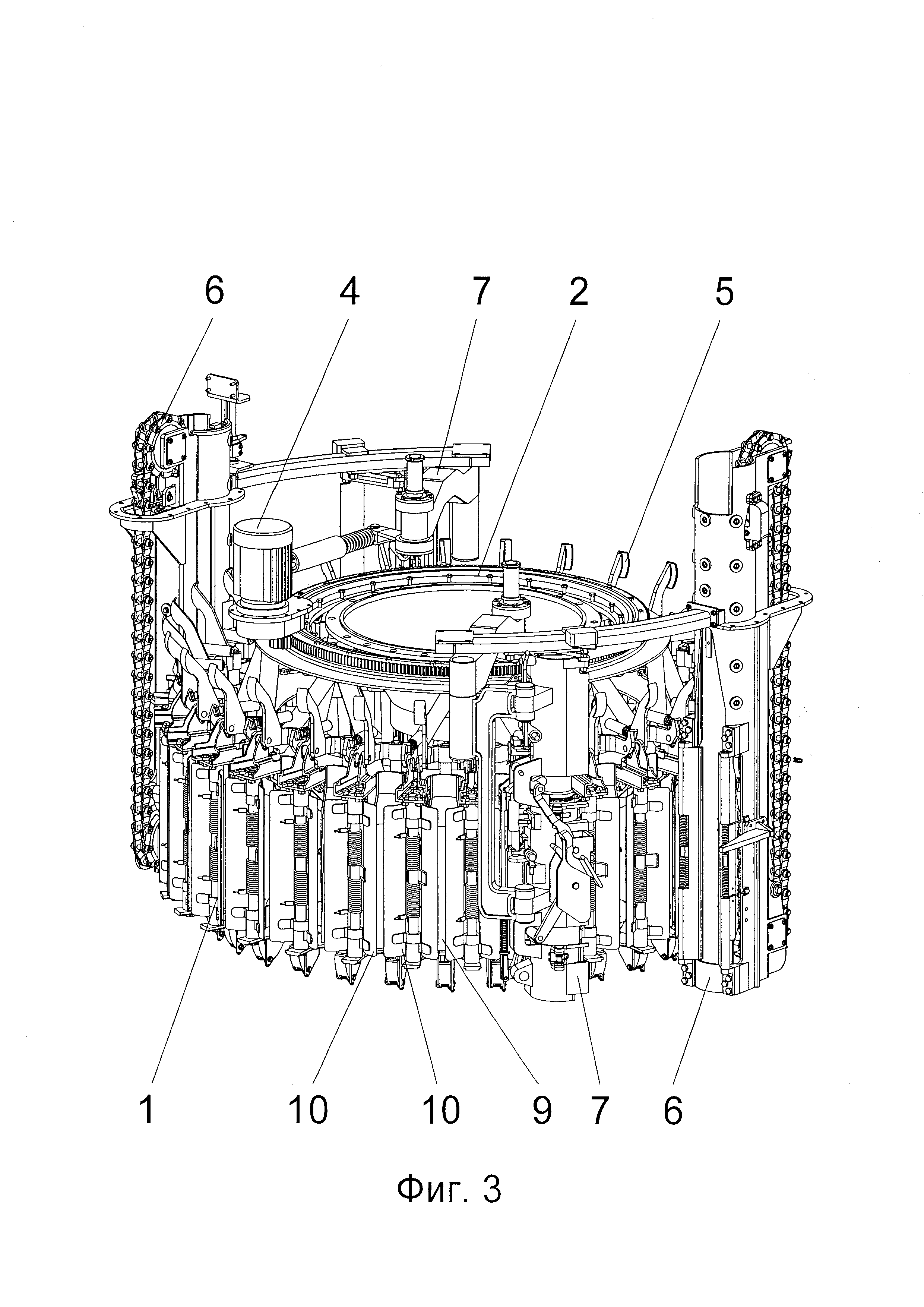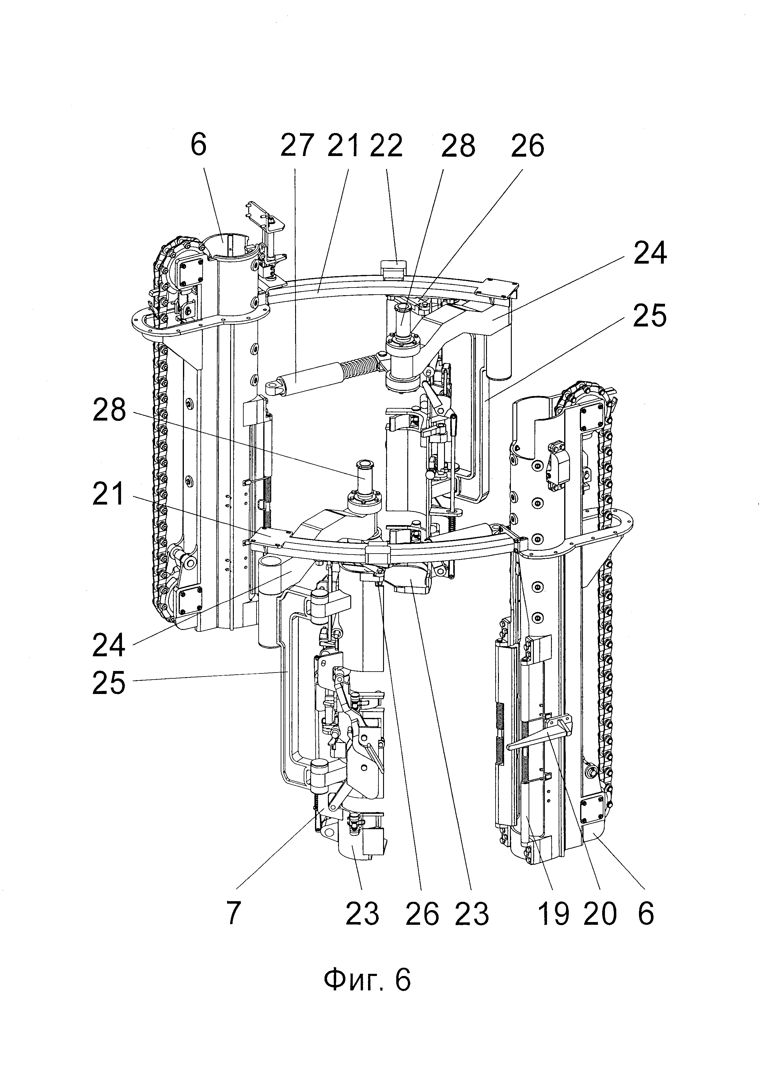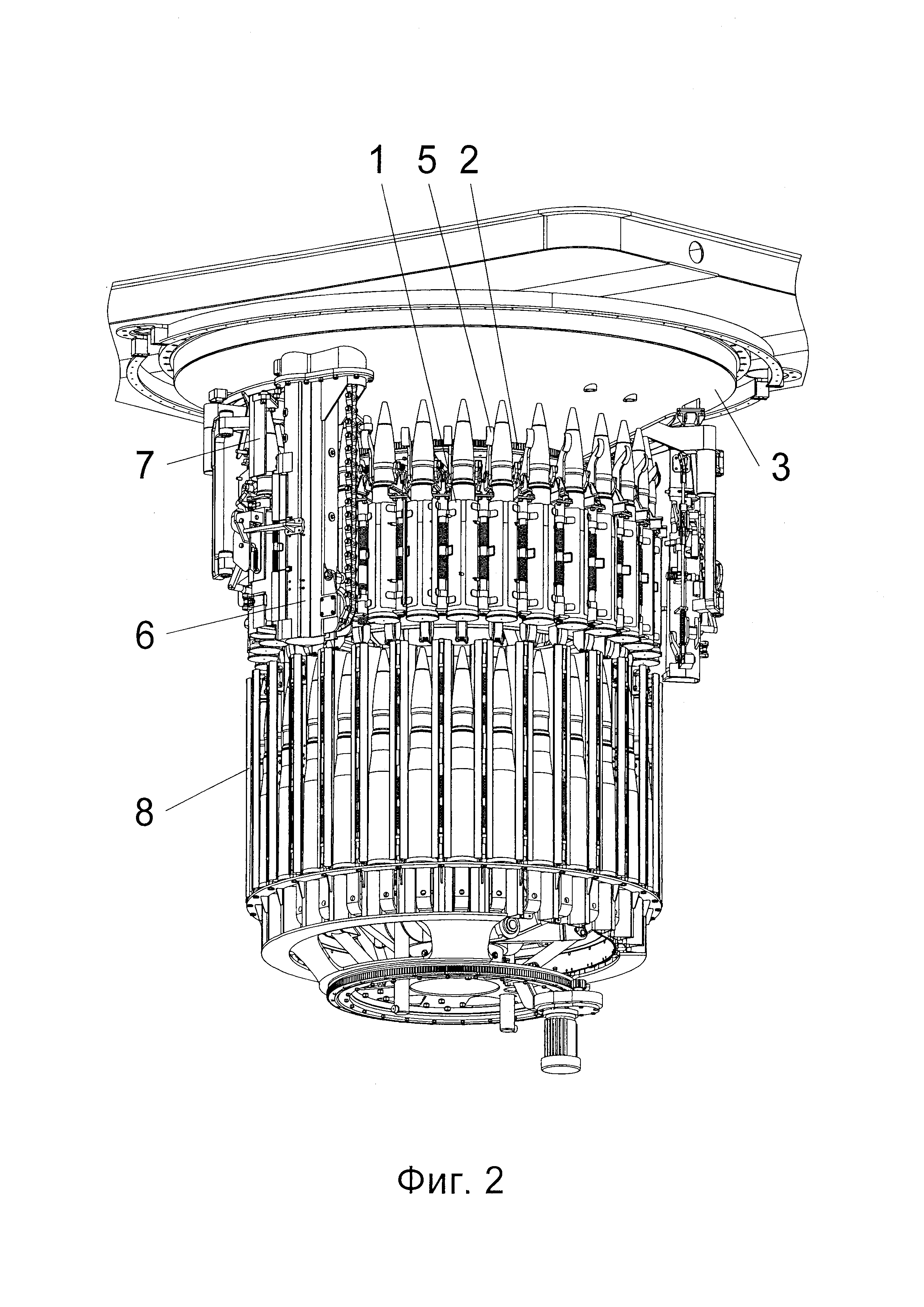 1. Магазин корабельной артиллерийской установки, содержащий вращающийся барабан и два элеватора, расположенные под станком этой установки, отличающийся тем, что он снабжён двумя перегружателями, приводом, выполненным с обеспечением непрерывного равномерного вращения этого барабана в процессе стрельбы, и устройством загрузки и пополнения боезапаса, готового к автоматической стрельбе, причём вращающийся барабан соединён со станком посредством кольцевой поворотной опоры, закреплённой на днище станка с обеспечением совмещения осей вращения этого барабана и станка, а на цилиндрической поверхности этого барабана выполнены гнёзда, в которых расположены вытеснители, соединённые с этим барабаном подвижно с обеспечением входа выстрелов в гнёзда в осевом направлении и выхода из них под действием вытеснителей в радиальном направлении, при этом перегружатели выстрелов выполнены каждый в виде четырёхзвенного коромыслово-ползунного механизма, в состав которого входят опора, закреплённая на днище станка, коромысло, шатун, ползун и неподвижно соединённая с ползуном перегрузочная обойма, которая оснащена механизмом воздействия на вытеснители вращающегося барабана, опорно-сцепным механизмом и захватно-вытесняющим механизмом, причём оси шарниров, соединяющих между собой звенья четырёхзвенного коромыслово-ползунного механизма, расположены вертикально, ползун установлен в направляющей, которая выполнена с обеспечением кругового перемещения перегрузочной обоймы вокруг вращающегося барабана, опорно-сцепной механизм выполнен с обеспечением сцепления этой обоймы с непрерывно вращающимся барабаном, их совместно