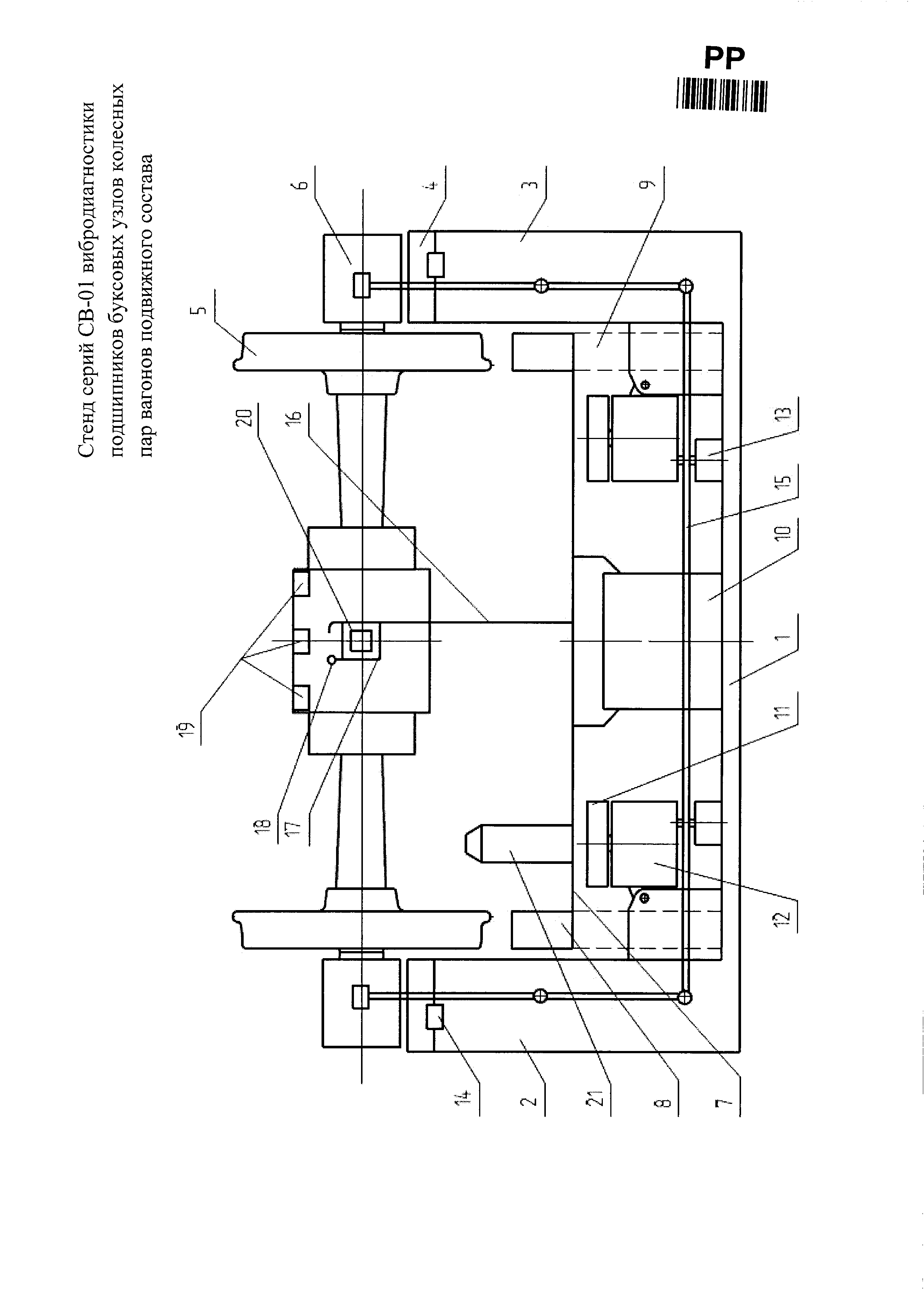 Полезная модель относится к железнодорожному транспорту и может быть использована для выявления дефектов (неисправностей) в подшипниках буксовых узлов колесных пар вагонов подвижного состава, и в подшипниках и зубчатых передачах редукторов колесных пар вагонов подвижного состава с помощью измерений виброаккустических сигналов и их анализа на основе использования компьютерных технологий. Известен комплекс вибродиагностики буксовых узлов колесных пар подвижного состава, содержащий раму с опорными стойками, подъемное устройство для вывешивания колесной пары, механизм разгона колесной пары, ролики, закрепленные на валах электродвигателей, пневмоцилиндры для подведения роликов к колесной паре, вибропреобразователи, соединенные с измерительной системой и средство осевого нагружения колесной пары /Патент РФ №2053348, кл. Е21В 41/02, 1996/. Известный комплекс вибродиагностики буксовых узлов колесных пар по совокупности существенных признаков является наиболее близким к заявляемой полезной модели и выбран в качестве ближайшего аналога. Недостатком аналога является невозможность диагностирования колесных пар с редуктором, обусловленная отсутствием устройства для фиксации редуктора колесной пары вагона подвижного состава. Техническим результатом предлагаемой полезной модели является улучшение технических характеристик стенда, за счет увеличения типов диагностируемых колесных пар, в том числе с редуктором. Указанный технический результат достигается тем, что в стенде серий СВ-01 вибродиагностики подшипников буксовых узлов колесных пар вагонов подвижного состава, содержащем раму с опорными стойками, устройство подъема и вывешивания колесной пары, механизм разгона колесной пары с двигателями на валах которых закреплены ролики, подводимые к колесной паре пневмоцилиндрами, механизм осевого нагружения, создающий усилие на буксовые подшипники колесных пар и вибродатчики для выявления дефектов подшипников буксовых узлов колесных пар, соединенные с измерительной системой, введено устройство для фиксации редуктора колесной пары вагона подвижного состава. Кроме того стенд снабжен дополнительными вибродатчиками, размещаемыми на корпусе редуктора, для выявления дефектов подшипников и зубчатой передачи редуктора колесной пары вагона подвижного состава. Устройство для фиксации редуктора колесной пары вагона подвижного состава, может быть выполнено в виде опоры содержащей полку, в которую помещается хвостовик редуктора, закрепляемый с помощью фиксатора. Устройство для фиксации редуктора колесной пары вагона подвижного состава, может быть выполнено в виде вертикально расположенного стержня с конусом в верхней его части, на который насаживается кронштейн редуктора. Полезная модель поясняется чертежом, на котором изображен общий вид стенда серий СВ-01 вибродиагностики подшипников буксовых узлов колесных пар вагонов подвижного состава. Стенд содержит раму 1, жестко связанные с ней опорные стойки 2 и 3, в верхней части которых расположены амортизационные площадки 4, на амортизационные площадки 4 устанавливается колесная пара 5 своими буксами 6. На чертеже показана колесная пара 5 с редуктором в средней части оси. На стенд также можно устанавливать колесную пару без редуктора (на чертеже не показана), или колесную пару