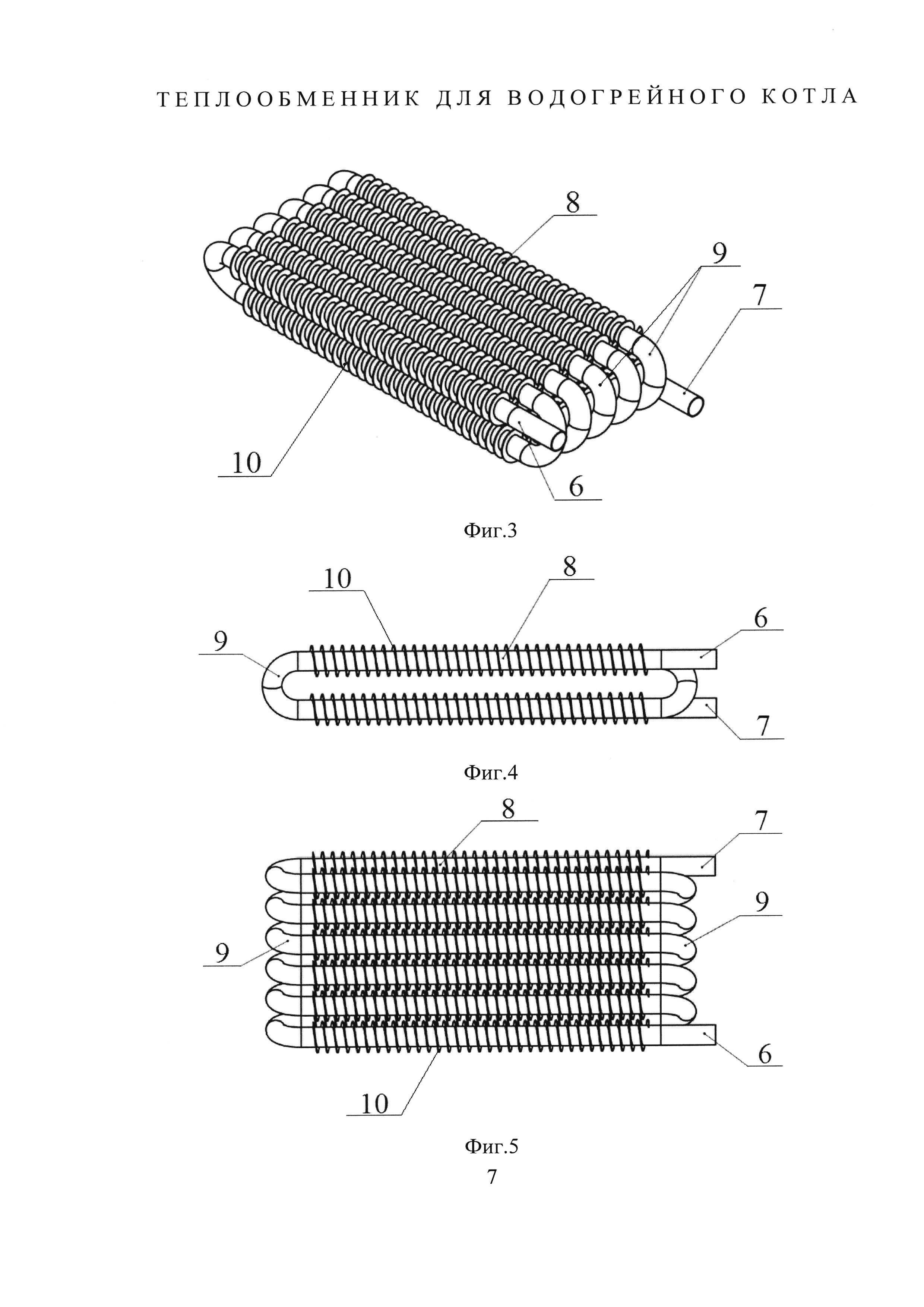 Полезная модель относится к области теплоснабжения, а именно, к теплообменникам для водогрейных котлов и может быть использована при отоплении жилых домов, зданий коммунального бытового и производственного назначения, имеющих систему отопления с теплоносителем. Из уровня техники известен теплообменник для водогрейного котла, выполненный в виде змеевика, снабженного патрубками подвода и отвода и образованного горизонтальными трубами, расположенными по высоте, по крайней мере, в два параллельных ряда в шахматном порядке и соединенными посредством отводов (см. патент RU 2477824, кл. F24H 1/40, опубл. 20.03.2013). Недостатками данного устройства являются малая поверхность теплообмена и, как следствие, невысокий КПД водогрейного котла, в котором оно установлено. Задачей полезной модели является устранение указанных недостатков. Технический результат заключается в повышении эффективности теплообмена. Поставленная задача решается, а технический результат достигается тем, что в теплообменнике для водогрейного котла, выполненном в виде змеевика, снабженного патрубками подвода и отвода и образованного горизонтальными трубами, расположенными по высоте, по крайней мере, в два параллельных ряда в шахматном порядке и соединенными посредством отводов, на каждой трубе выполнено оребрение в виде единой стальной ленты, закрепленной боковой стороной на трубе вдоль винтовой линии. На фиг. 1 представлен общий вид водогрейного котла; на фиг. 2 - вид спереди на водогрейный котел со снятым корпусом; на фиг. 3 - общий вид предлагаемого теплообменника; на фиг. 4 - то же, вид сбоку; на фиг. 5 - то же, вид сверху. Предлагаемый теплообменник 1 предназначен для водогрейного котла, включающего корпус 2, расположенную в нем топку с горелками 3 и экранирующими панелями 4 и газоход 5. Теплообменник 1 выполнен в виде змеевика с патрубком 6 подвода и патрубком 7 отвода воды. Змеевик образован горизонтальными оребренными трубами 8 круглого сечения из углеродистой или легированной стали, расположенными по высоте, по крайней мере, в два параллельных ряда в шахматном порядке. Трубы 8 соединены в змеевик посредством отводов 9. Концы труб 8 установлены в передней и задней экранирующих панелях 4 с возможностью перемещения относительно них при нагреве или охлаждении. Отводы 9, а также патрубки 6, 7 выведены за пределы топки, ограниченной панелям 4. На каждой трубе выполнено оребрение в виде единой ленты 10 из углеродистой или легированной стали, закрепленной посредством высокочастотной сварки боковой стороной на трубах 8 вдоль винтовой линии. За счет такого выполнения оребрения горячие газы, идущие от горелки, закручиваются вдоль поверхности труб 8, тем самым увеличивая эффективность теплообмена (в поглощении теплоты участвует не только оребрение, но и сама поверхность трубы 8) и улучшая аэродинамическое характеристики теплообменника 1. Лента 10 каждой трубы 8 проходит в промежутке между оребрением соседних труб (см. фиг. 5), тем самым уменьшая габариты теплообменника. Предлагаемый теплообменник работает в водогрейном котле следующим образом. Сетевая вода через патрубок подвода 6 поступает в трубы 8 теплообменника 1. Пройдя последовательно по трубам 8, нагретая вода через патрубок отвода 7 подается потребителю. Трубы 8 установлены с возможностью перемещения относительно экранирующих