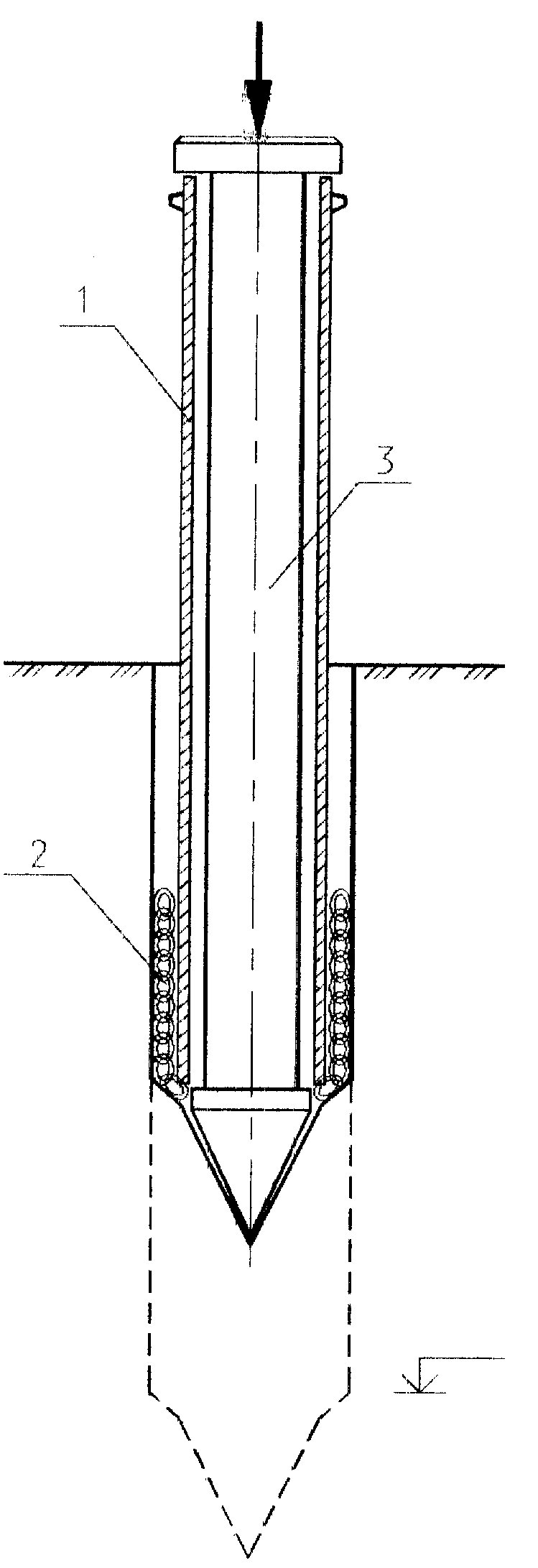 Устройство для возведения набивной сваи Полезная модель относится к строительству, а именно к возведению свайных фундаментов. Известно устройство для изготовления набивной сваи, содержащее обсадную трубу с теряемым башмаком, пробкой с кольцевой полостью и конической крышкой, днищем из фильтрующего материала, бетоноводом и водоотводящей трубой, снабженных обратными клапанами. (Авторское свидетельство №966156, кл. Е02Д 5/38, У02Д 7/00,1982). Недостатком данного устройства является сложность конструкции. Наиболее близким аналогом является устройство для возведения набивной сваи, содержащее обсадную трубу, с установленной в ее полости фильтр}тощей пробкой, башмак и привод ногрз ения. (Авторское свидетельство №1224381, RV, кл. Е02Д 5/38, 5/42, 1986.). Недостатком данного устройства является наличие фильтрующей пробки, теряемого башмака и подпр жиненных фиксаторов. Технический результат предполагаемой полезной модели является упрощение конструкции устройства сваи без снижения прочности и несущей способности набивной сваи. Задача решается за счет того, что обсадная труба вьшолнена с цепями закрепленными по периметру нижнего торца обсадной трубы и во jOOOl 12170 Е02Д 5/38, 5/42 внутреннюю полость обсадной трубы вставлен остроконечный металлический сердечник. Причинно-следственная связь между совокупностью существенных признаков заявляемой полезной модели и достигаемым результатом заключается в следующем. Использование закрепленных цепей по периметру нижнего торца обсадной трубы позволяет создать зазор между обсадной трубой и стенкой скважины, что облегчает извлечение обсадной трубы из скважины. Применение остроконечного металлического сердечника позволяет исключить фильтрующлю пробку, теряемый башмак и подпружиненные фиксаторы из известного устройства, что приводит к упрощению конструкции устройства сваи без снижения прочности и несущей способности набивной сваи. Па фиг. I изображено устройство в момент образования скважины, на фиг. 2 - устройство в момент бетонирования скважины. Устройство состоит из обсадной трубы 1 с цепями 2, закрепленными но периметру нижнего торца обсадной трубы 1 и во внутреннюю полость обсадной трубы 1, вставлен остроконечный металлический сердечник 3. Устройство работает след тощим образом. Обсадная труба 1 с цепями 2 и с остроконечным металлическим сердечником 3, погружается гидромолотом в грунт до требуемой отметки для образования уплотненной скважины. Затем металлический сердечник 3 извлекается из обсадной трубы 1 и в обсадную трубу 1 устанавливается арматурный каркас 4 для армирования сваи. Обсадная труба 1 занолняется сухой бетонной смесью 5 с необходимым количеством воды и извлекается из скважины. При этом бетонная смесь заполняет образовавшуюся скважину. Образованный зазор цепями 2 между обсадной трубой 1 и стенкой скважины облегчает извлечение обсадной трубы 1 из скважины. В результате увлажнения сухой бетонной смеси и ее дальнейшего схватывания происходит уплотнение и твердение бетона в скважине. Предложенное устройство упрощает технологию возведения набивной сваи без снижения прочности и несуш;ей способности набивной сваи.