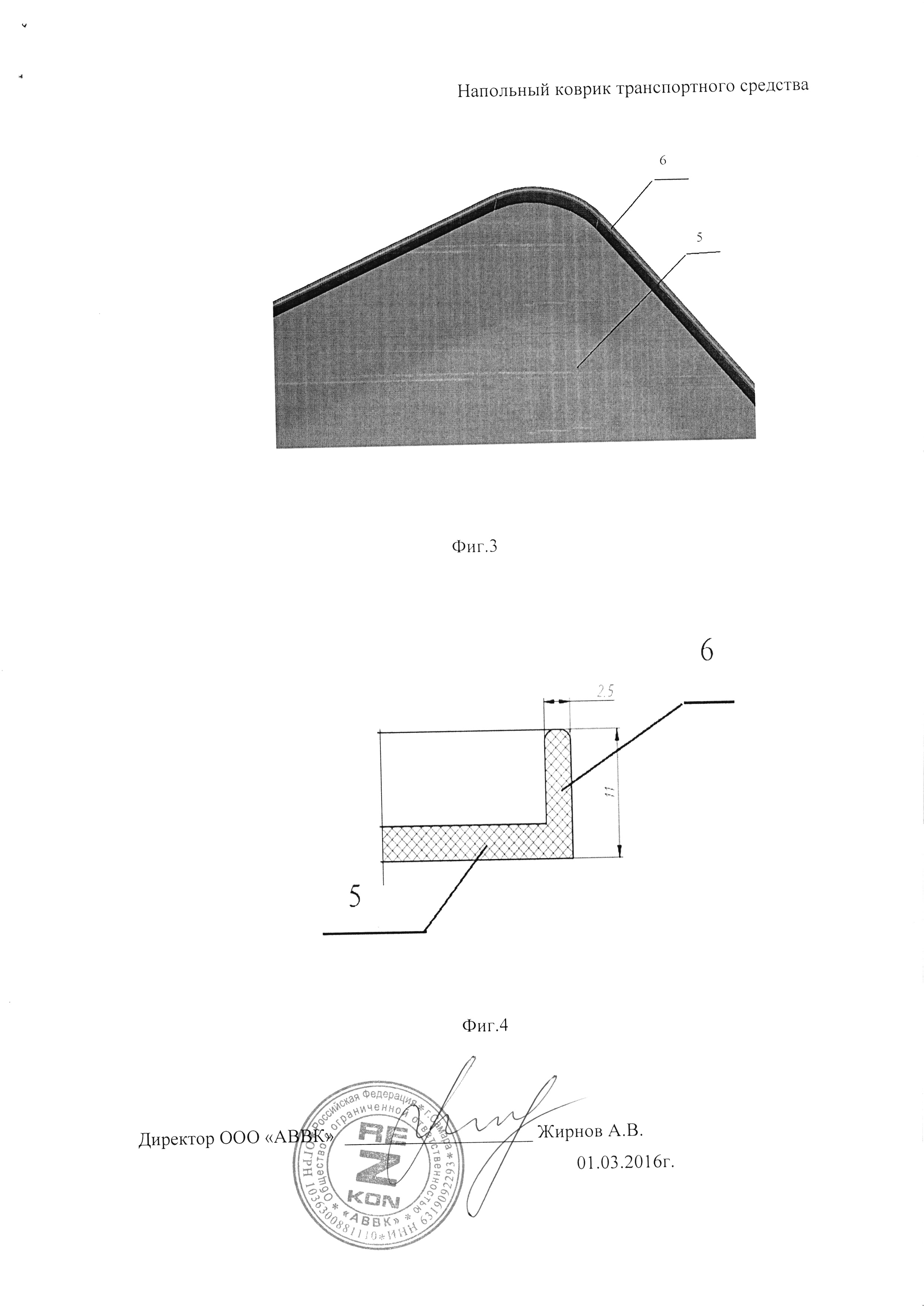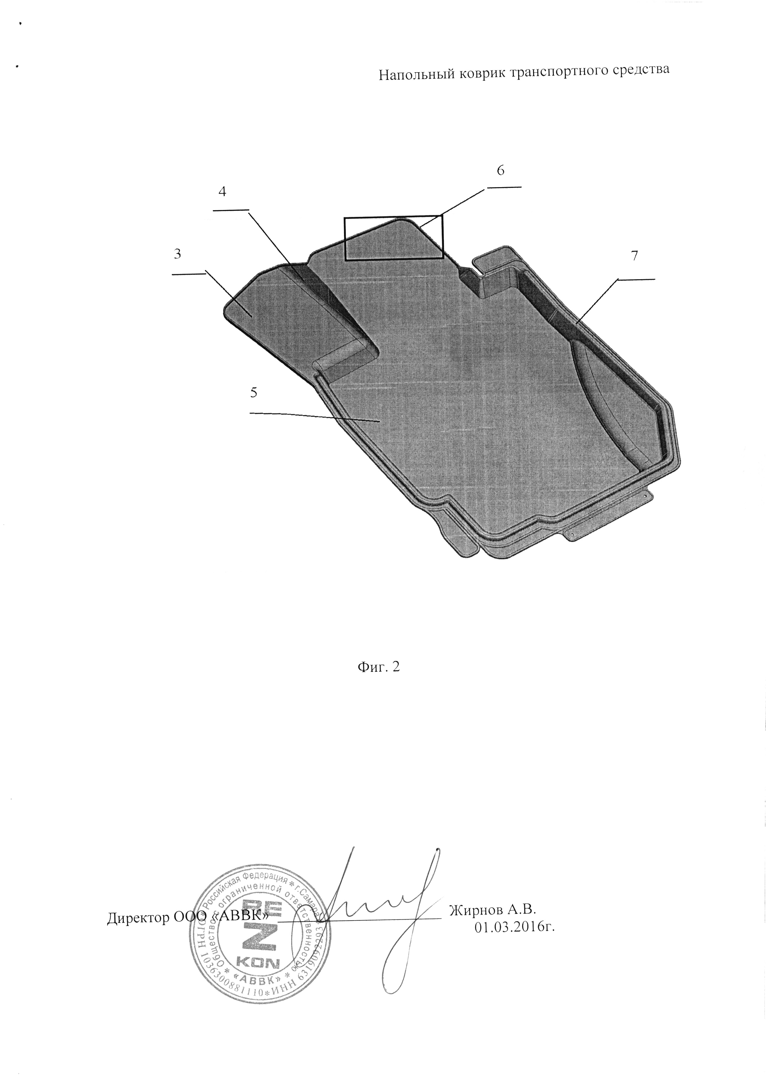 1. Напольный коврик транспортного средства, содержащий эластичную водонепроницаемую основу, при этом водонепроницаемая основа представляет собой основную поверхность, снабженную язычком для рабочей поверхности площадки отдыха ноги водителя, и перемычку, соединяющую язычок с основной поверхностью коврика, отличающийся тем, что основная поверхность содержит бортик в передней и части боковой сторон периметра, имеющий высоту не более 13 мм и ширину не более 4,5 мм.2. Коврик по п. 1, отличающийся тем, что язычок для рабочей поверхности площадки отдыха ноги водителя и перемычка, соединяющая язычок с основной поверхностью коврика, также содержат бортик, имеющий высоту не более 13 мм и ширину не более 4,5 мм.3. Коврик по п. 1, отличающийся тем, что содержит ворсовый вкладыш.4. Коврик по п. 3, отличающийся тем, что вкладыш закреплен к водонепроницаемой основе кнопками.5. Коврик по п. 3, отличающийся тем, что вкладыш содержит противоскользящую вставку в области работы ног водителя.6. Коврик по п. 3, отличающийся тем, что вкладыш выполнен из полипропиленового волокна и обработан по краю кантом.7. Коврик по п. 1, отличающийся тем, что водонепроницаемая основа изготовлена из резиновых смесей на основе синтетического каучука.8. Коврик по п. 1, отличающийся тем, что основная поверхность водонепроницаемой основы по задней и частично боковым сторонам периметра содержит борт.