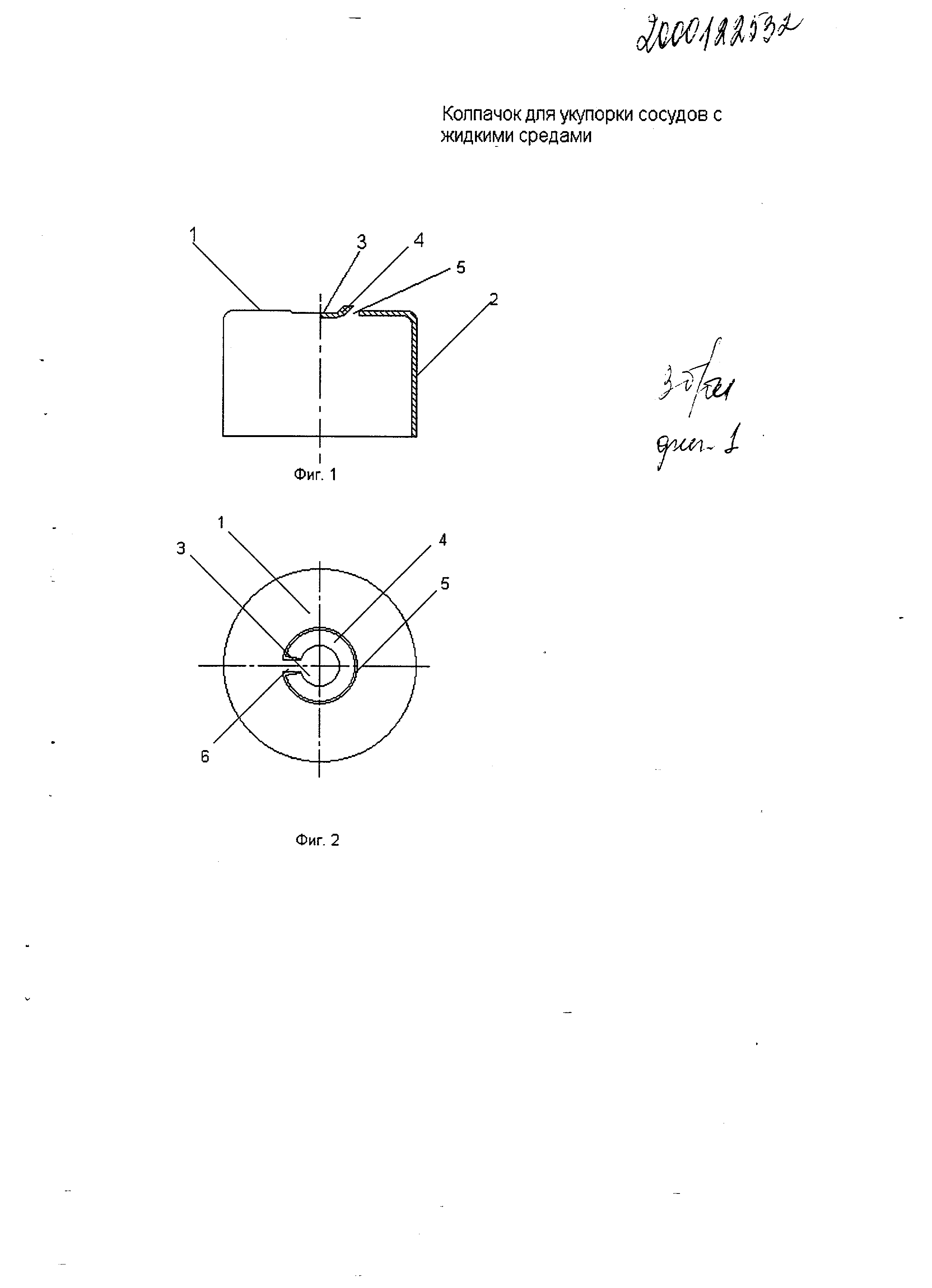 1. Колпачок для укупорки сосудов с жидкими средами, содержащий цилиндрическую часть и донышко, на котором размещен отрываемый участок, отличающийся тем, что отрываемый участок выполнен в виде замкнутого сквозного паза, соединенного с донышком, по крайней мере, одной перемычкой, при этом кромки отрываемого участка приподняты вверх, а диаметр отрываемого участка донышка составляет 1/3-2/3 диаметра крышки. 2. Устройство по п.1, отличающееся тем, что отрываемый участок образован одной сквозной прорезью и одной перемычкой. 3. Устройство по п.1, отличающееся тем, что отрываемый участок образован двумя сквозными прорезями и двумя перемычками. 4. Устройство по п.1, отличающееся тем, что отрываемый участок образован тремя сквозными прорезями и тремя перемычками.