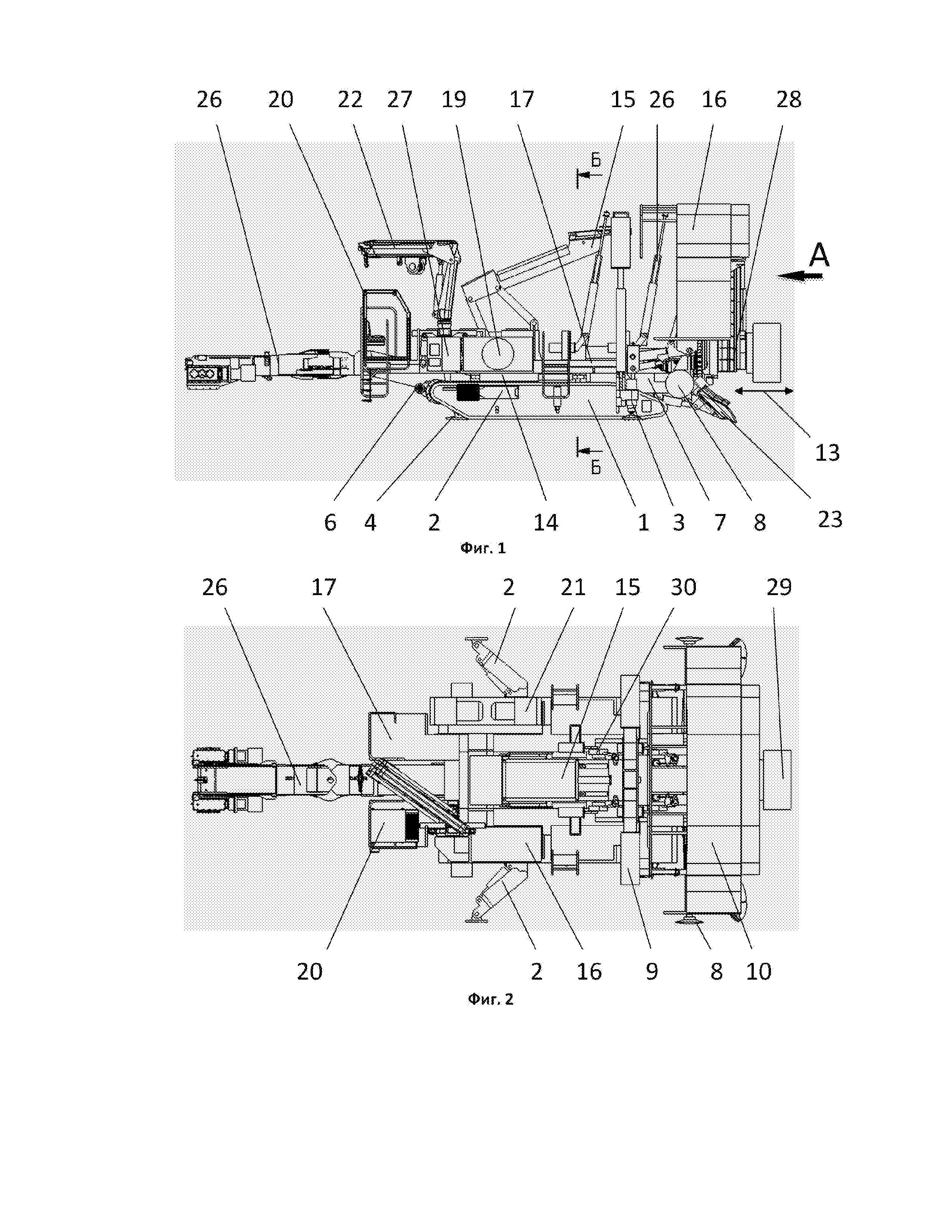 • После завершения процесса забуривания и обработки забоя на минимальном вылете разрушающей коронки 29, не останавливая работу ИО 28, происходит опускание погрузочного стола (питателя) 23 на почву для создания дополнительной опоры и выдвижение боковых распоров 8 подающего стола 7 в стороны (до контакта их с боковыми породами) для стабилизации ИО 28 и подающего стола 7 относительно боковых пород горной выработки, затем включаются на выдвижение гидроцилиндры телескопирования ИО 28 плавно переводя траекторию движения центра разрушающей коронки 29 на новый вылет/диаметр. Скорость подачи и резания разрушающей коронки 29 регулируются в зависимости от крепости обрабатываемых пород, обеспечивая максимальную производительность при соблюдении номинального режима нагружения двигателя привода резания разрушающей коронки 29.