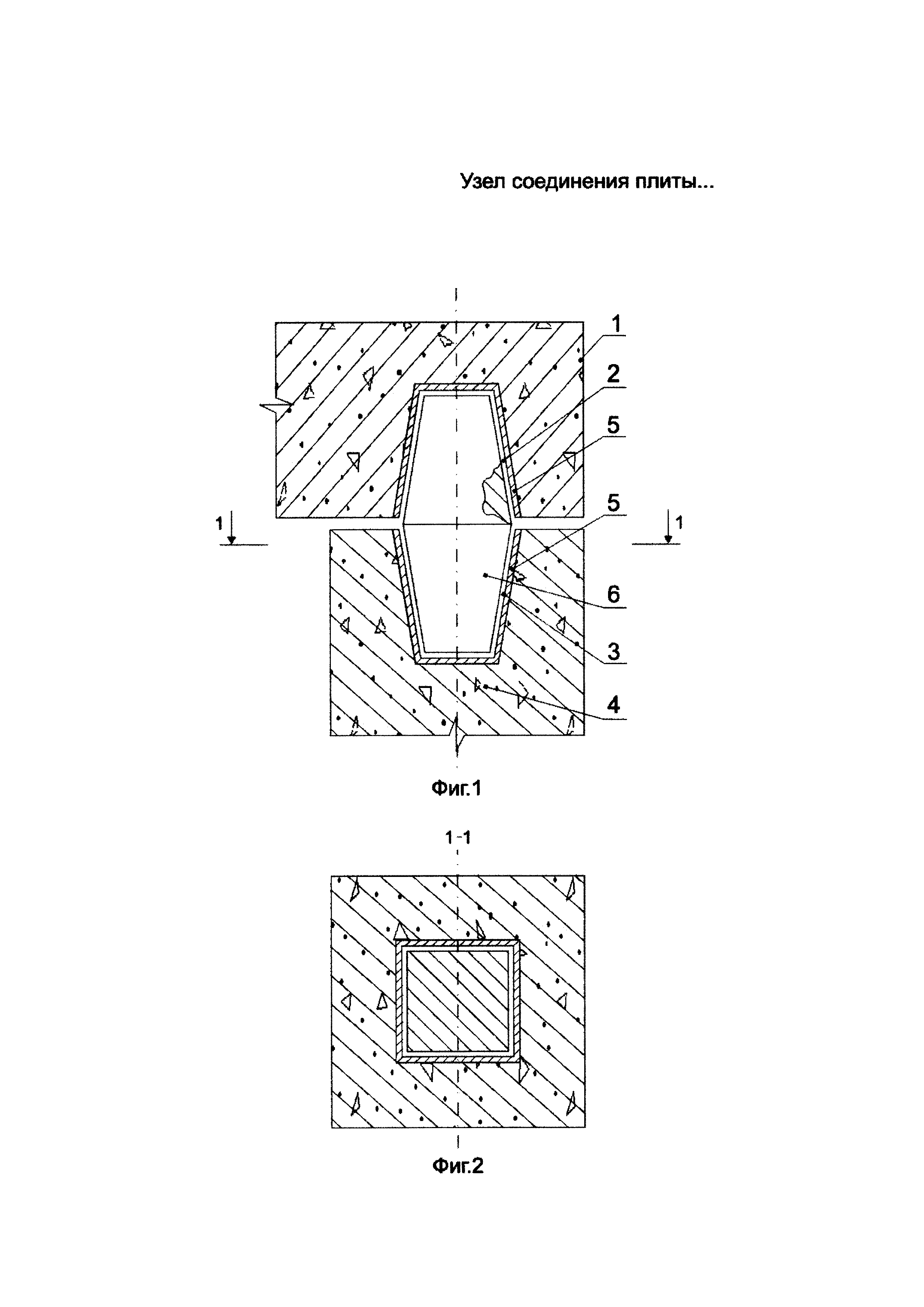 Полезная модель относится к области строительства, а именно к соединению панелей и плит перекрытия в панельных домах. Известно стыковое соединение сборных железобетонных элементов, включающее арматурные выпуски из приторцованных граней стыкуемых элементов, насаженных на выпуски части стяжной муфты стаканного типа с отверстиями в донышках, размещенные с зазором головки с опорными поверхностями донышек муфт, при этом часть насаженных головок имеет коническую торцевую поверхность, а наружная грань донышка муфты имеет скосы по кромкам диаметральной прорези (см. авторское свидетельство №1557277, МПК Е04В 1/38). Недостатком такого соединения является сложность его изготовления из-за наличия большого количества технологических операций. Кроме того, перед каждым выполнением соединения требуется проведение расчетных вычислений. Известно также стыковое соединение стеновых панелей с панелями перекрытий, включающее опорные участки панелей перекрытий, ниши в торцовых гранях стеновых панелей и фиксаторы с размещенными в нишах и выполненными в форме усеченного конуса концами, при этом в опорных участках панелей перекрытий выполнены симметрично расположенные прорези в форме ласточкиного хвоста, а средняя часть каждого фиксатора - в виде размещенной в прорезях и выполненной в форме спаренного ласточкиного хвоста шпонки (см. авторское свидетельство №796346). Однако такое соединение сложно в изготовлении и монтаже, из-за необходимости выполнения в панелях перекрытий прорезей в форме ласточкиного хвоста и срединной части каждого фиксатора - в виде шпонки в форме спаренного ласточкиного хвоста. Технической задачей является снижение трудоемкости изготовления и монтажа. Это достигается тем, что в узле соединения плиты перекрытия и стеновой панели, включающей опорные участки плиты перекрытий с нишами, ниши в торцовых гранях стеновых панелей и размещенный в нишах соединительный элемент, последний образован из двух усеченных пирамид, совпадающих большими основаниями, а внутренние поверхности ниш плиты перекрытия и торцовой грани стеновой панели выполнены ответными наружной поверхности частей соединительного элемента. На приведенном чертеже на фиг. 1 изображен узел соединения плиты перекрытия и стеновой панели - продольный разрез, на фиг. 2 - сечение 1-1. Узел соединения плиты перекрытия и стеновой панели состоит из плиты перекрытия 1, содержащей нишу 2 и нишу 3 в стеновой панели 4, металлических закладных элементов 5 и металлического соединительного элемента 6. Плита перекрытия 1 и стеновая панель связаны между собой металлическим соединительным элементом 6, выполненным в виде двух совпадающих большими основаниями усеченных правильных пирамид. Ниши 2 и 3 в плите перекрытия 1 и стеновой панели 4 размещены соосно и их внутренние поверхности выполнены ответными наружной поверхности частей соединительного элемента. Такое размещение обеспечивает плотное соединение сопрягаемых конструкций и плавность стыковки при монтаже. Для облегчения веса соединительный элемент может быть выполнен пустотелым. Монтаж осуществляется следующим образом. На фундаментную часть здания устанавливают стеновые панели 4, в нишах которых закреплены при их изготовлении закладные элементы 5. После выверки стеновых панелей 4 в проектном положении в закладные э