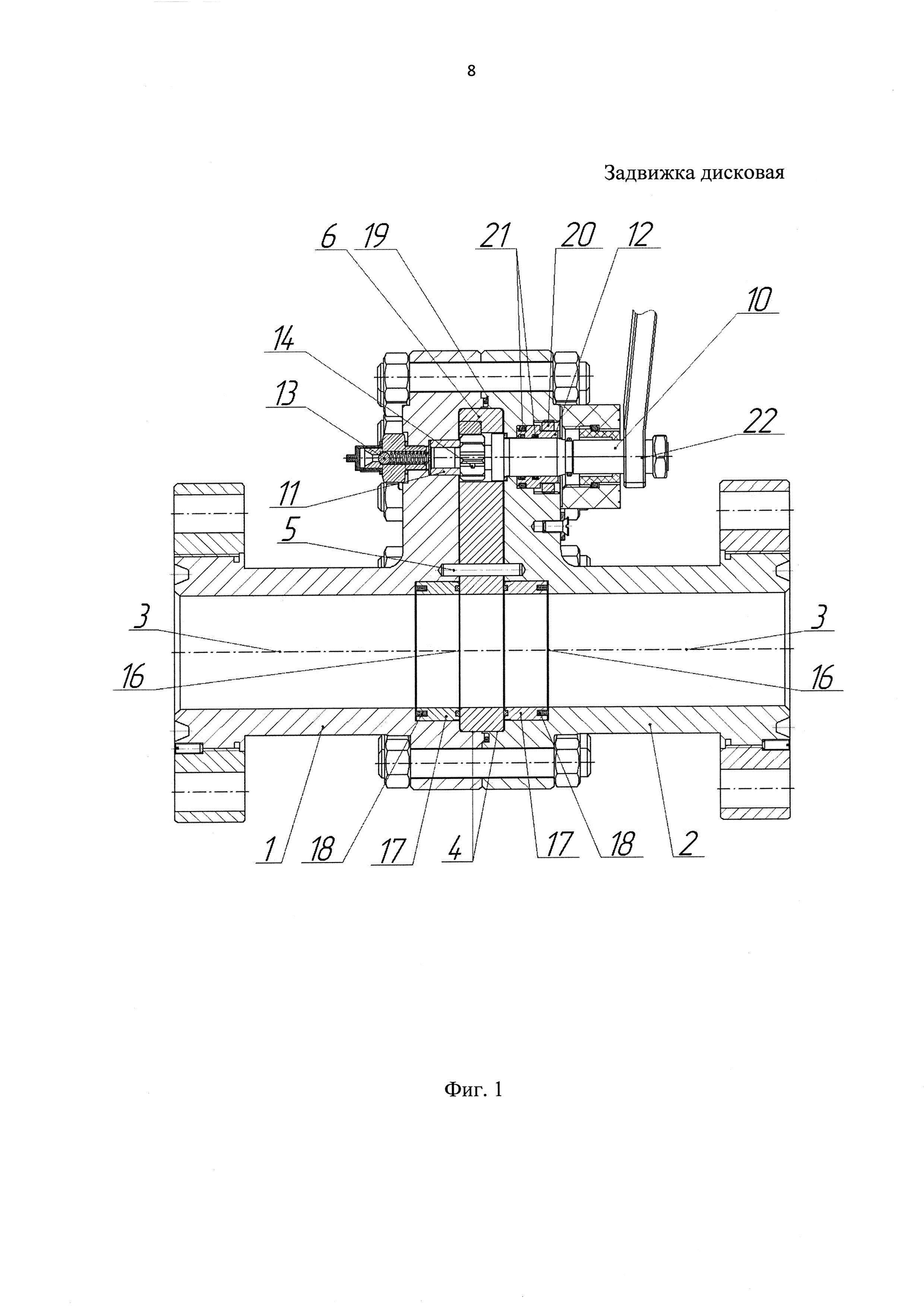 Полезная модель относится к области нефтяного и химического машиностроения и может быть использована в качестве запирающего и регулирующего устройства на трубопроводах и каналах скважин.Задвижка дисковая содержит корпус из двух соединенных между собой полукорпусов, образующих осевой канал, между которыми в цилиндрических радиусных расточках размещен дисковый шибер с осевым отверстием, с закрепленным в его дуговой радиусной расточке зубчатым венцом, с возможностью взаимодействия с зубьями шестерни приводного вала, установленного в полукорпусах, и связанного с устройством вращения приводного вала для открытия-закрытия шибера, причем дисковый шибер закреплен на оси вращения, установленной между полукорпусами. Цилиндрические радиусные расточки в полукорпусах выполнены симметрично, механизм вращения приводного вала для открытия - закрытия шибера выполнен в виде храпового механизма, а приводной вал закреплен на втулках, установленных в полукорпусах.Изготовление полукорпусов с симметричными цилиндрическими радиусными расточками упрощает конструкцию и повышает технологичность их изготовления, позволяет унифицировать конструкцию и технологию изготовления дисковой задвижки.