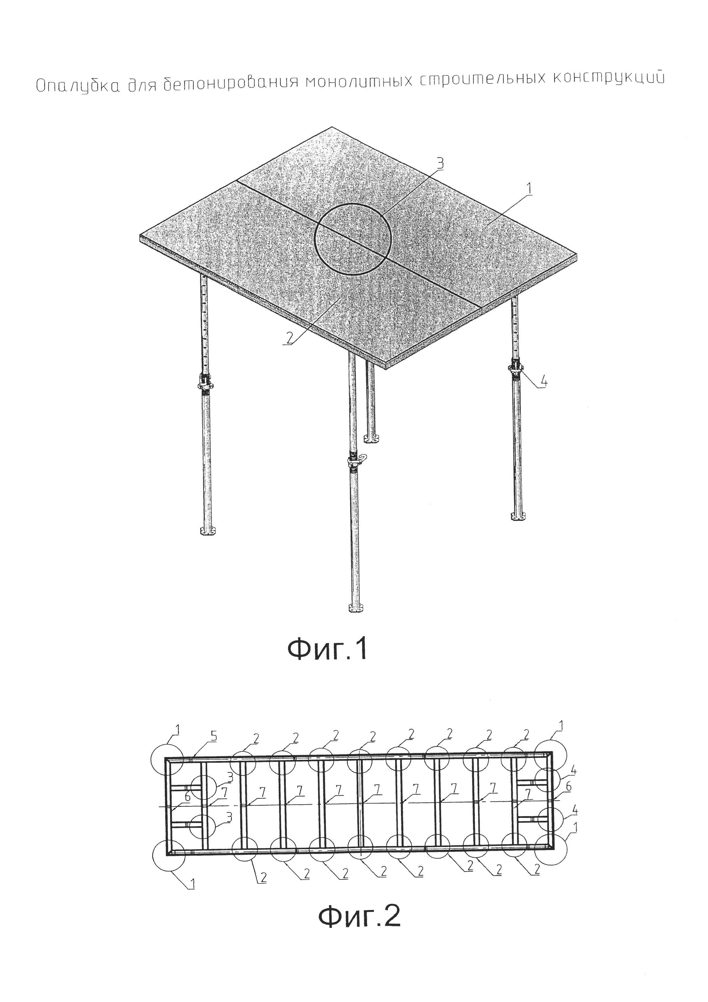 1. Опалубка для монолитного бетонирования строительных конструкций (перекрытий, стеновых конструкций, лестничных маршей), включающая опоры, прямоугольные опалубочные щиты с каркасом из предварительно напряженного трубчатого профиля и палубой, отличающаяся тем, что каркас опалубочного щита состоит из предварительно напряженных продольных балок, жестко соединенных по периметру щита с поперечными балками посредством размещенных внутри профиля каркаса и соразмерных с ним полых вставок, при этом по углам прямоугольного щита продольная и поперечная балки соединены с помощью углового соединительного элемента, на котором с одной стороны элемента зафиксирована предварительно-напряженная арматура продольной балки, а с другой стороны элемента в поперечной балке зафиксирован стопорный винт, а в пролете промежуточные поперечные балки соединены с продольными балками посредством полых вставок, размещенных в полости поперечных балок, с помощью соединительного винта, причем каркас выполнен из алюминиевого трубчатого профиля с возможностью обеспечения расчетного строительного подъема щита опалубки при натяжении предварительно напряженной арматуры и фиксации ее на угловых соединительных элементах. 2. Опалубка по п. 1, отличающаяся тем, что угловой соединительный элемент каркаса выполнен в виде полого профиля, стороны которого расположены под прямым углом и соразмерны внутреннему профилю балок, и имеет на одной из сторон утолщение для стопорного винта. 3. Опалубка по п. 1, отличающаяся тем, что полая вставка, размещенная в полости поперечной балки, имеет выемку и снабжена стопорным винтом.