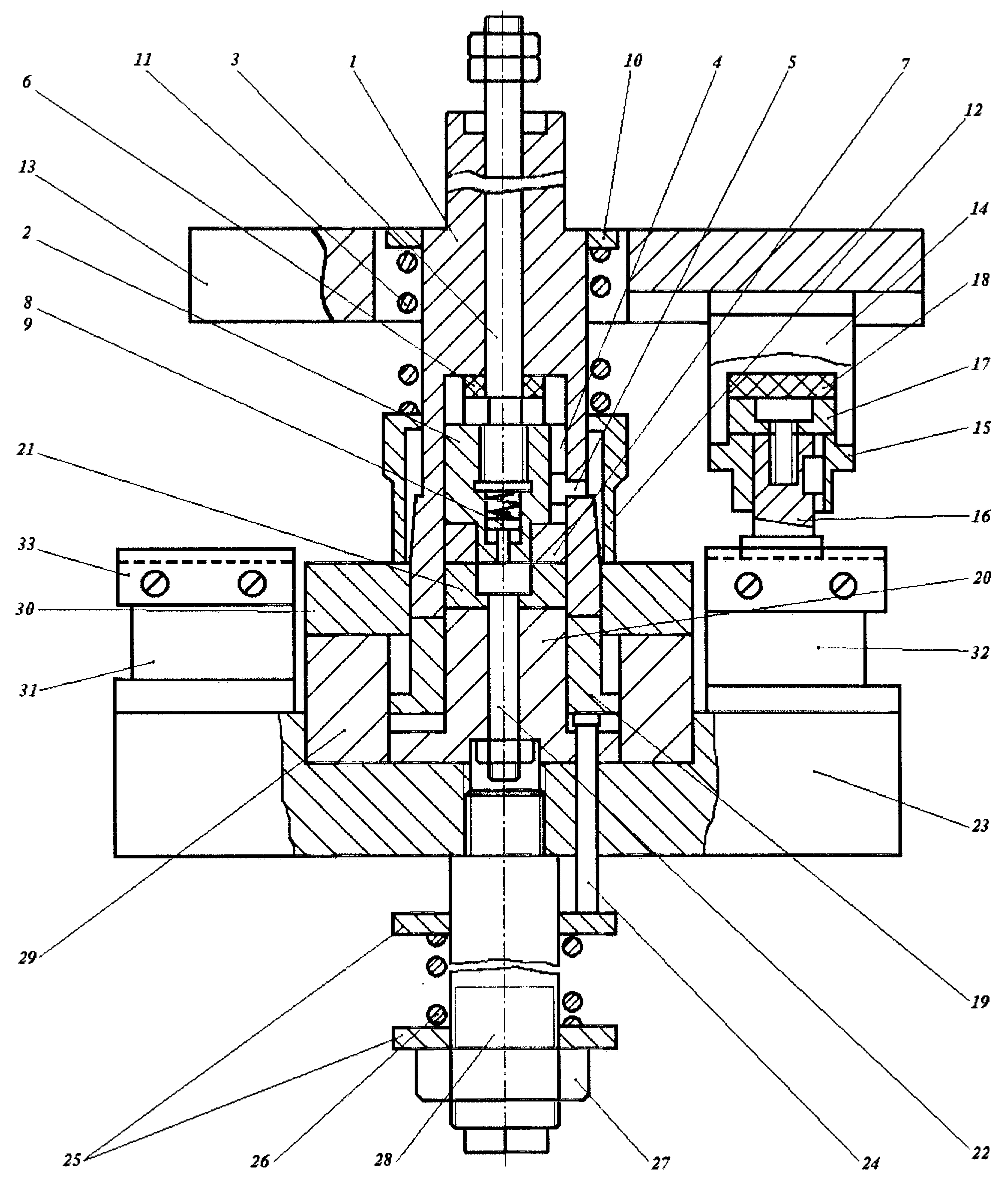 КОМБИНИРОВАННЫЙ ШТАМИ Полезная модель относится к области холодной обработки металлов давлением и может быть использована для изготовления вырубкой, вытяжкой, обрезкой, просечкой и нанесением линий ослабленного сечения полых изделий, например, колпачков, крышек и других конструктивно подобных им деталей из тонколистовых материалов, повышенной точности размеров и взаимного расположения поверхностей. Известен штамп совмещенного действия для изготовления полых деталей из листовых заготовок, содержащий подвижную плиту, несущую полую пуансон-матрицу и выталкиватель, а также неподвижную плиту, на которой установлены вырубная матрица, полый прижим и пуансон (см. Мешерин В.Т. Листовая штамповка. Атлас схем.- М.: Машиностроение, 1975, с. 42, рис. 69). Недостатком этого штампа является ограниченные технологические возможности. Это обусловлено тем, что штамп позволяет выполнить только две операции: вырубку заготовки и вытяжку полой детали. Известен также комбинированный штамп для вырубки, вытяжки и пробивки полых деталей, содержащий телескопически размещенные в его подвижной верхней части вырубную пуансон-матрицу, закрепленную в пуансонодержателе, и пробивной пуансон, а также установленные соосно им в нижней неподвижной части вырубную матрицу, прижим, вытяжной пуансон с осевым отверстием (см. Кайзер Э. Вырубные гибочные и вытяжные штампы. - М.-Л., 1961, с. 278, фиг. 238). Однако с помощью известного штампа невозможно за один рабочий ход осуществить одновременно операции вырубки, вытяжки и обрезки . Это снижает технологические возможности устройства. 2000127185 иррррнрщлщ МПКВ2Ш37/08 тяжки и пробивки полых деталей, содержащий телескопически размещенные в его подвижной верхней части вырубную пуансон-матрицу, закрепленную в пуансонодержателе, и пробивной пуансон, а также установленные соосно им в нижней неподвижной части вырубную матрицу, прижим, вытяжной пуансон с осевым отверстием. С целью увеличения глубины вытяжки и одновременного осуществления всех операций за один рабочий ход комбинированный штамп снабжен дополнительной вытяжной матрицей, расположенной на нерабочем участке внутренней поверхности вырубной пуансон-матрицы, дополнительным прижимом, установленным в верхней части концентрично пробивному пуансону внутри дополнительной матрицы, и дополнительной пуансон-матрицей, размещенной в полости указанного пуансона. При этом последний установлен с возможностью осевого перемещения под действием дополнительной матрицы, пуансон и прижим снабжены механизмами регулировки усилия вытяжки, а пробивной пуансон жестко закреплен в пуансонодержателе (см. авт. свид. СССР JV 963620, МПК В 2ID 37/08, опубл. 07.10.1982г. ,бюл.№ 27). Недостатком известного щтампа является невозможность за один рабочий ход осуществить одновременно операции вырубки, вытяжки, обрезки , просечки и нанесения линий ослабленного сечения, что также снижает технологические возможности установки. Кроме того, известный комбинированный штамп не переналаживаем на другие детали. Задачей, на решение которой направлена предлагаемая полезная модель, является повышение технологических возможностей за счет осуществления операций вырубки, вытяжки, обрезки, просечки и нанесения линий ослабленного сечения за один рабочий ход и получение возможности переналадки на другие детали. Поставленн