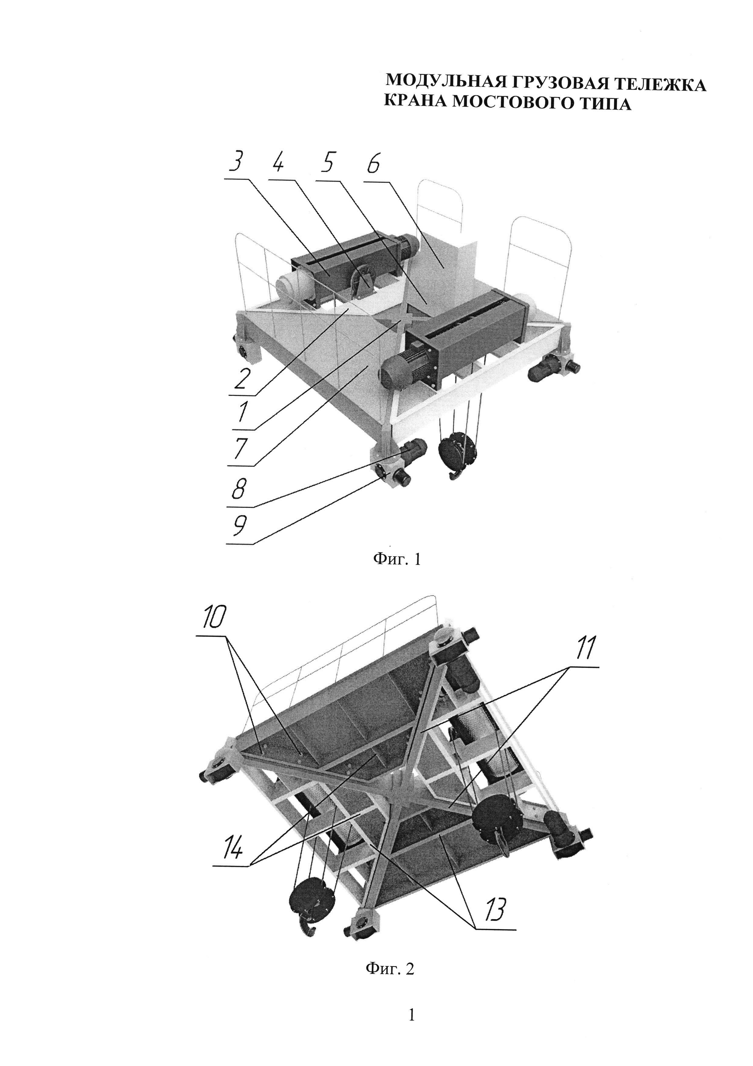 Модульная грузовая тележка крана мостового типа, содержащая два механизма подъема, металлоконструкцию рамы, опирающуюся на колесные блоки, с помощью которых вся конструкция может перемещаться с грузом по ходовому пути вдоль металлоконструкции крана, отличающаяся тем, что рама тележки состоит из четырех отдельных сегментных модулей, которые закрепляются на центральном Х-образном звене при помощи болтовых соединений, причем каждый сегментный модуль вместе с размещенными на нем элементами представляет собой отдельную сборочную единицу.