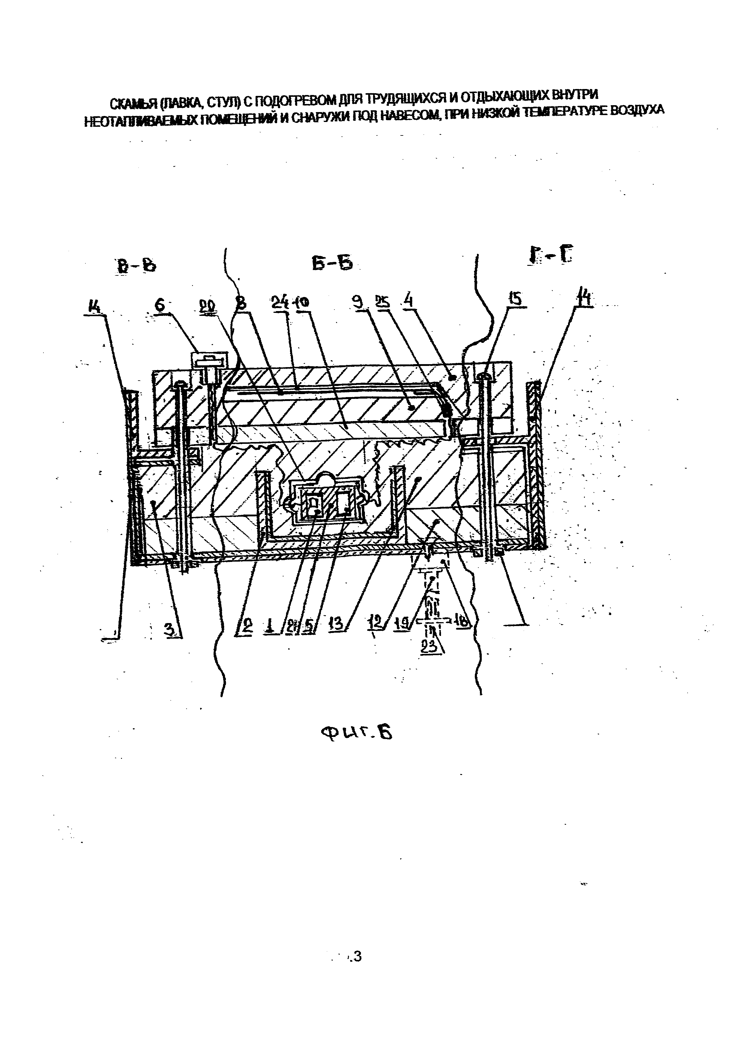 Полезная модель относится к гигиене труда и отдыха и может быть использована для повышения производительности труда и повышения комфорта условий труда и отдыха, при пониженной температуре воздуха, во многих областях техники.Недостатком известных устройств является низкий процент тепловой энергии, идущей на обогрев человека, большая потребляемая мощность, большой расход электроэнергии, высокая стоимость.Сущность предлагаемой полезной модели в том, что повышение температуры площади соприкосновения нагреваемого элемента до комфортной, осуществляется только во время нахождения человека на посадочном месте этой полезной модели, при температуре ниже установленной на термореле и включенной на обогрев выключателями, установленными на поверхности нагреваемой доски.Повышение количества тепловой энергии, направленной на обогрев человека, уменьшение теплопотерь нагревательного элемента, уменьшение мощности, уменьшение потребляемой электроэнергии, повышение безопасности, уменьшение стоимости комплектующих - эти задачи решены при создании предлагаемой полезной модели.Предлагаемое устройство, которое выполнено в виде скамьи для работающих и отдыхающих внутри неотапливаемых помещений и снаружи под навесом изготовлено с использованием нагреваемой доски из ДПК, в которую вмонтированы нагревающие элементы трех посадочных мест, с теплоотражающими пленками из вспененного полиэтилена снизу, внутри самой конструкции нагреваемой доски. Снизу нагреваемой доски смонтирована зона для теплоизолирующих материалов из страховочного короба. Снизу к нагреваемой доске, внутри страховочного короба, плотно прижаты два слоя утеплителя из базальтовой каменной ваты и экструдированного вспененного полистерола, накрытой пароизоляционной пленкой и вспененным полиэтиленом. Нагревательный элемент полностью теплоизолирован снизу. Весь тепловой поток энергии направится вверх.В качестве нагревающего элемента может быть установлен один из известных видов нагревательных элементов, использующих 24 В так и 220 В.Это низковольтный саморегулирующийся кабель или низковольтное перфорированное полотно, из карбоновых волокон и термопластика, соединенные с медными шинами на молекулярном уровне, шириной 17 см.На 220 В нагревательными элементами могут быть экранированный двухжильный кабель или тонкое, неперфорированное полотно, состоящее из карбоновых волокон и термопластика, соединенные с медными проводниками на молекулярном уровне, шириной 60 см, покрытое изолирующим покрытием и флисом.Для снижения статического напряжения от нагреваемого полотна каждого сидячего места полезной модели установлен слой токопроводящего клея с медной лентой внутри над нагревающим элементом в конструкции нагреваемой доски. Провод заземления, полезной модели, подключается к выводу медной ленты зажимными клеммами в конструкции нагреваемой доски 4, каждого посадочного места и изолируется битумной лентой.Нагревающий элемент к нагреваемой доске приклеивается на силиконовый, тепловодный герметик. Им же заливаются все пространства между греющими проводами для создания ровной плоской поверхности. К этой поверхности приклеиваются два слоя теплоотражающей пленки. Два провода выводятся через отверстия в ней и в закрывающей углубление тонкой доской, из ДПК, п