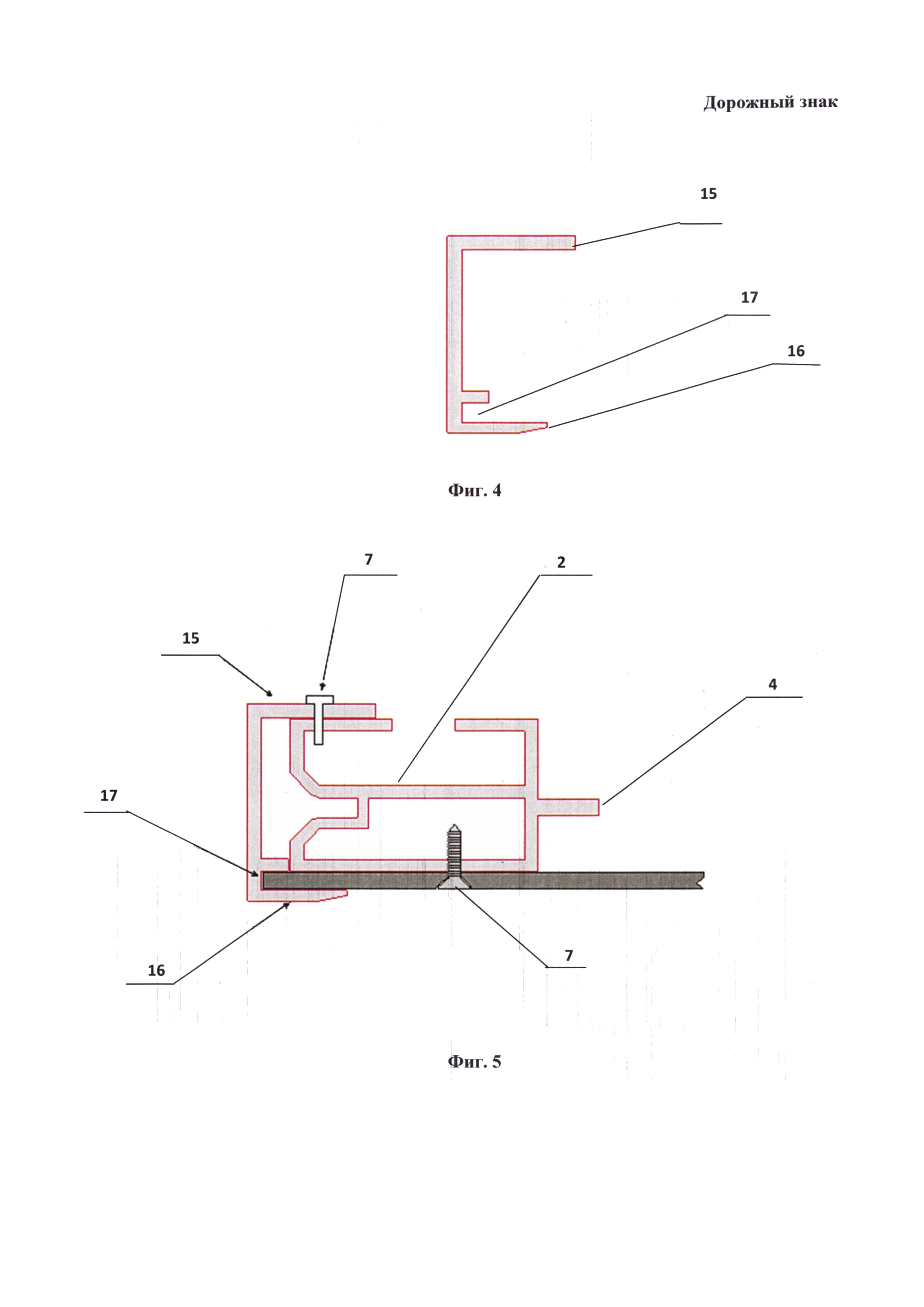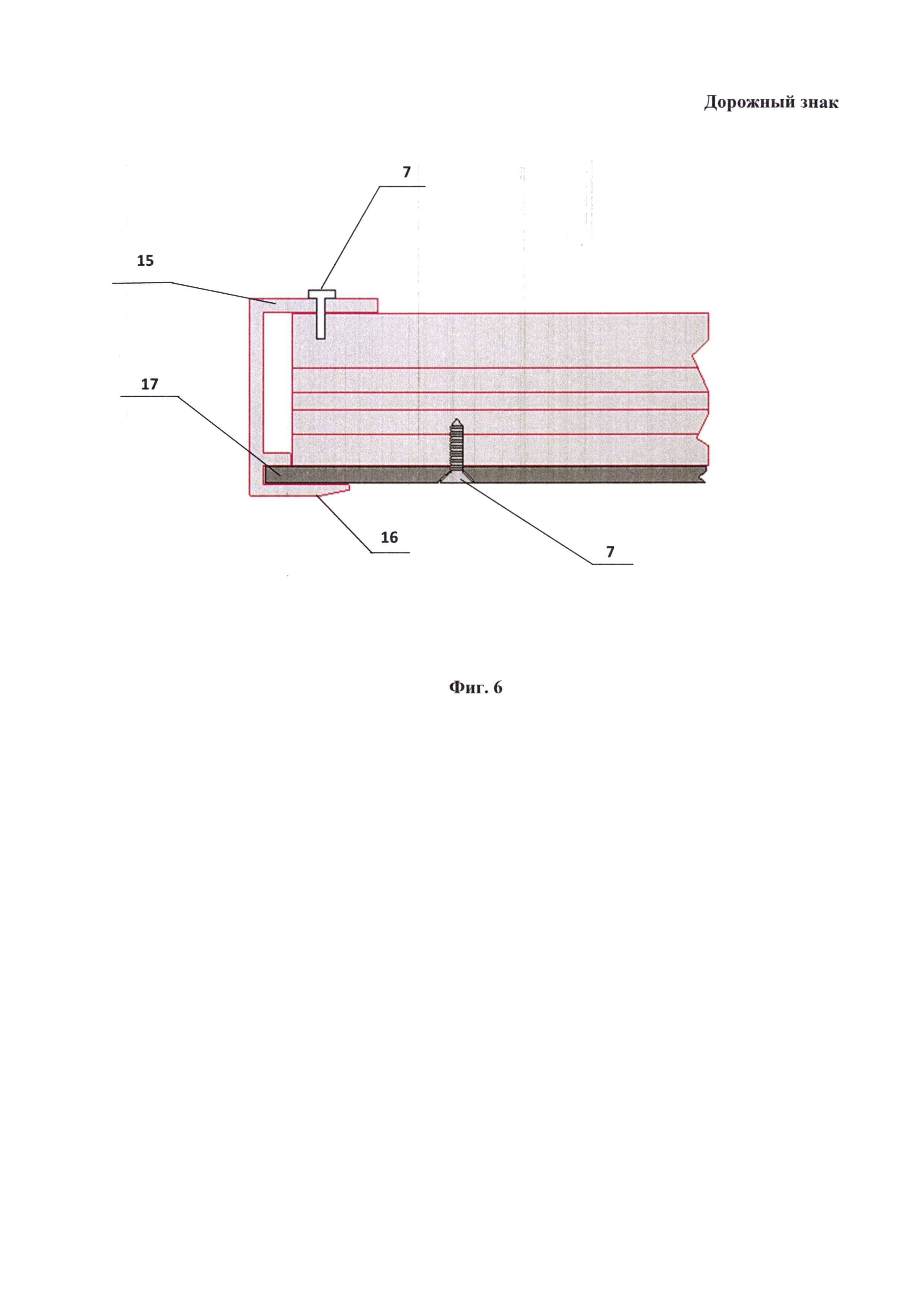 Полезная модель относится к дорожным знакам.Техническим результатом заявленной полезной модели является:- уменьшения массы (веса) дорожного знака;- возможность перемещения узла крепления по направляющим вдоль всего знака в место его соединения со стойкой дорожного знака;- исключение деформации изделия и возникновения точек напряженности;- упрощение монтажа знака;- увеличение срока службы;- повышение коррозийной стойкости;- повышение прочности (жесткости);- упрощение монтажных работ;- снижение нагрузок на несущие элементы;- повышение эксплуатационных характеристик;- сокращение энергозатрат.- создание системы взаимосвязанных компонентов из алюминия для производства всех видов и типоразмеров дорожных знаков.Дорожный знак включает основу знака с внутренней и внешней сторонами, профилированный несущий элемент и окантовочный профилированный элемент из алюминия, основа знака изготовлена из композитного алюминиевого листа, профилированный несущий элемент из алюминия представляет собой фигурный элемент с продольным пазом и поперечной перемычкой - ребром жесткости, на одной стороне вдоль профилированного несущего элемента из алюминия имеется ребро - шип, а на другой - паз, окантовочный профилированный элемент из алюминия имеет Е-образную форму, между сторонами окантовочного профилированного элемента из алюминия имеется ребро, образующее паз для фиксации лицевой композитной панели. 6 ил.