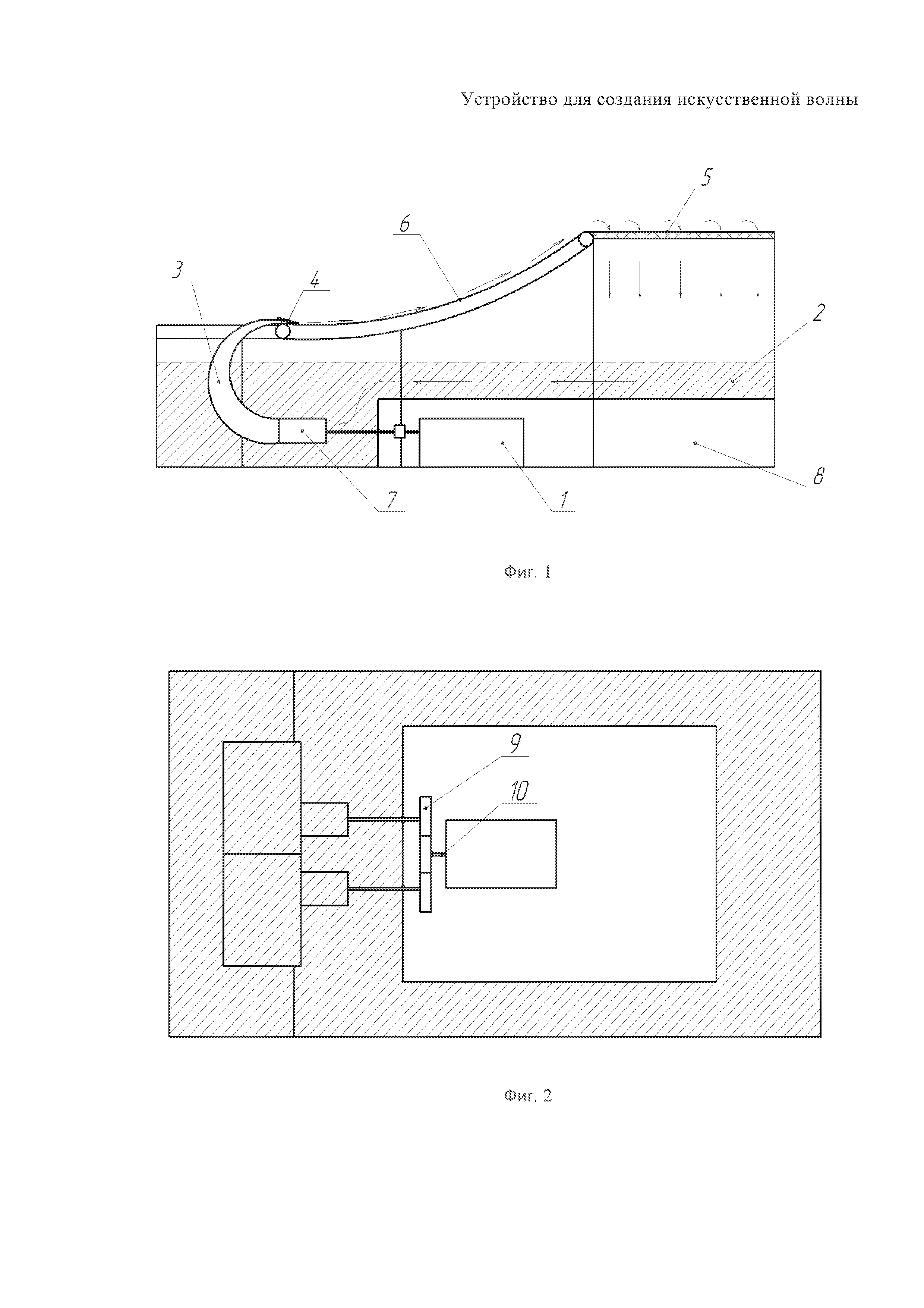1. Устройство для создания искусственной волны, содержащее емкость для воды переменной глубины, образованную разборным стальным каркасом, эластичную рабочую поверхность, дренажные решетки, установленные над емкостью для воды в верхней и нижней части устройства, устройство для нагнетания воды, расположенное внутри емкости для воды, соединенное с приспособлением для транспортировки воды, отличающееся тем, что в качестве приводного устройства нагнетателя воды используется генератор, расположенный под емкостью для воды, а для перемещения воды применяется С-образное сопло, перед выходным отверстием которого установлена прижимная пластина. 2. Устройство для создания искусственной волны по п. 1, отличающееся тем, что емкость для воды выполнена Г-образной формы в продольном сечении. 3. Устройство для создания искусственной волны по п. 1, отличающееся тем, что емкость для воды выполнена О-образной в поперечном сечении. 4. Устройство для создания искусственной волны по п. 1, отличающееся тем, что нагнетатель соединен с двигателем через систему валов и редуктора. 5. Устройство для создания искусственной волны по п. 1, отличающееся тем, что в качестве двигателя используется дизельный генератор. 6. Устройство для создания искусственной волны по п. 1, отличающееся тем, что в качестве двигателя используется электрогенератор. 7. Устройство для создания искусственной волны по п. 1, отличающееся тем, что разборный стальной каркас содержит мягкие эластичные борта.