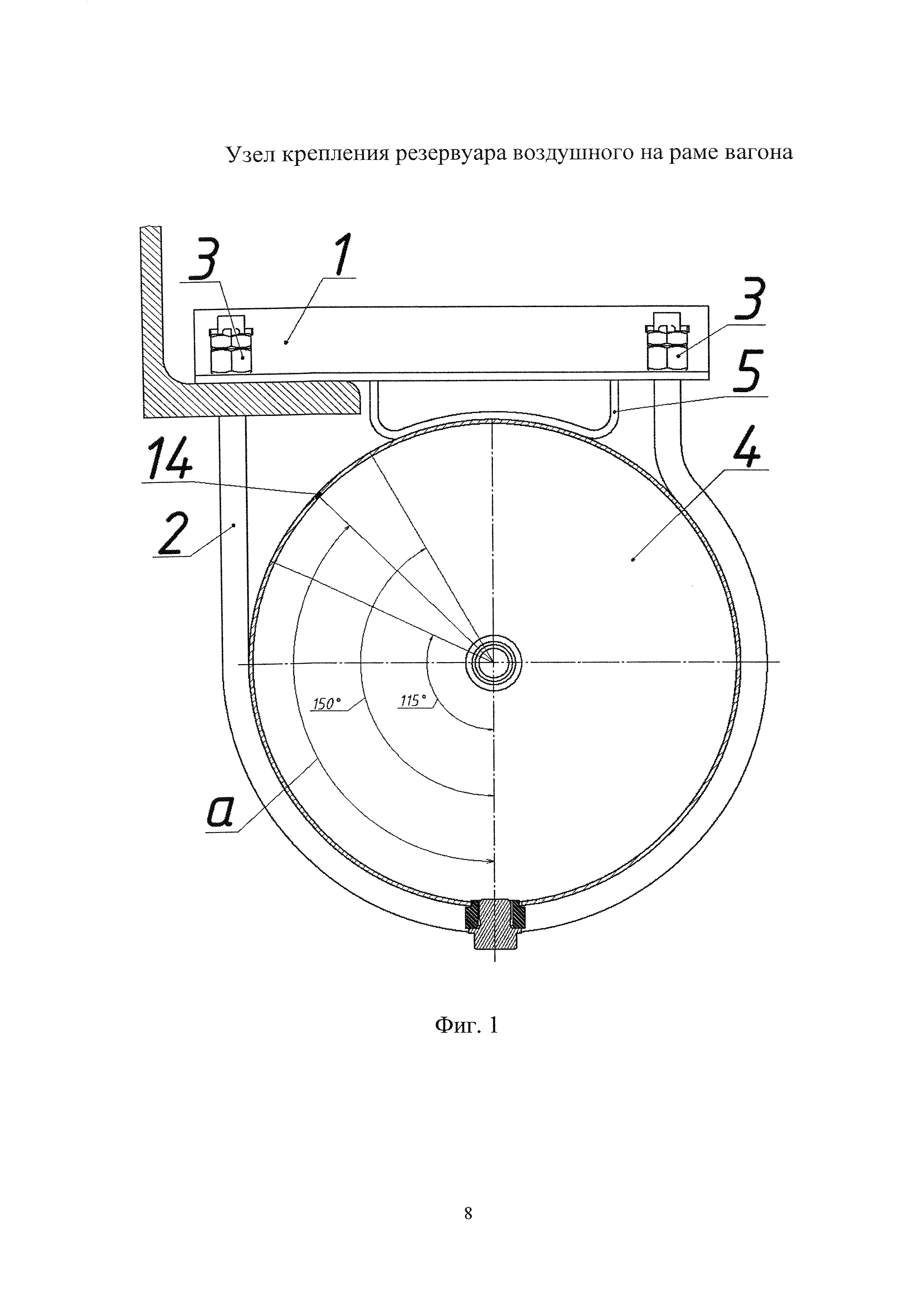 Узел крепления резервуара воздушного на раме вагона, содержащий ложемент, имеющий скругление в месте перехода вертикальной стенки в опорную дугообразную поверхность, крепежные хомуты, закрепленные на раме вагона посредством крепежных элементов, при этом каждый крепежный хомут выполнен из прута в виде дуги с располагающимися параллельно друг другу концами, направленными в одну сторону и имеющими резьбу, также один конец крепежного хомута выполнен прямым, а другой имеет радиусный перегиб, при этом резервуар воздушный закреплен на ложементе снизу рамы вагона таким образом, что штуцер обечайки резервуара воздушного направлен вертикально вниз, отличающийся тем, что радиус скруглений ложемента в месте перехода вертикальной стенки в опорную поверхность выполнен в пределах от 12 до 18 мм, при этом ширина ложемента составляет не более половины наружного диаметра резервуара воздушного, расстояние между прямым концом крепежного хомута и вертикальной стенкой ложемента составляет не менее четверти наружного диаметра резервуара воздушного, а продольный сварной шов обечайки резервуара воздушного расположен в промежутке между прямым концом крепежного хомута и ложементом, вместе с этим, угол в поперечном сечении резервуара воздушного между осью штуцера обечайки резервуара воздушного и серединой продольного сварного шва обечайки резервуара воздушного составляет интервал от 115 до 150°.